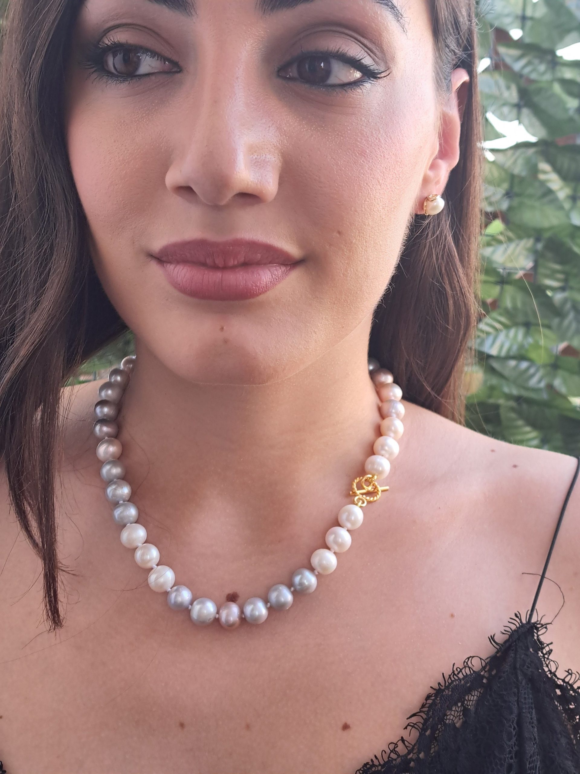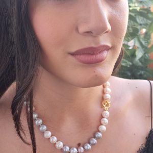 Collana girocollo perle bianche, grigio e rosa con argento 925 placcato oro, gioielli italiani