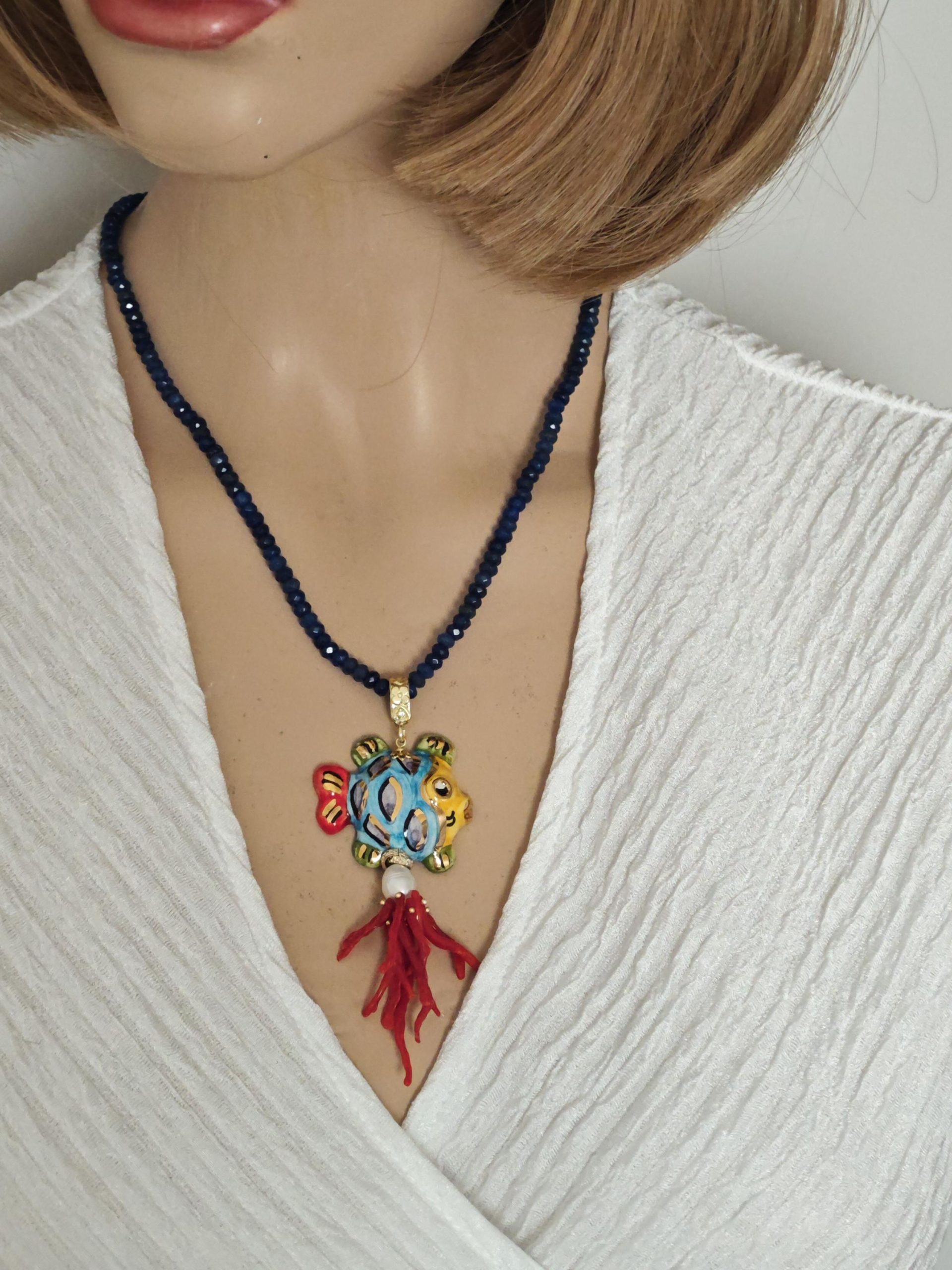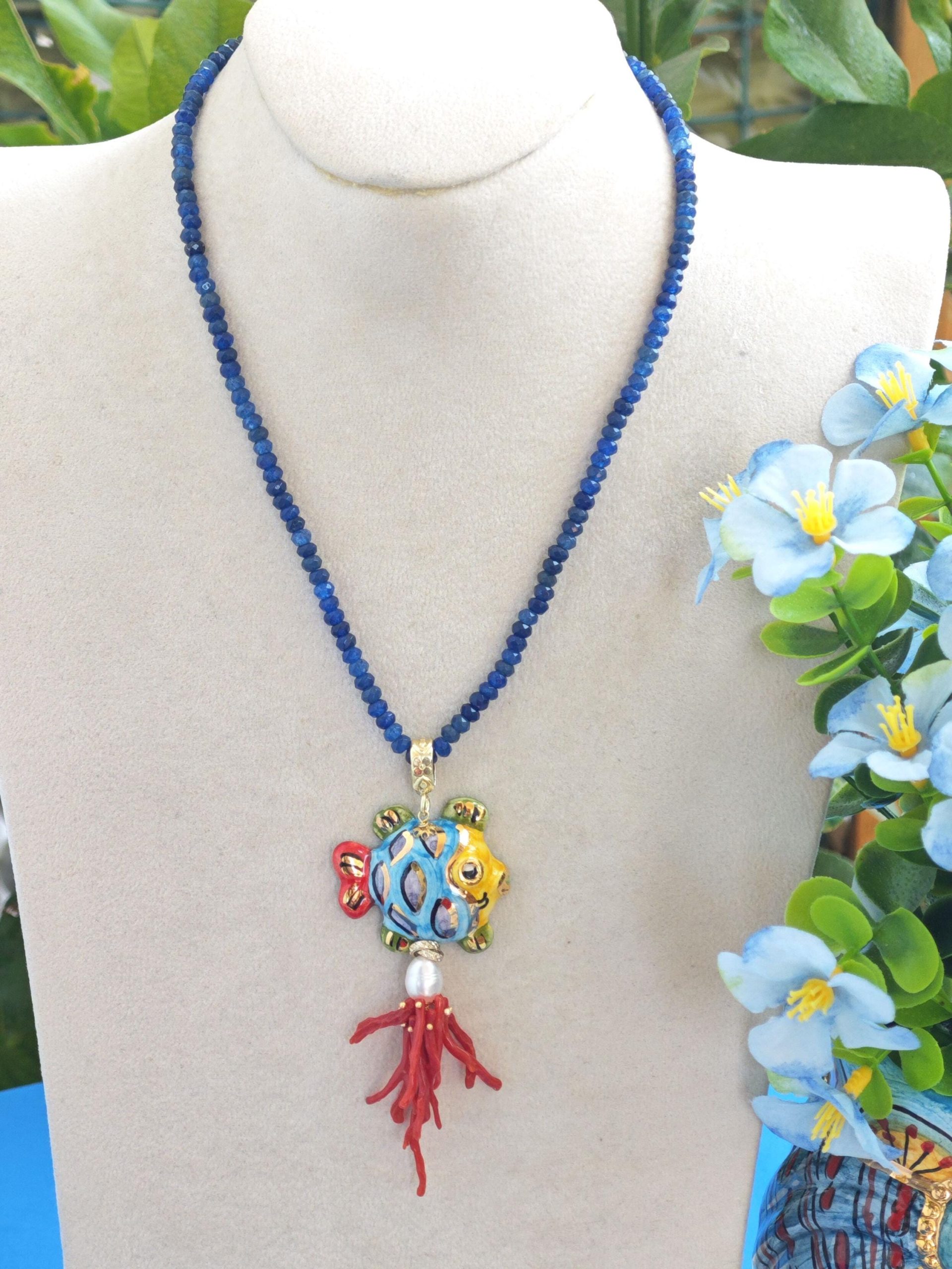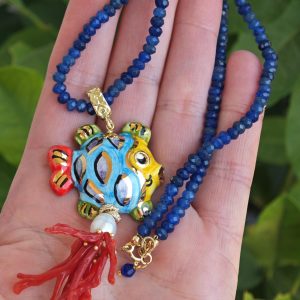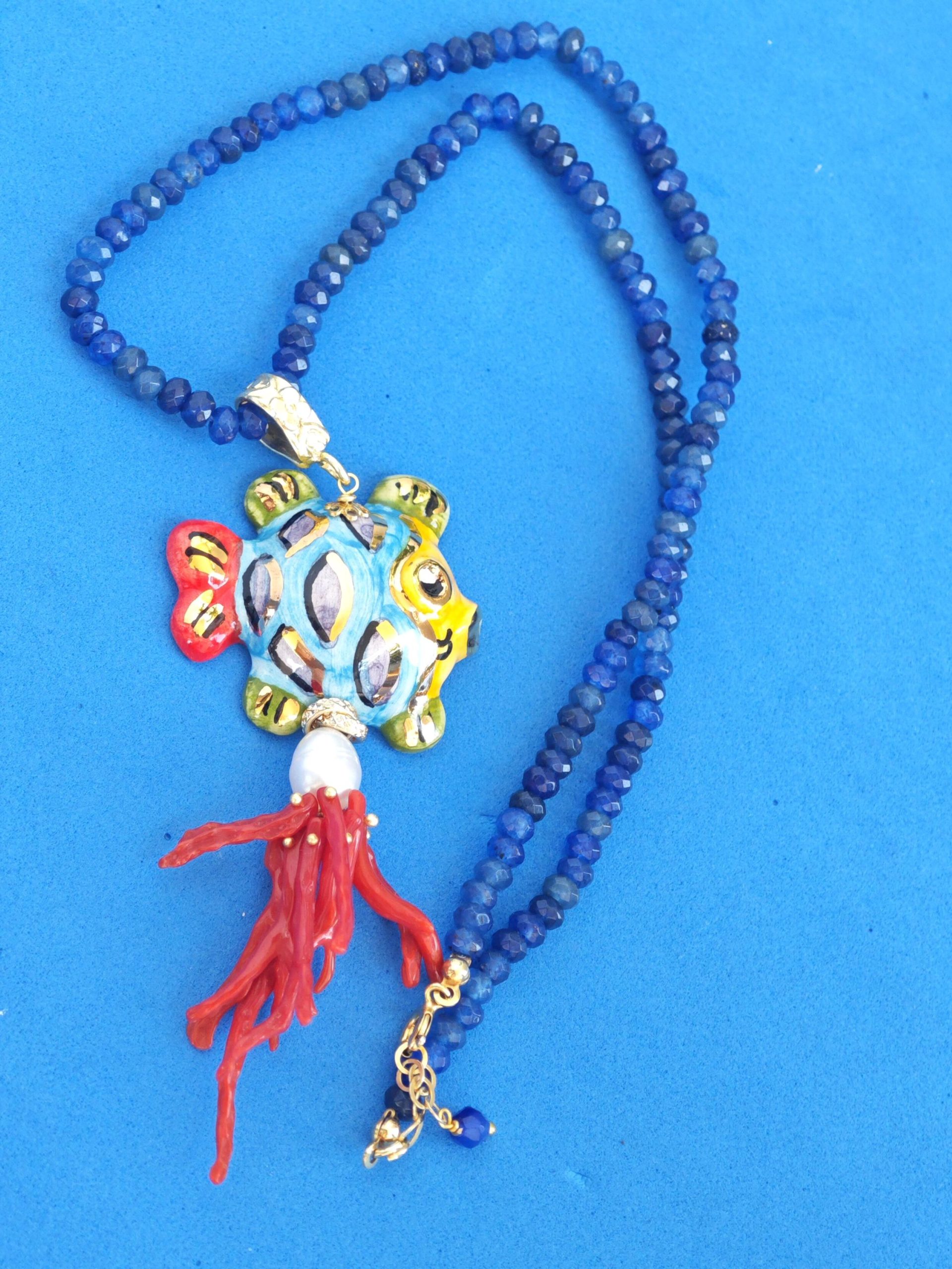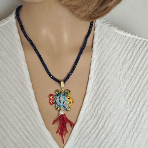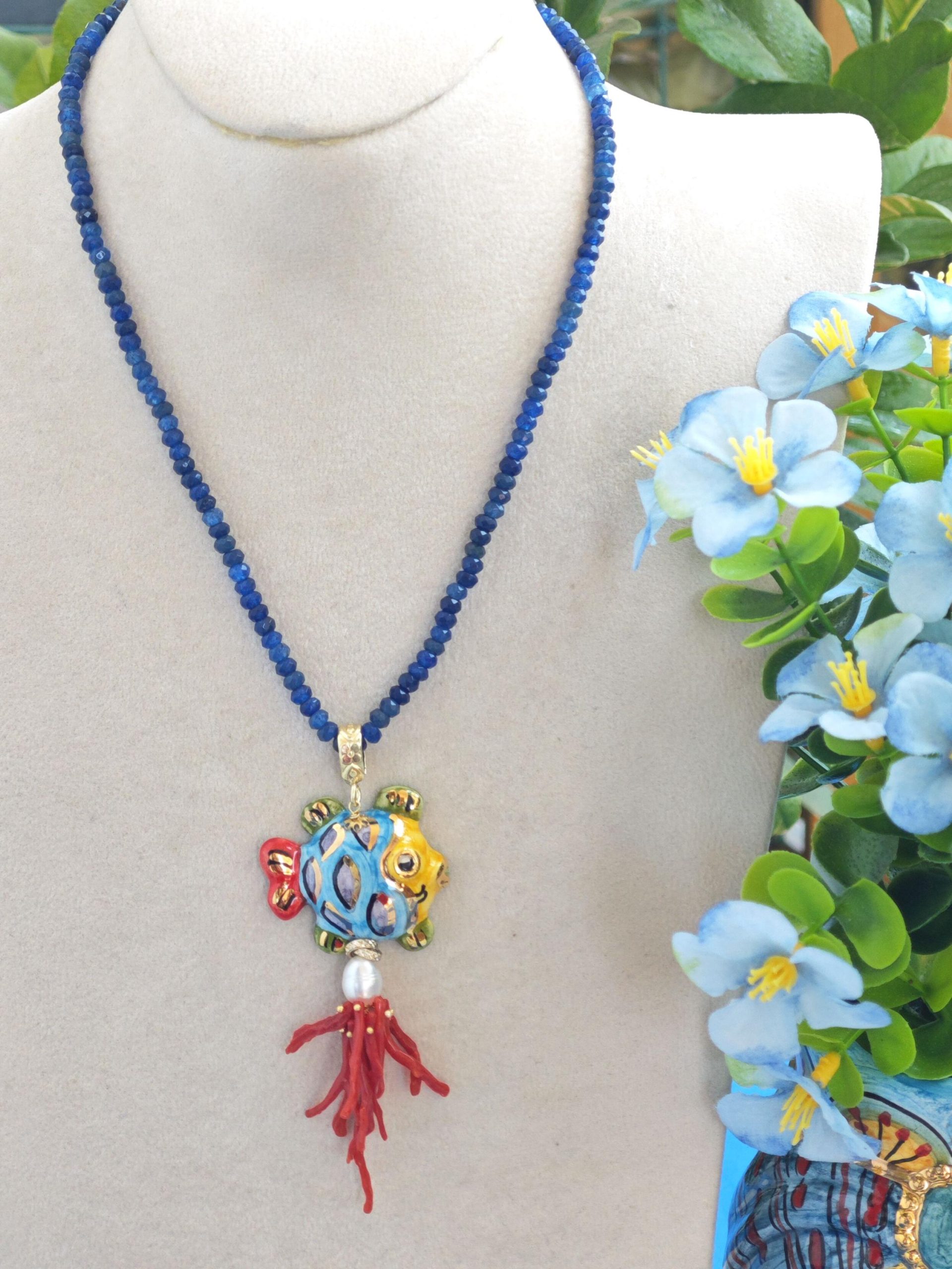 Collana girocollo pietre agata blu con pesce in ceramica Caltagirone e corallo rosso mediterraneo, collana siciliana