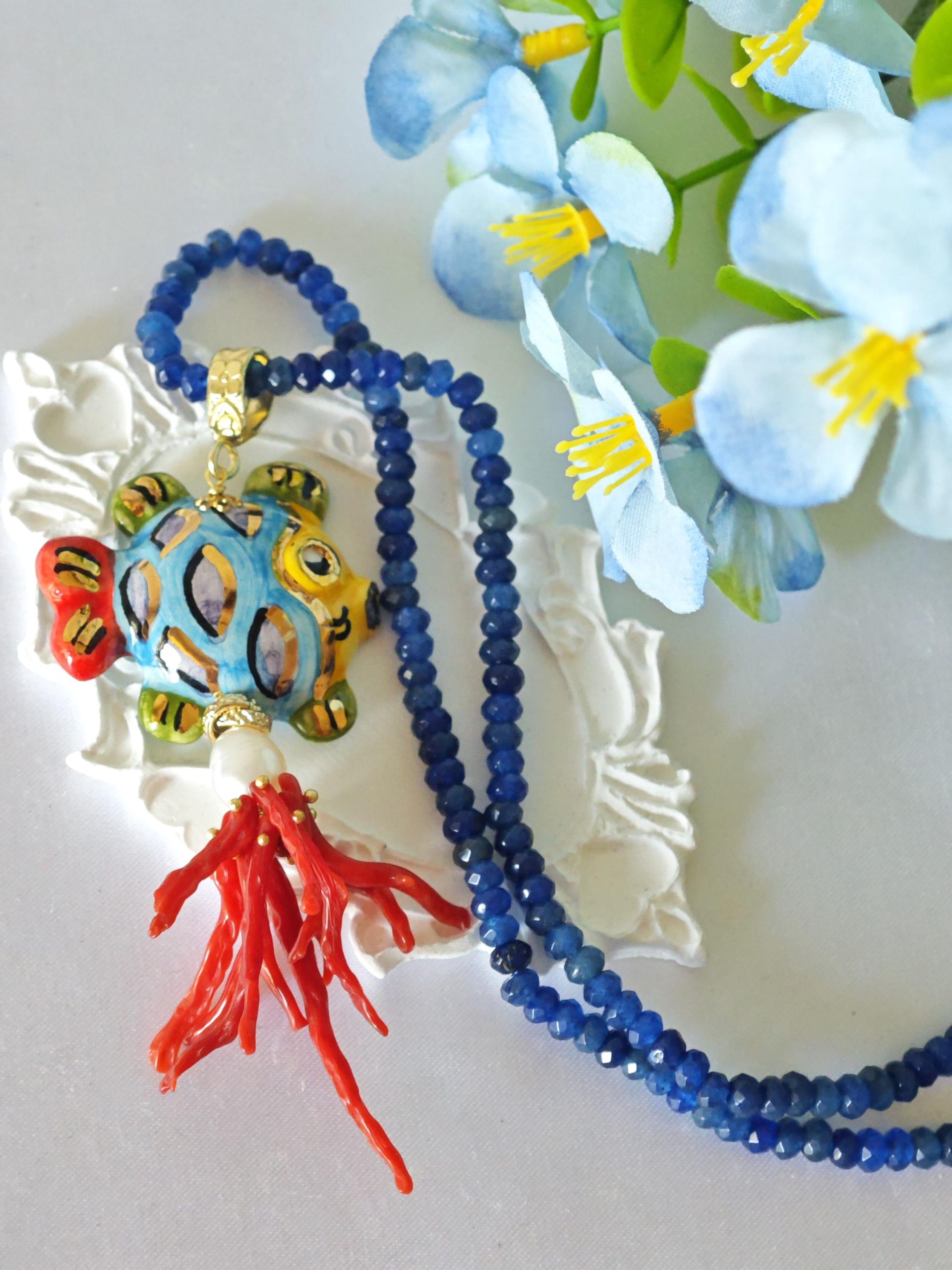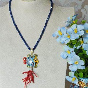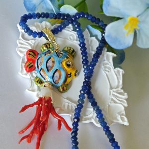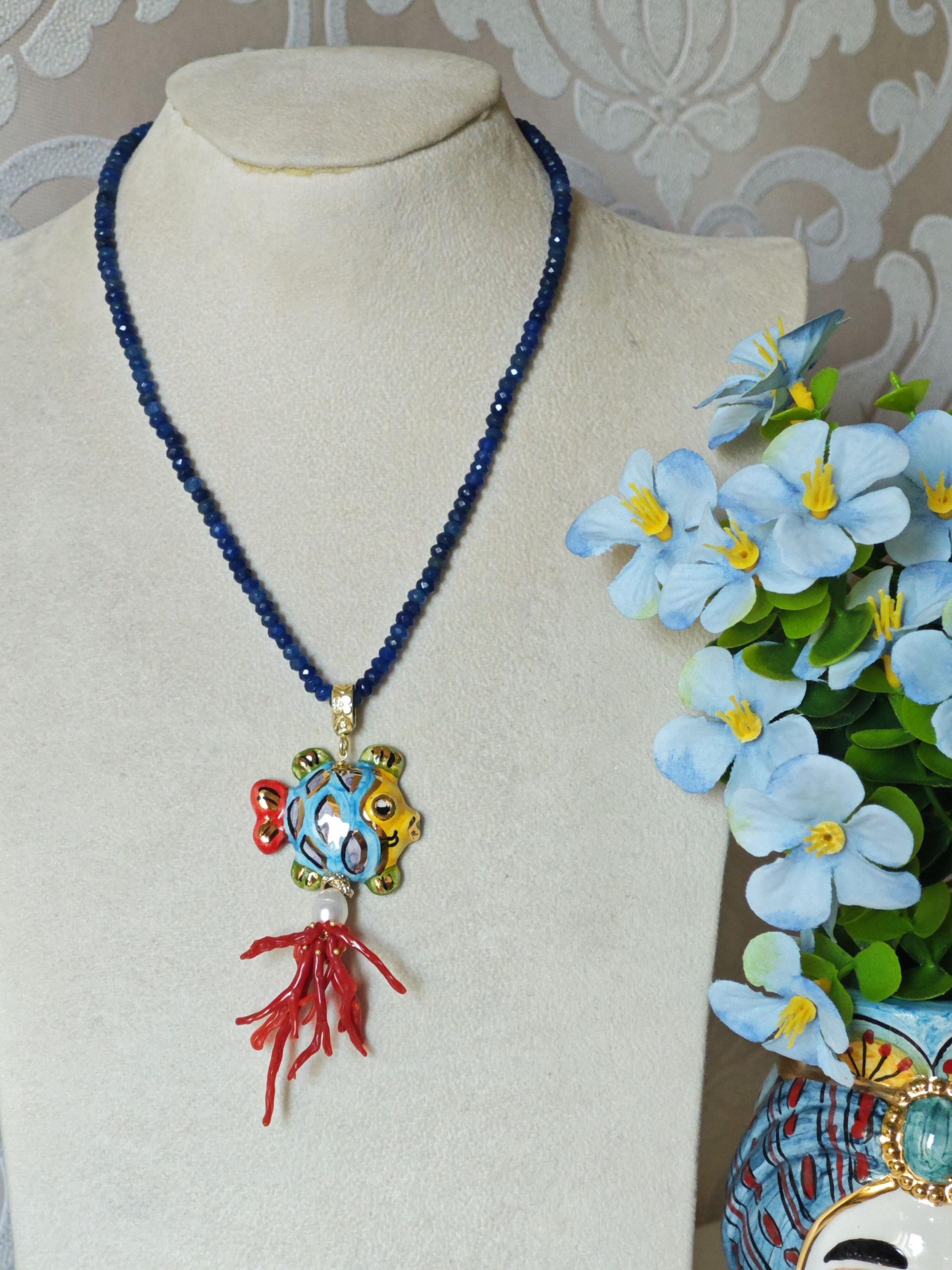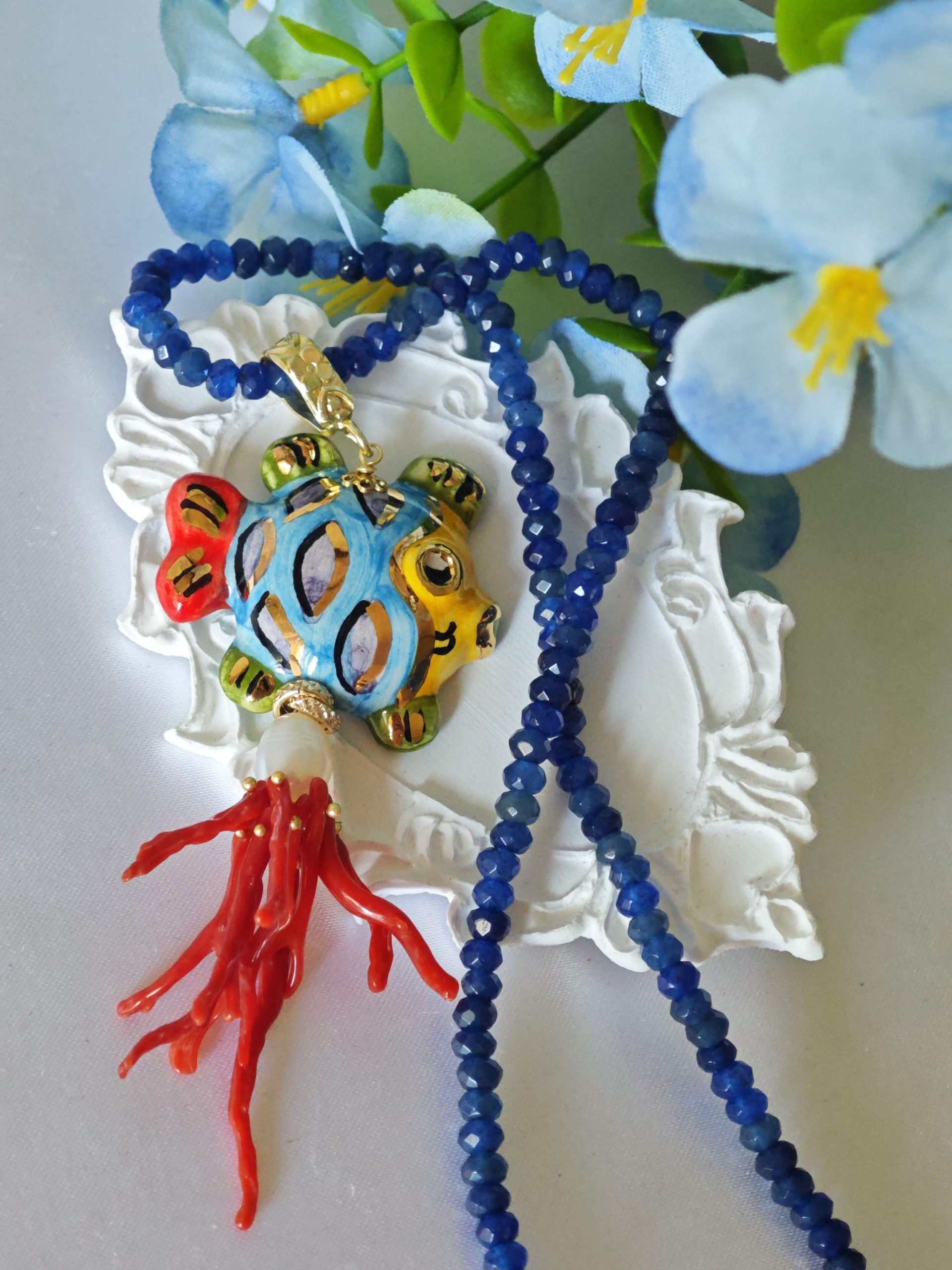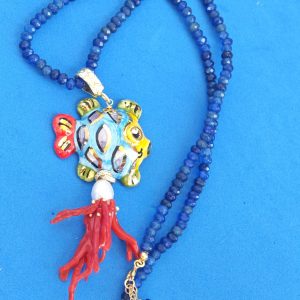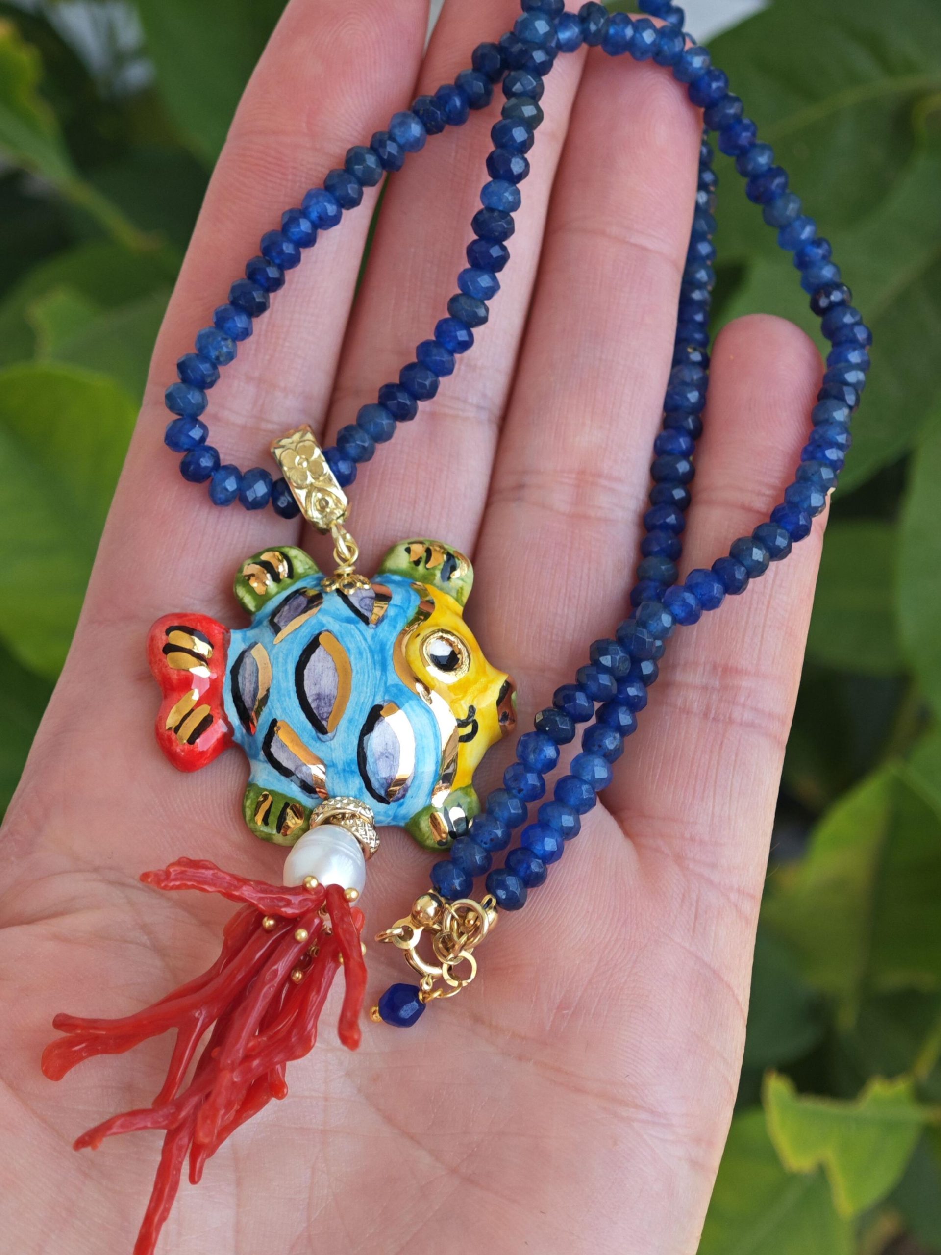 Collana girocollo pietre agata blu con pesce in ceramica Caltagirone e corallo rosso mediterraneo, collana siciliana