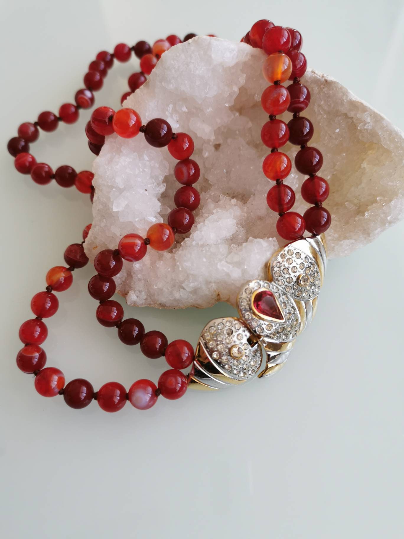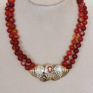 Collana girocollo a 2 fili annodata a mano con pietre dure agata rossa del Brasile , chiusura a clip vintage anni,’80 in metallo placcato oro con cristalli bianchi e rosso. 6×2,5 cm dimensioni.