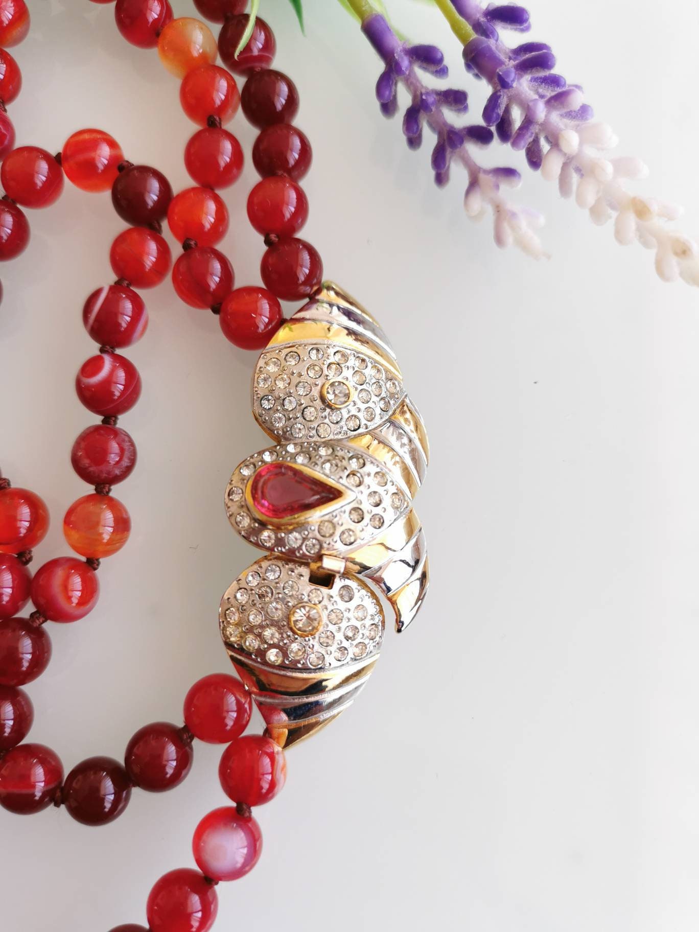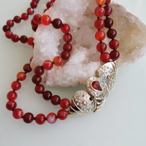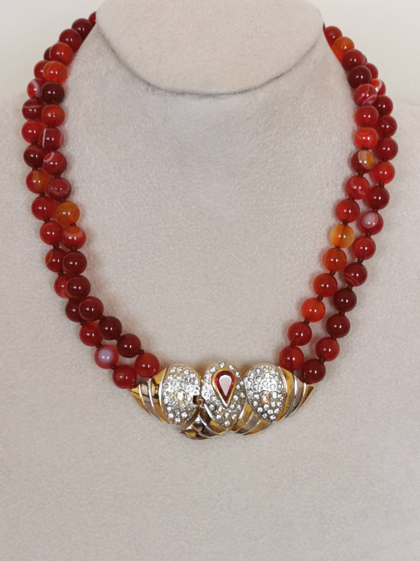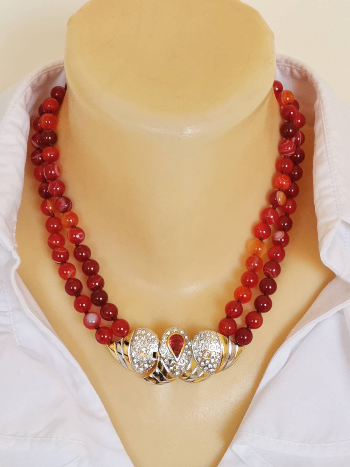 Collana girocollo pietre dure agata rossa e chiusura gioiello vintage, collana a 2 fili