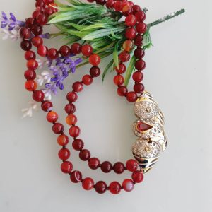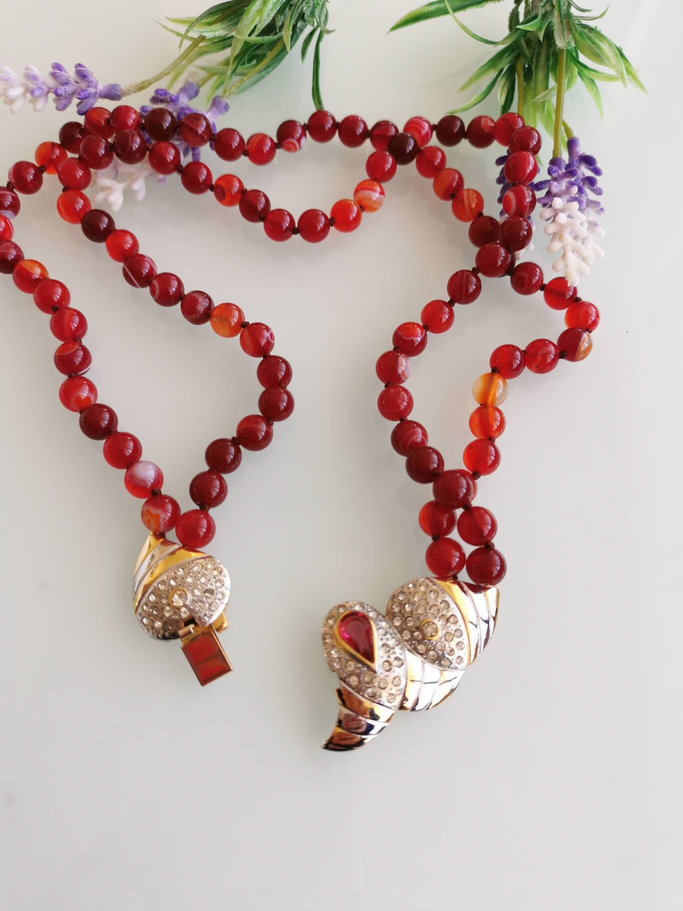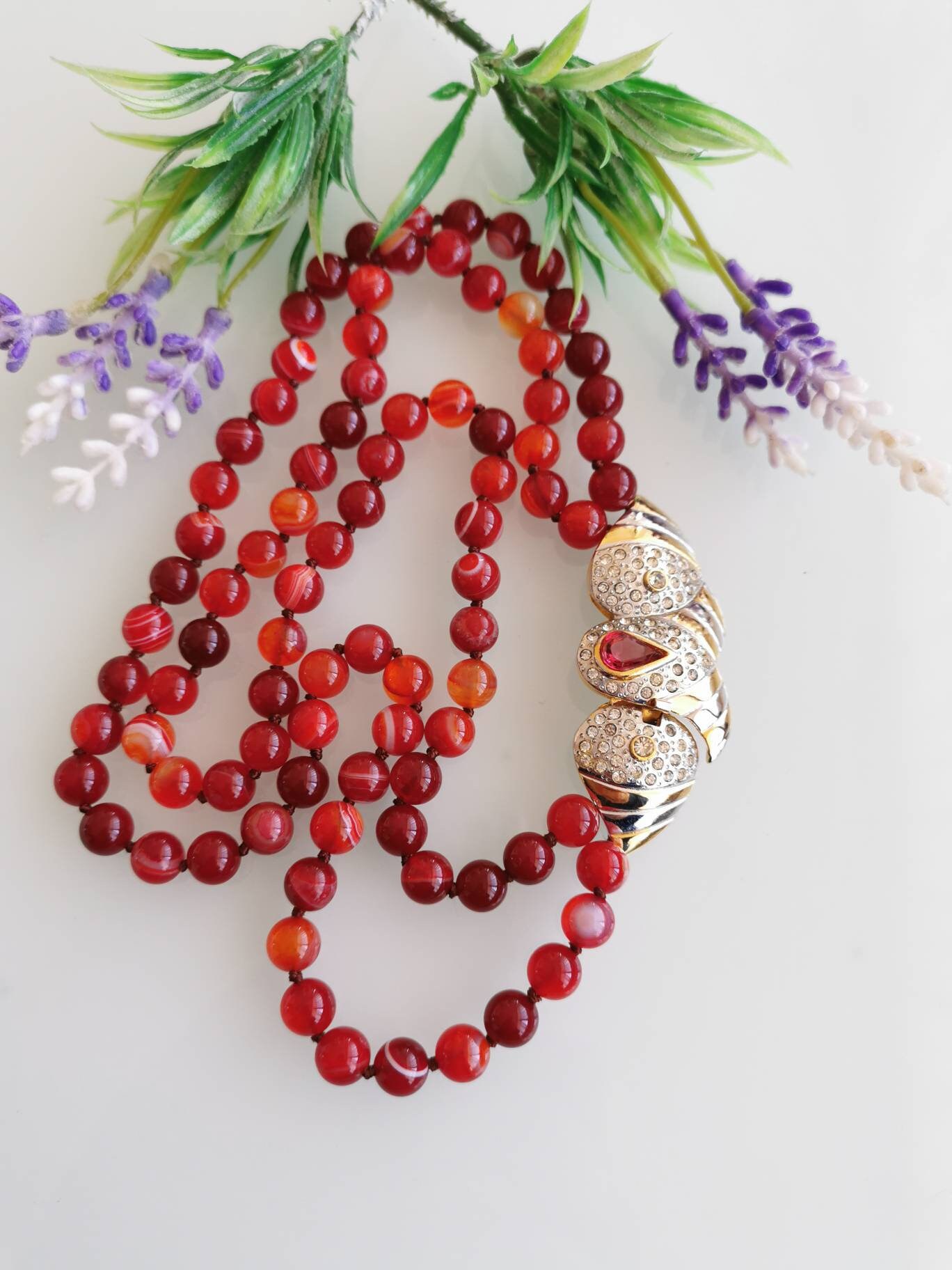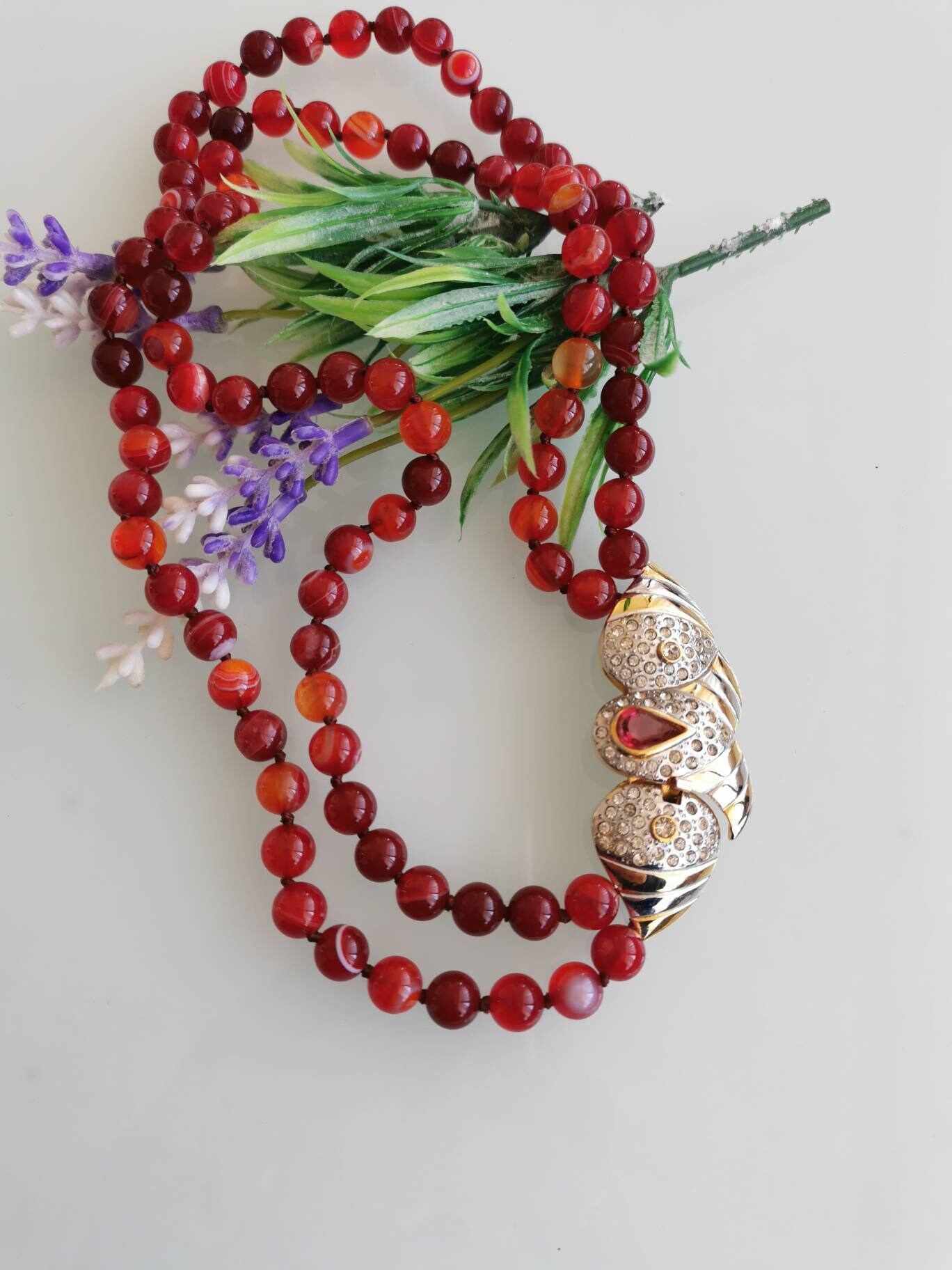Collana girocollo pietre dure agata rossa e chiusura gioiello vintage, collana a 2 fili
