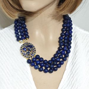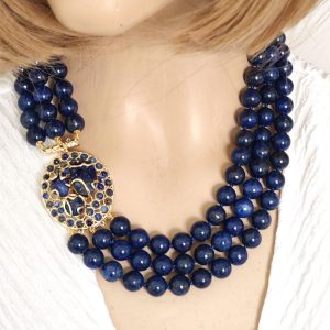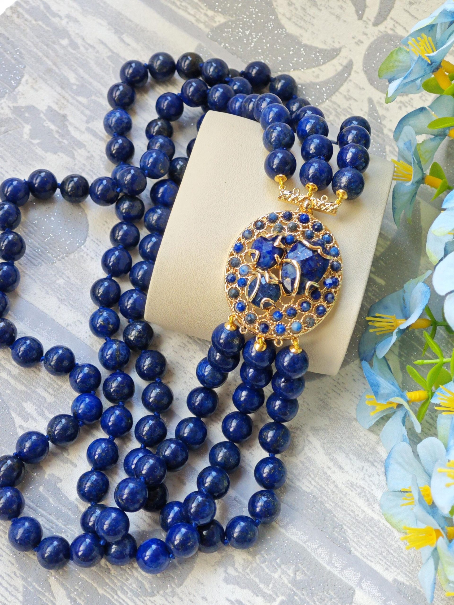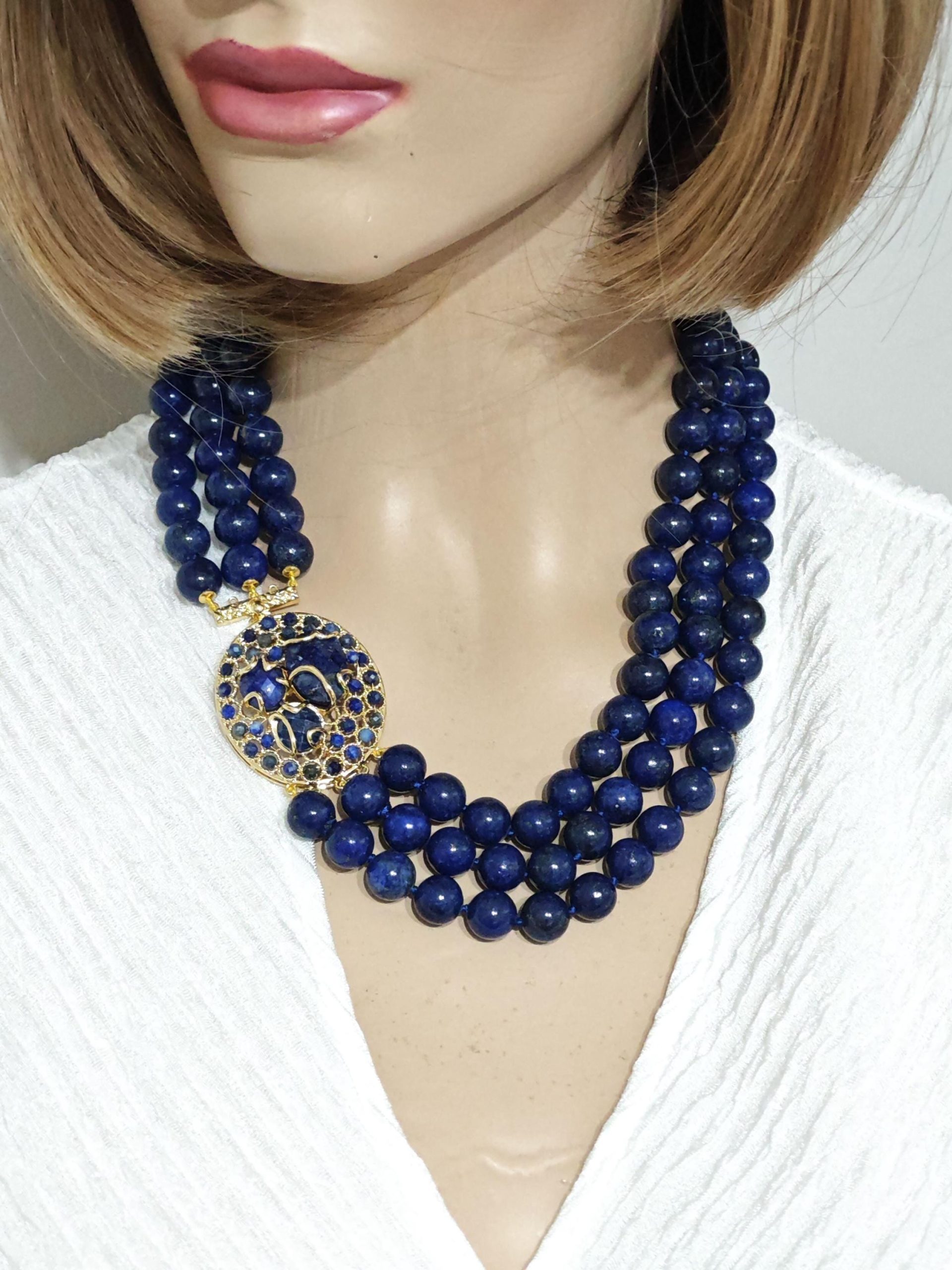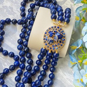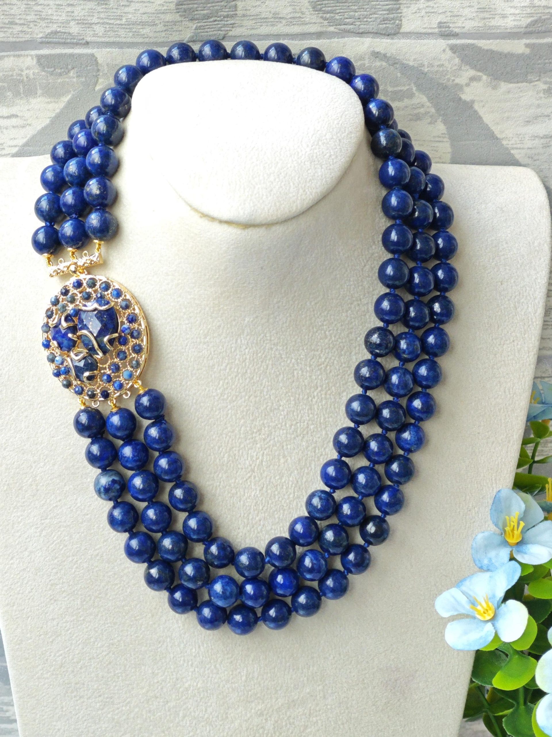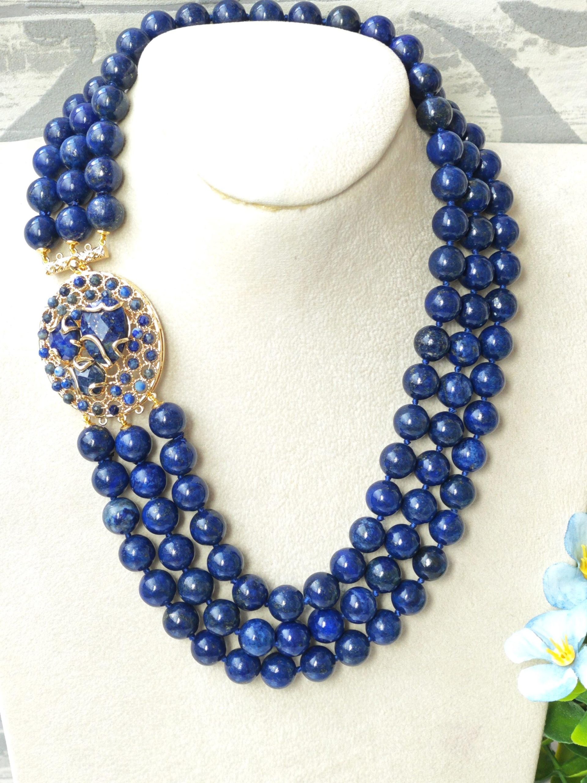 Collana artigianale girocollo a 3 fili annodata a mano con pietre dure lapislazzuli blu 8 mm con chiusura laterale in ottone dorato con pietre incastonate lapislazzuli.