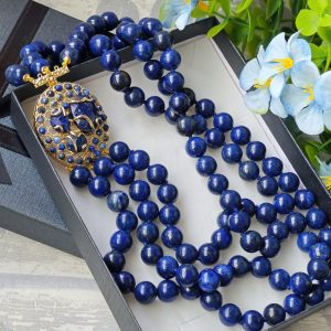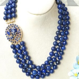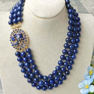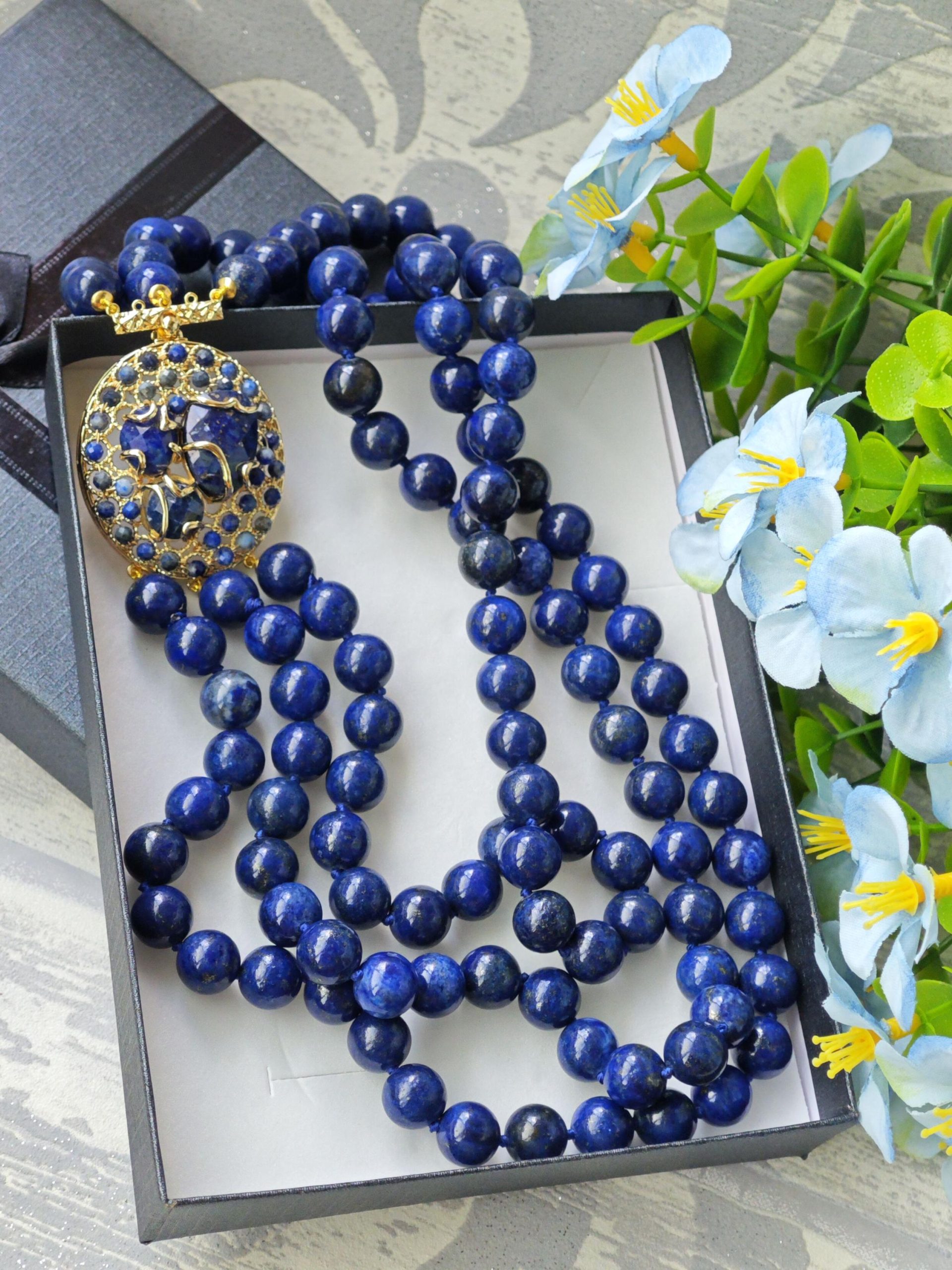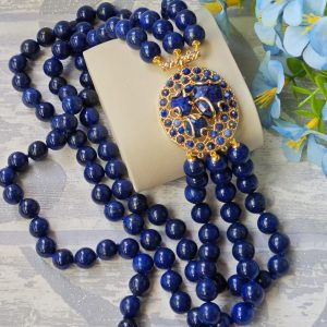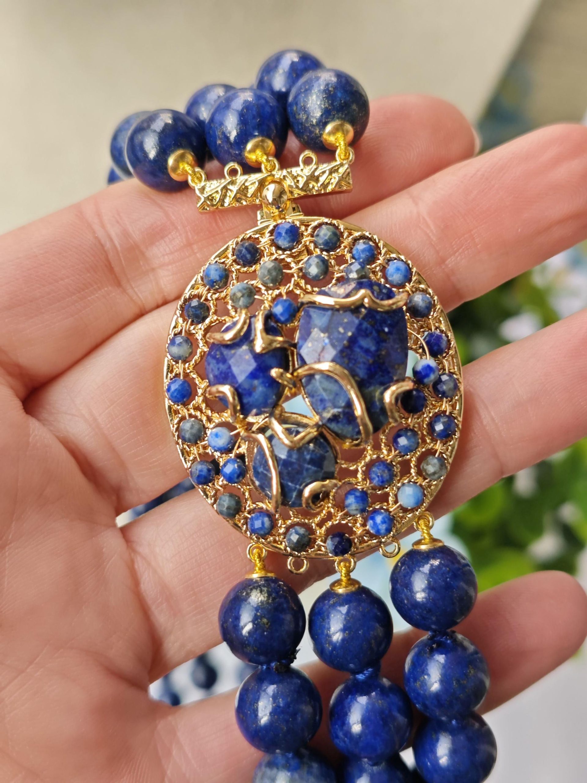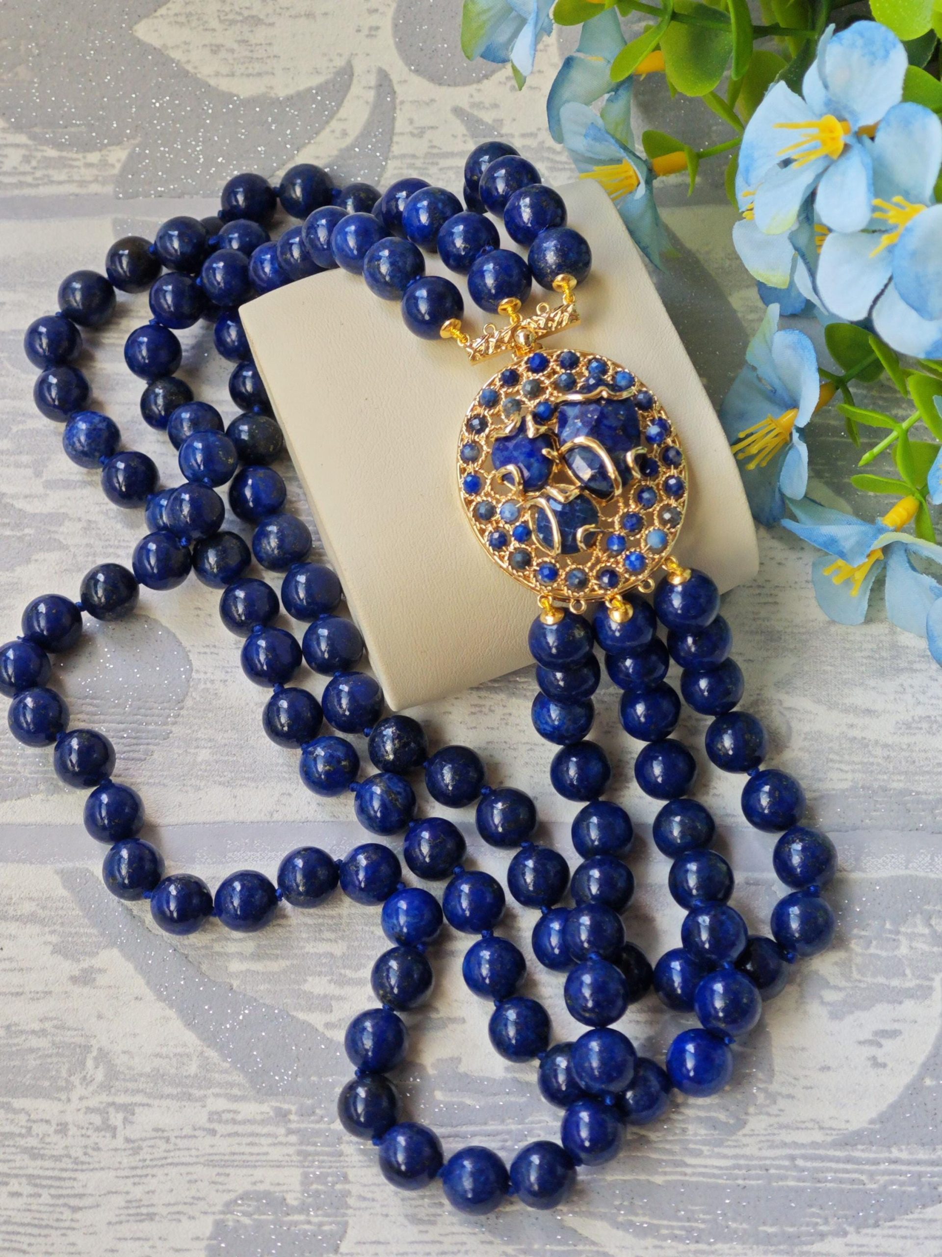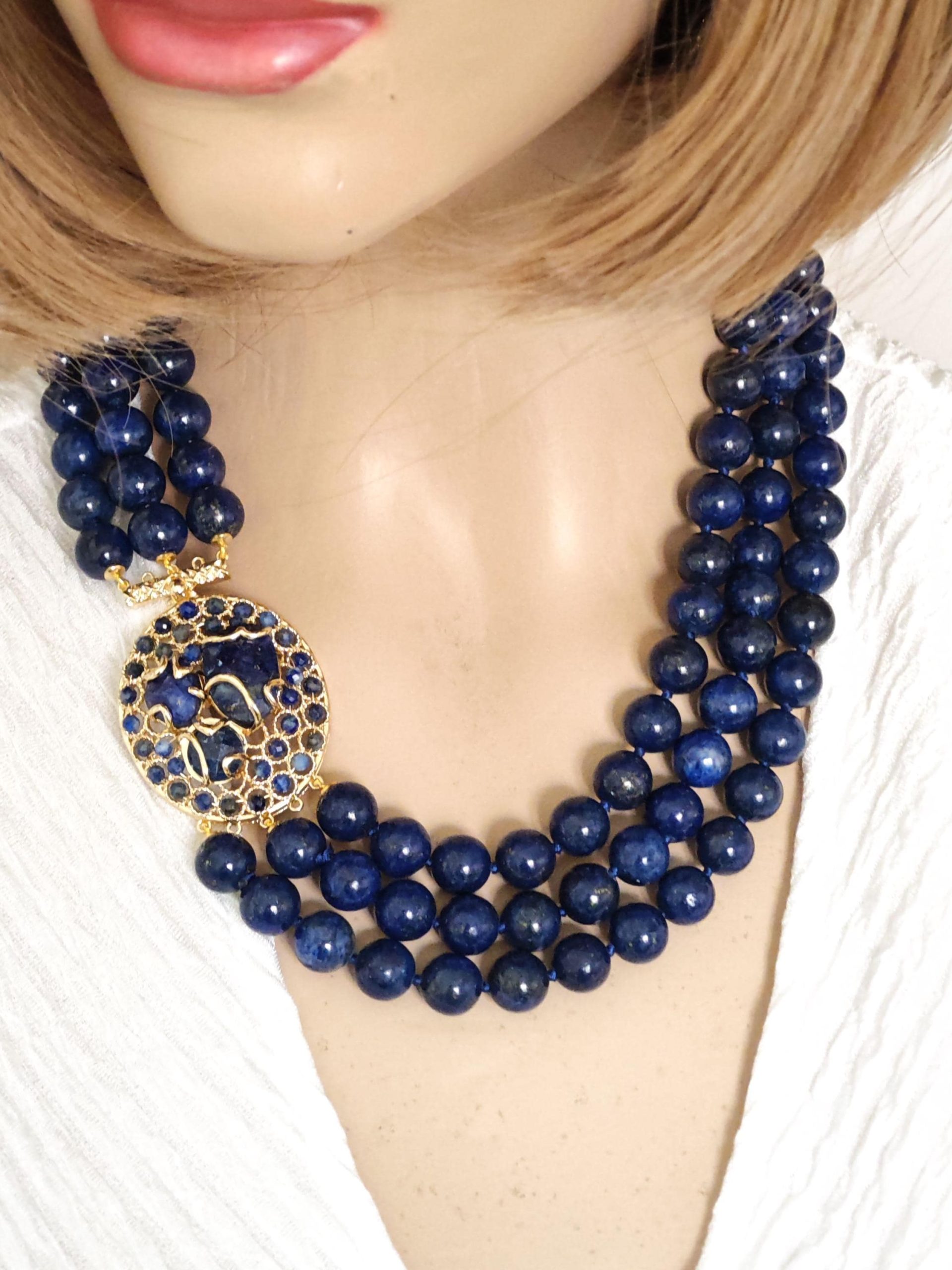 Collana artigianale girocollo a 3 fili annodata a mano con pietre dure lapislazzuli blu 8 mm con chiusura laterale in ottone dorato con pietre incastonate lapislazzuli.