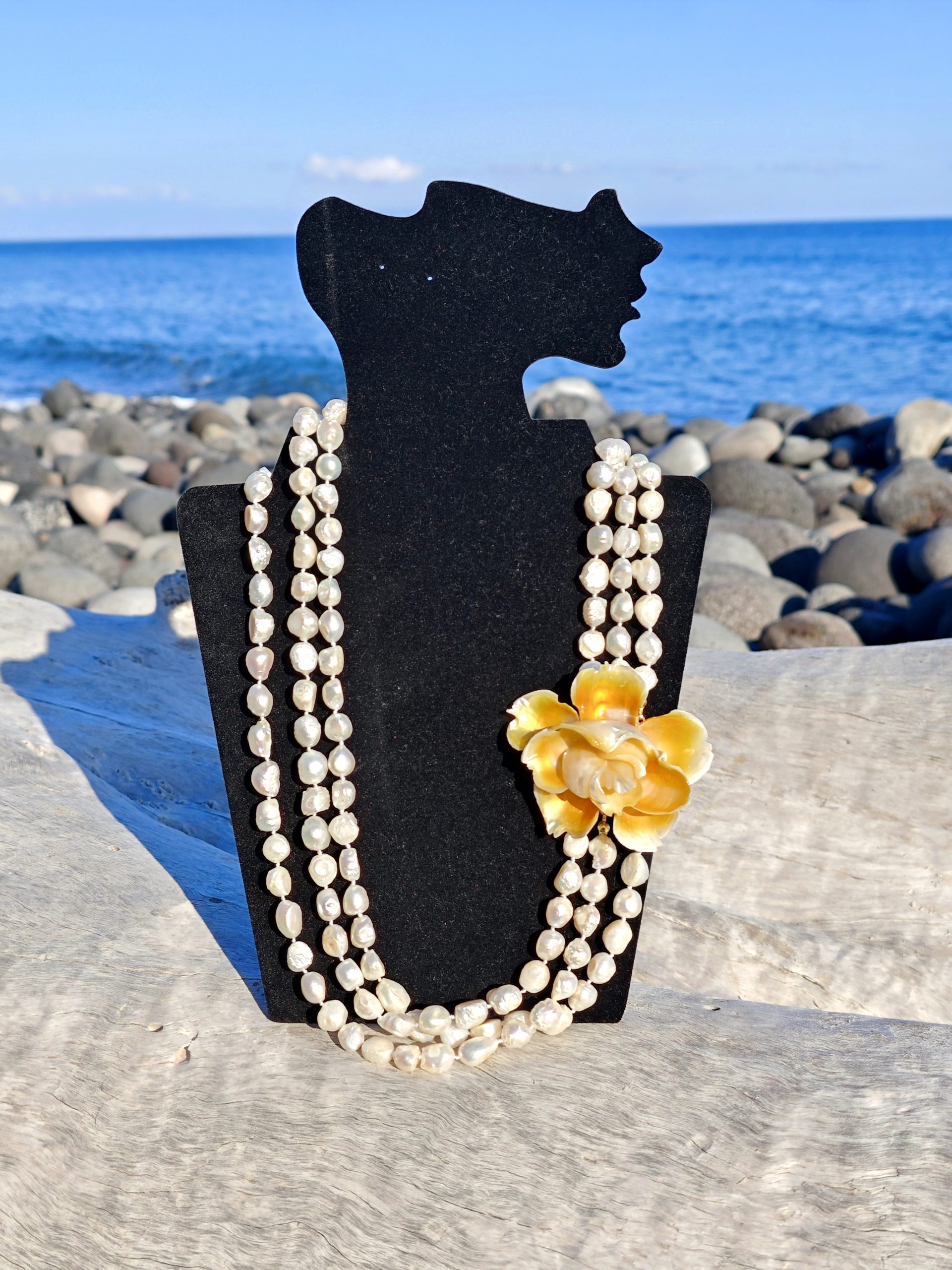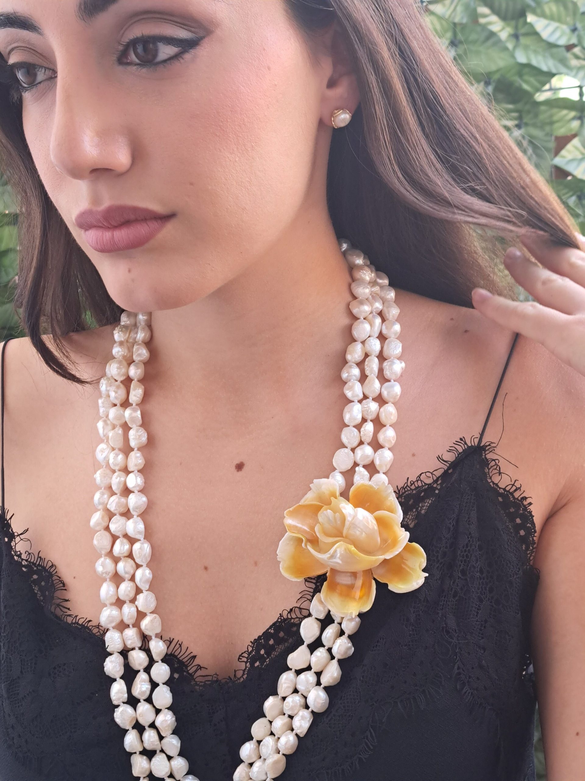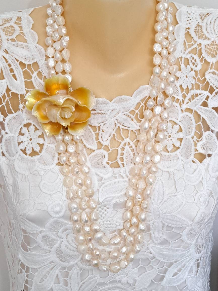 Collana maxi con 3 fili di perle bianche naturali 10 mm annodate a mano , con elemento laterale a forma di fiore in madreperla,