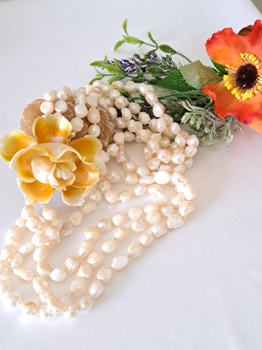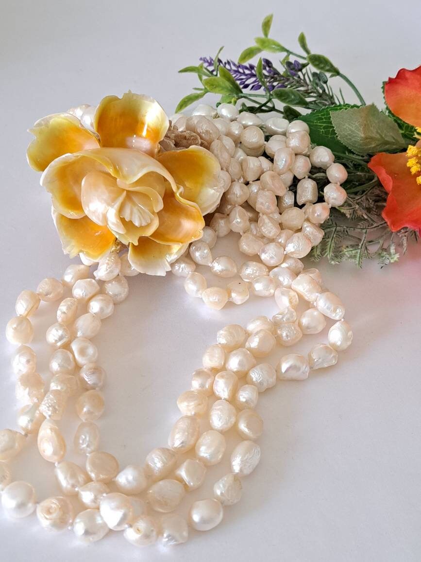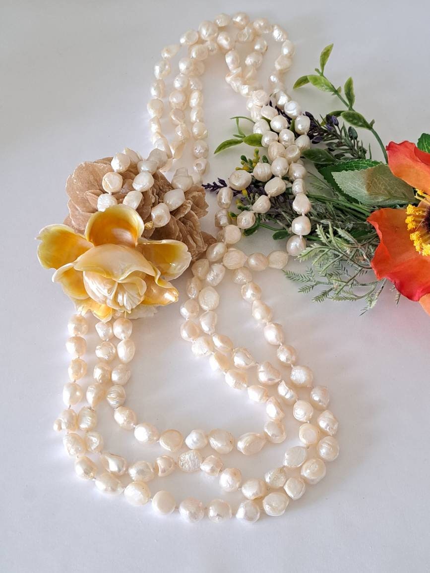 Collana maxi con 3 fili di perle bianche naturali 10 mm annodate a mano , con elemento laterale a forma di fiore in madreperla,