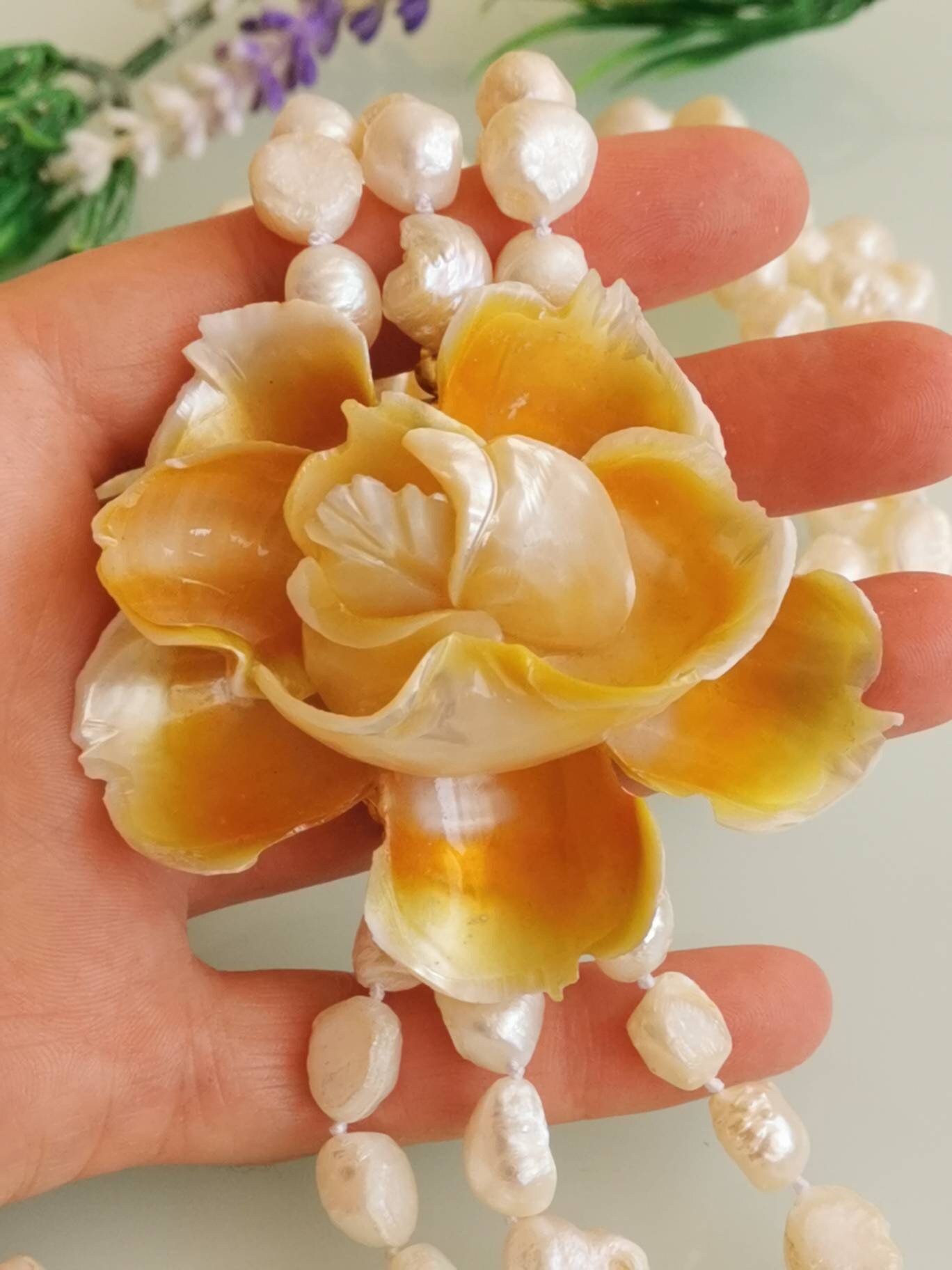 Collana maxi perle bianche e fiore madreperla, collana multifilo