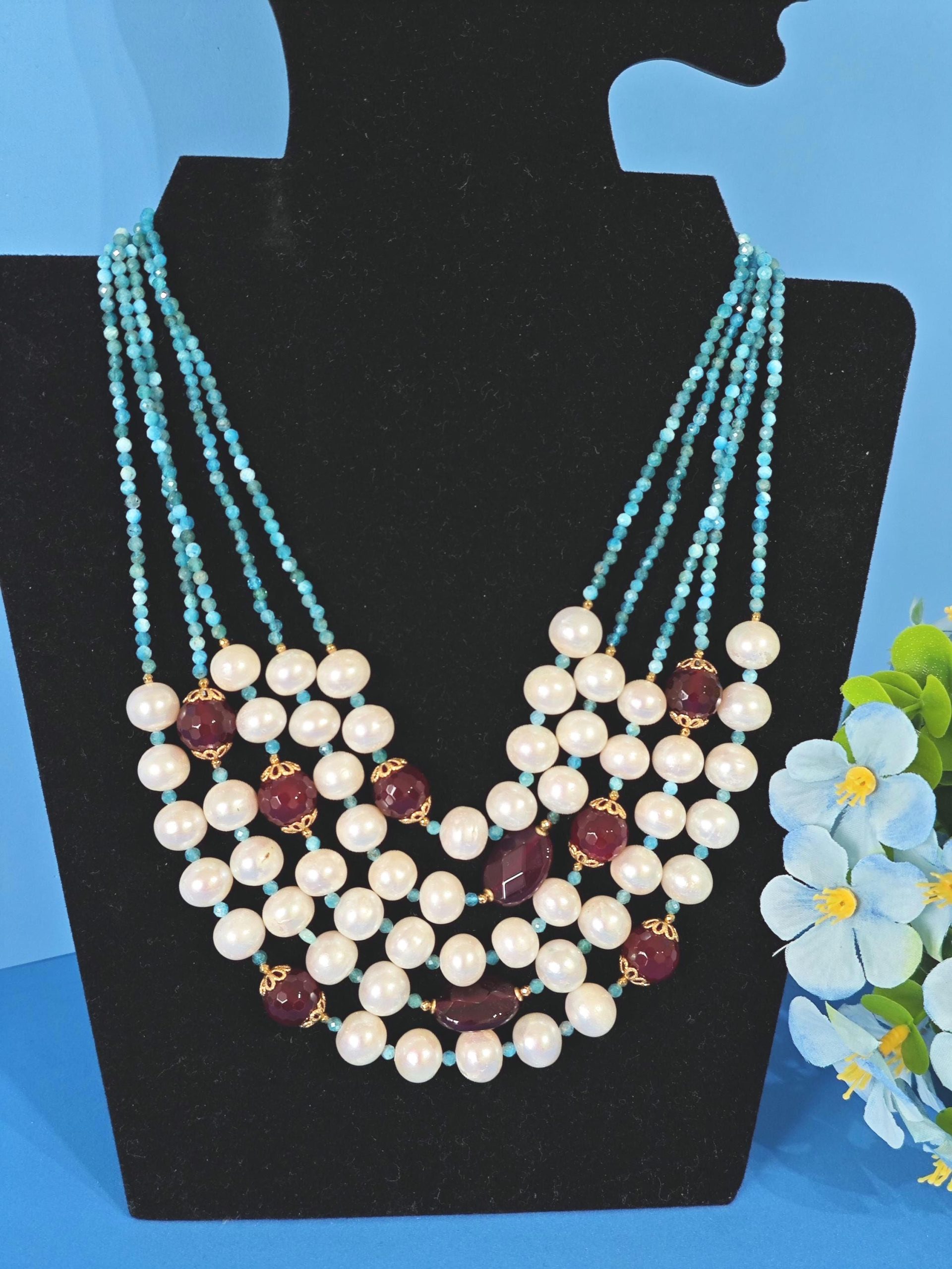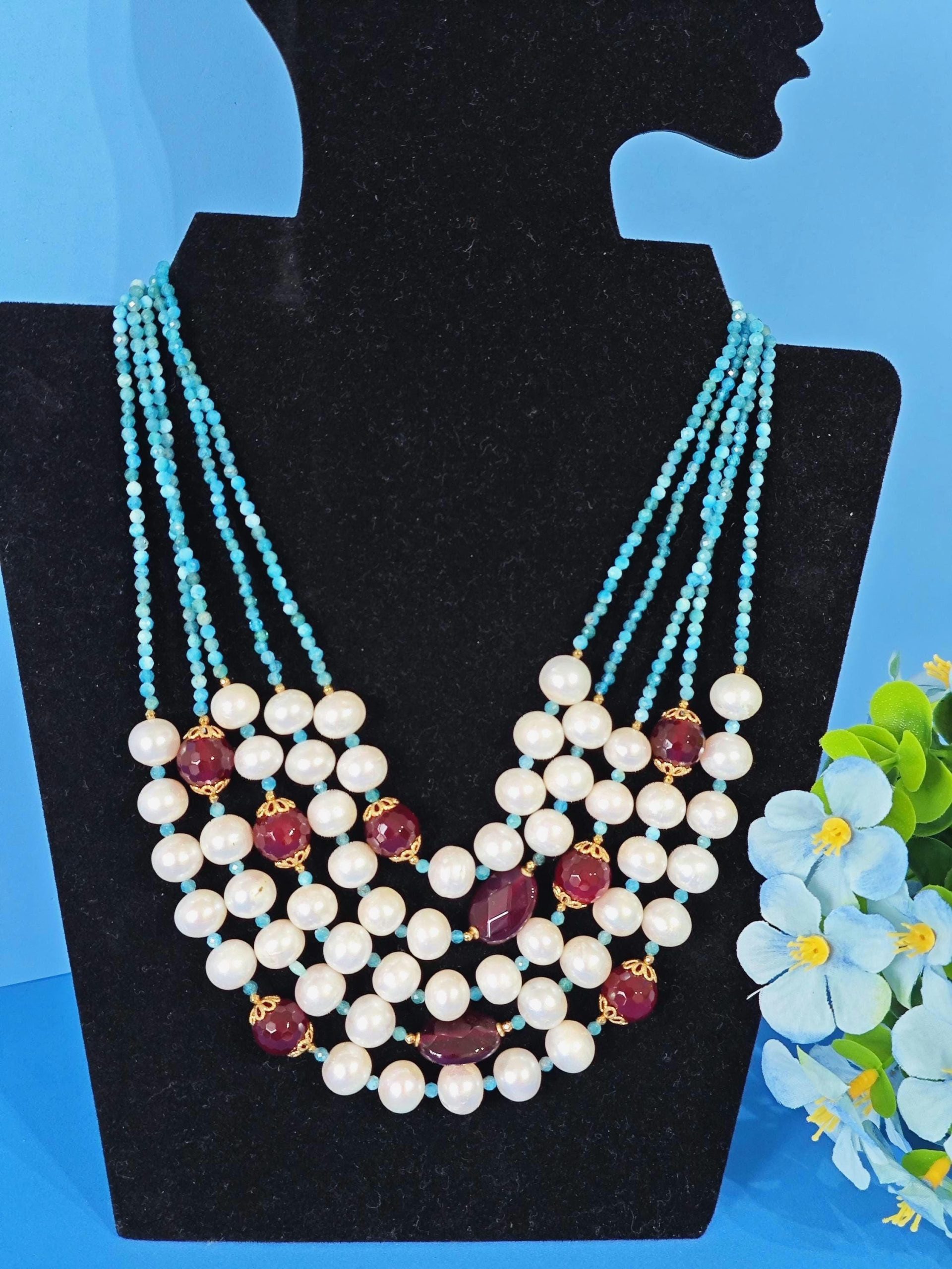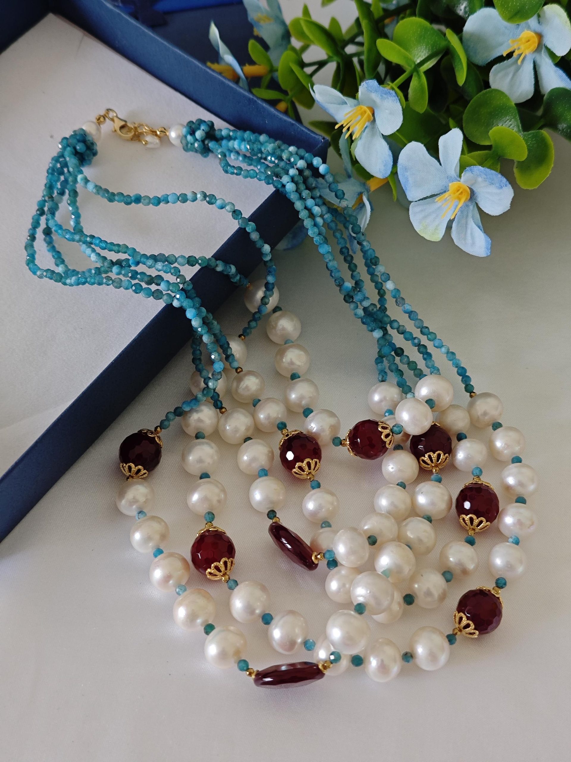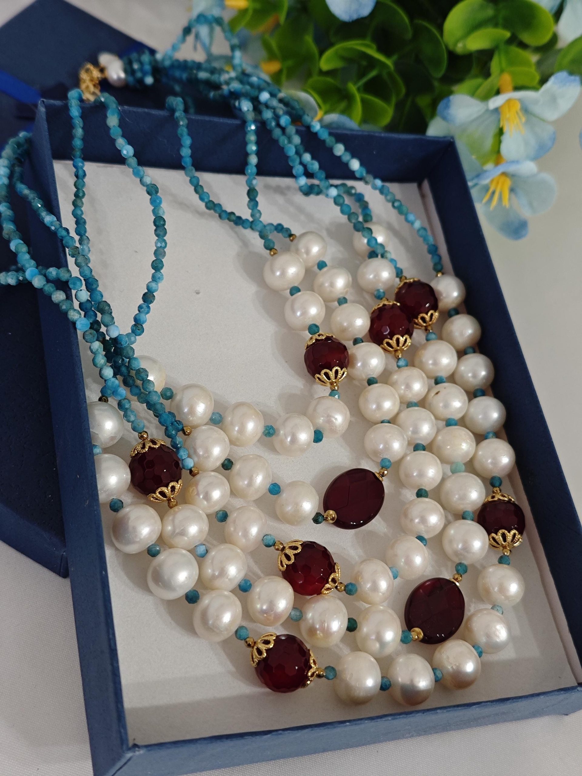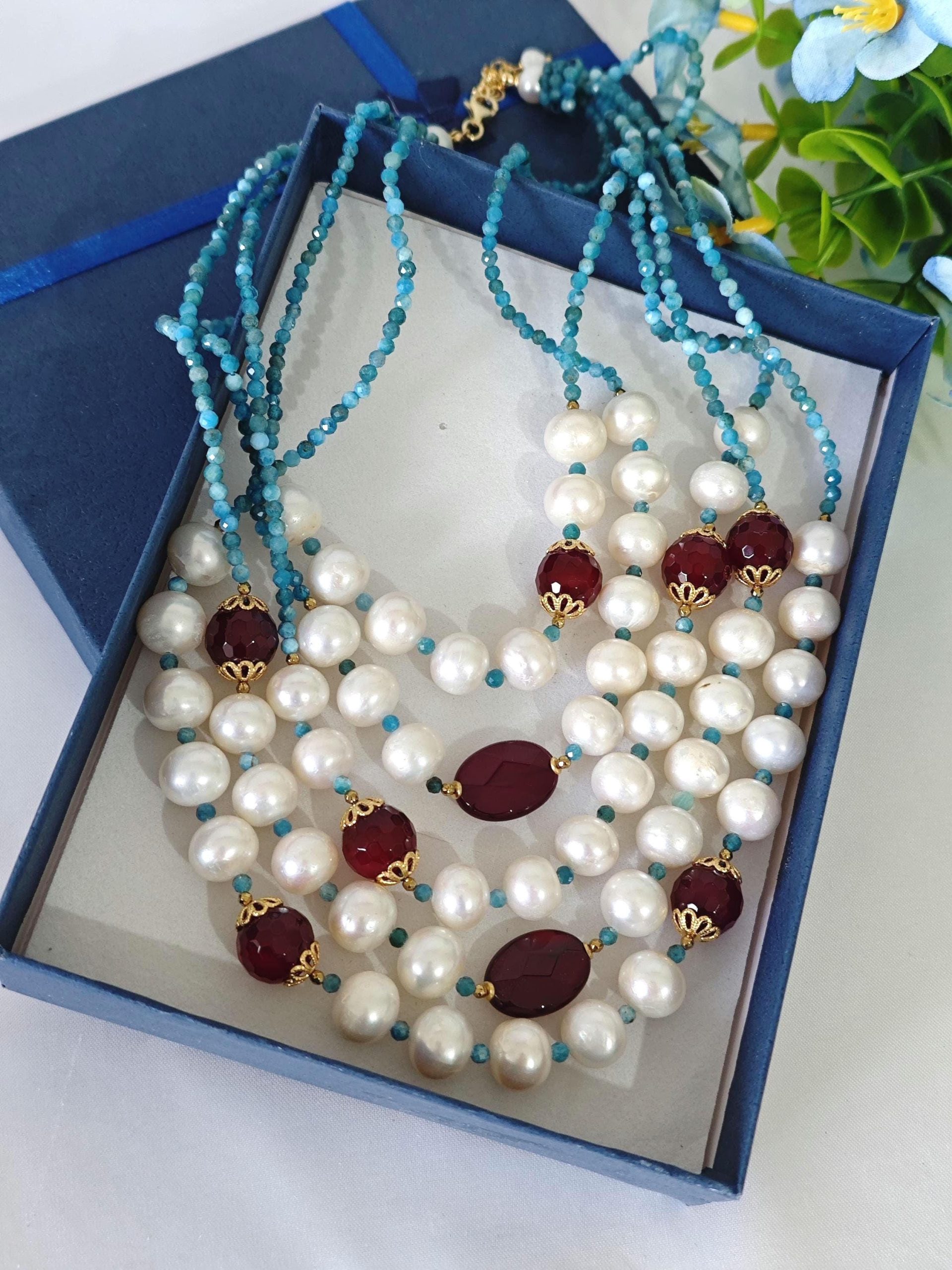 Collana a 3 fili realizzata a mano con pietre dure apatite blu e agata rossa bordeaux e perle bianche naturali, chiusura a bottone in perla , lunghezza collana da 48 cm il filo più corto a 56 cm il filo più lungo.
