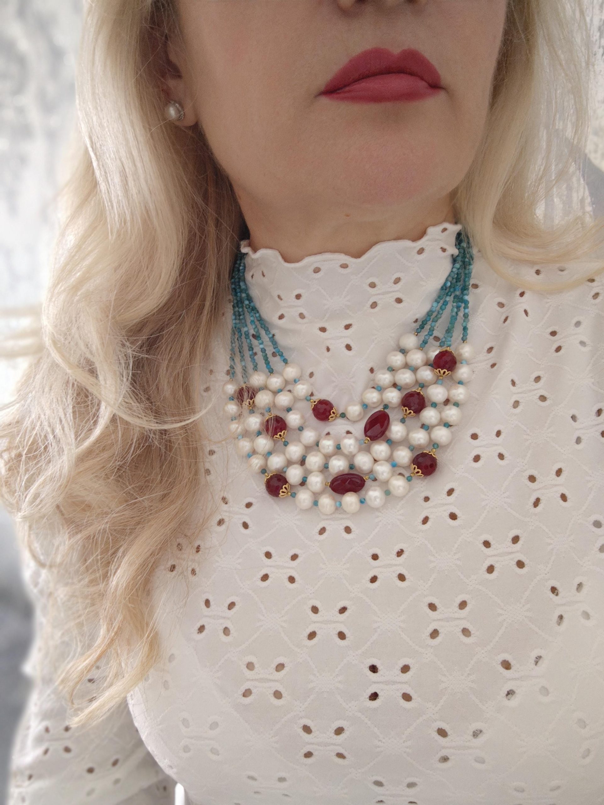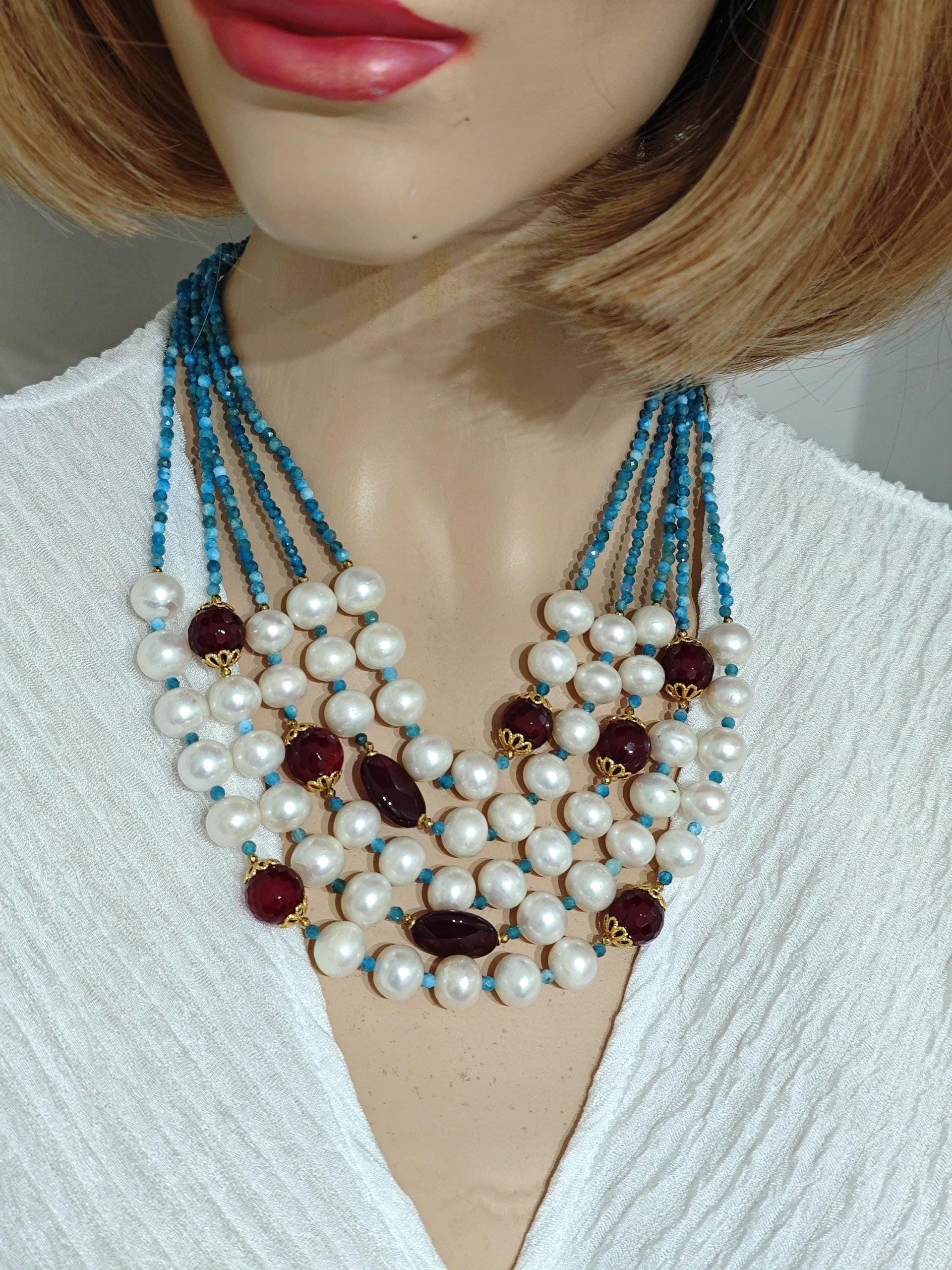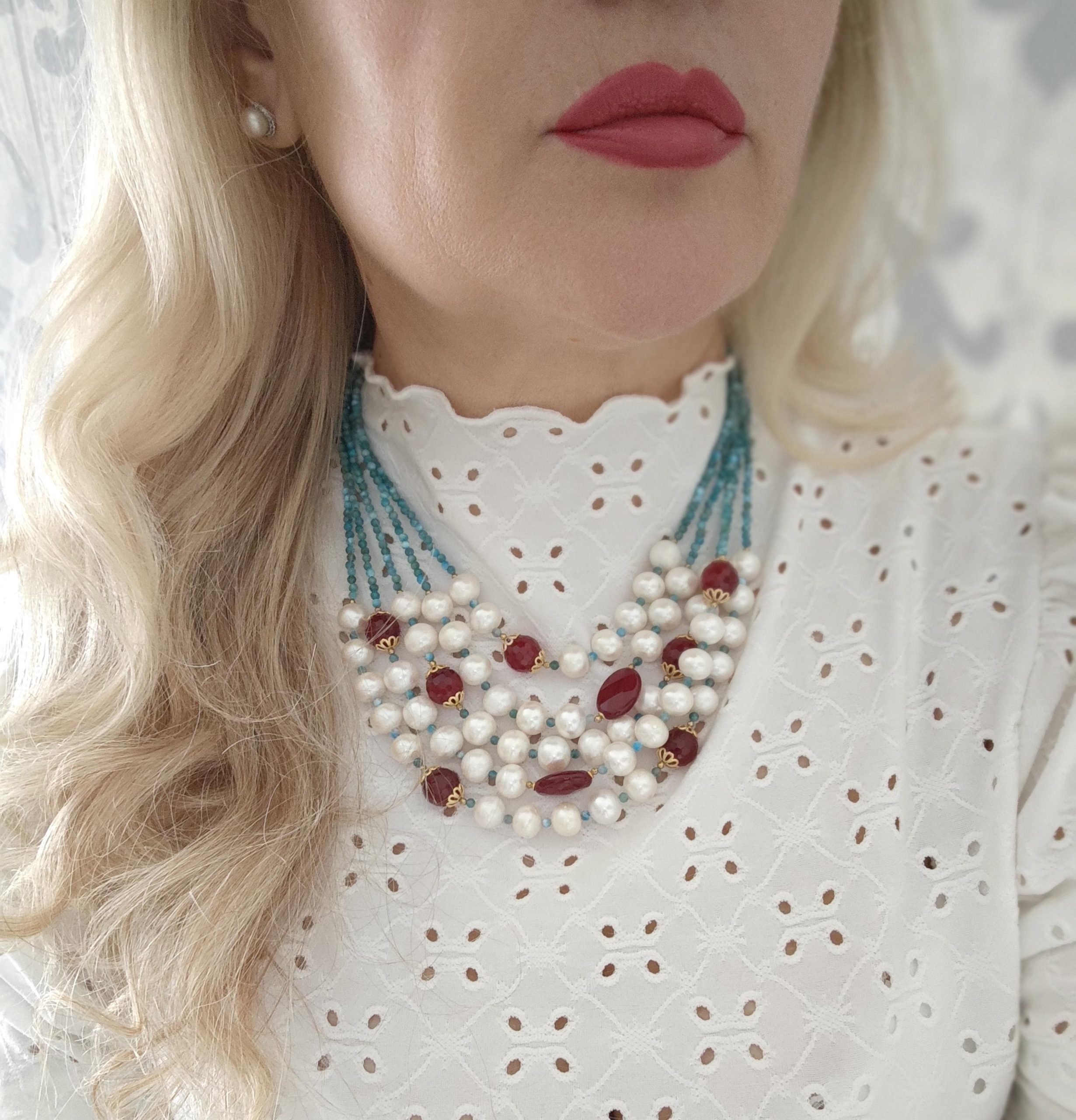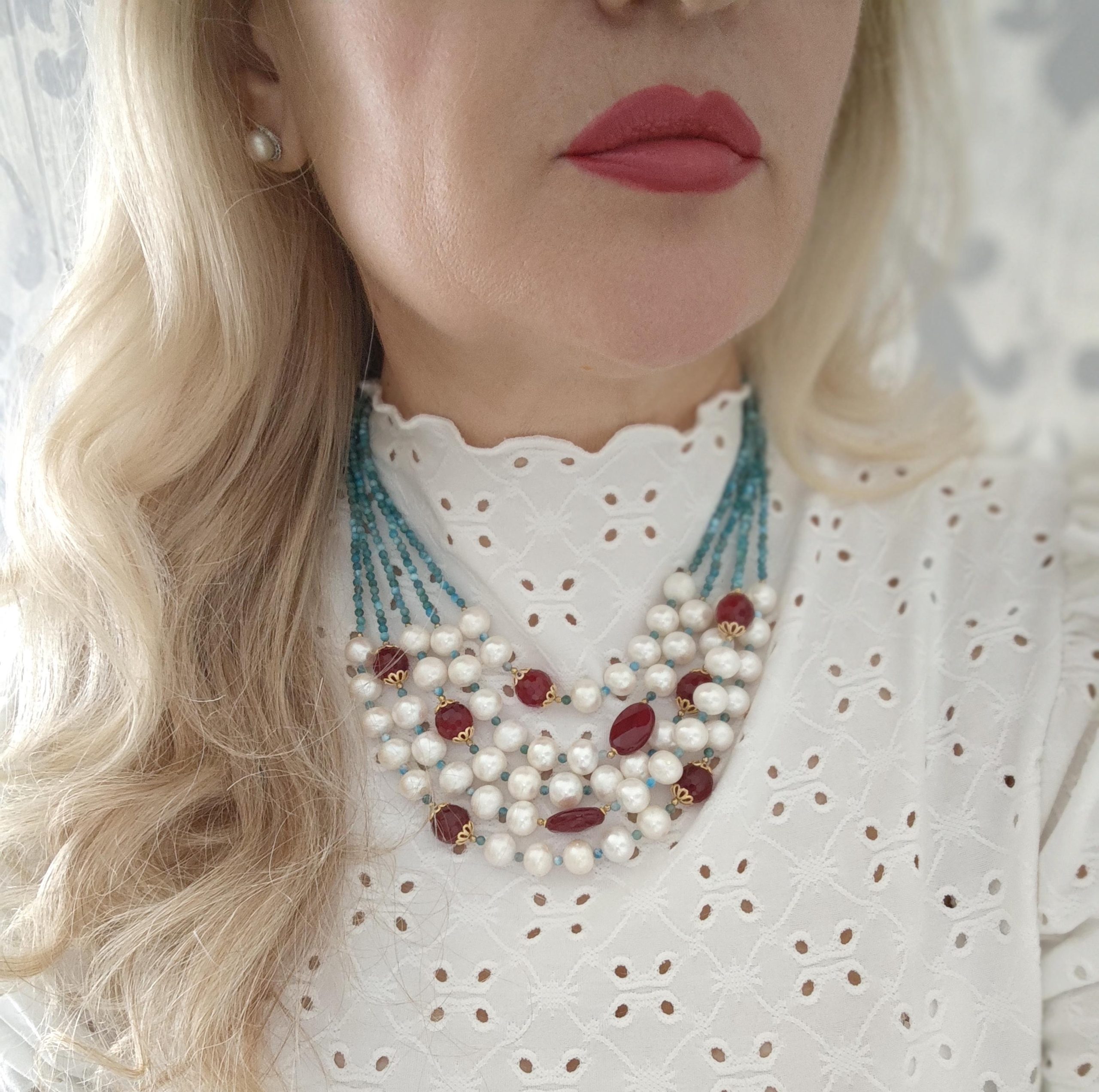 Collana multifilo perle bianche con pietre dure apatite e agata rossa , gioielli italiani