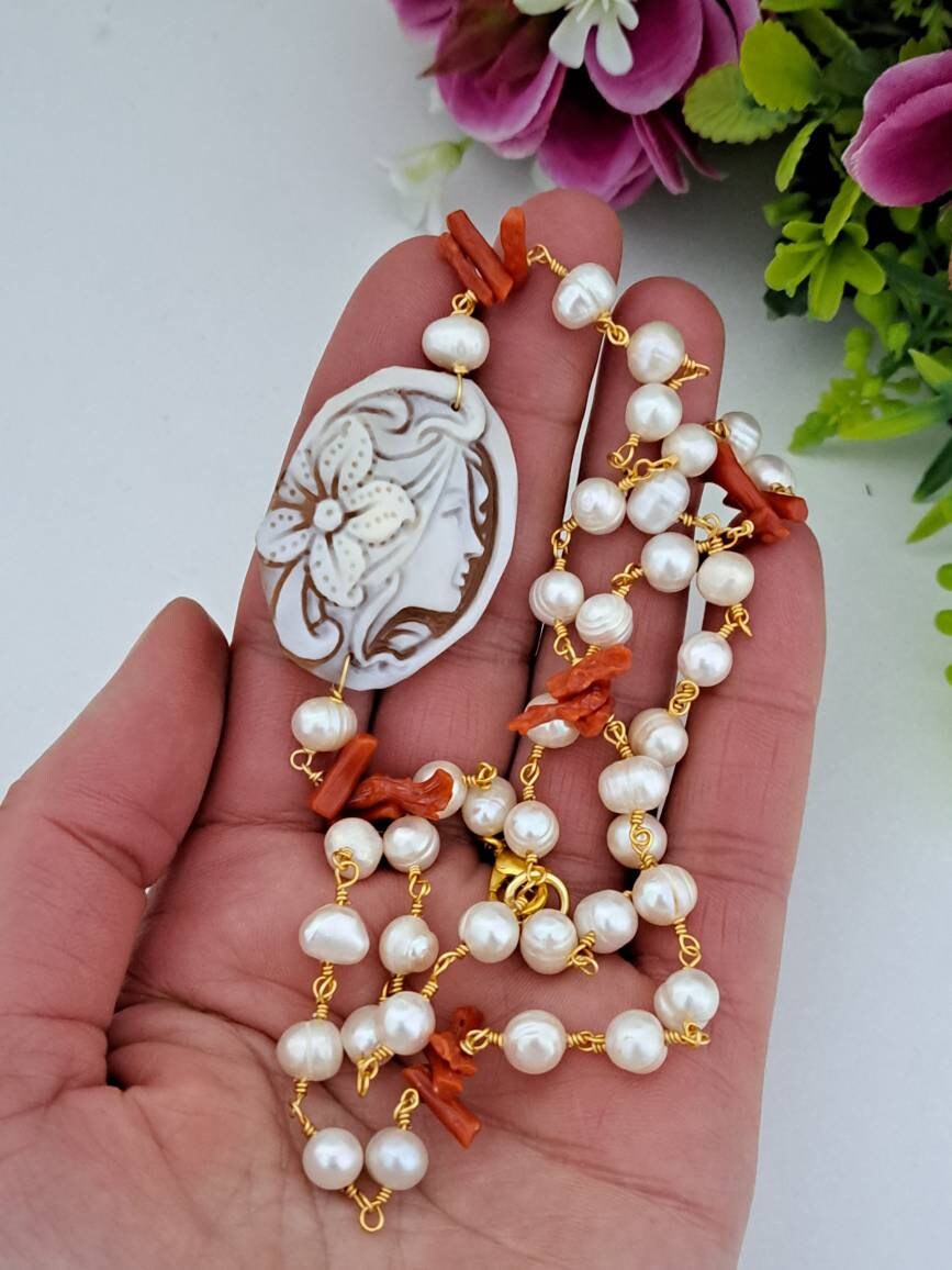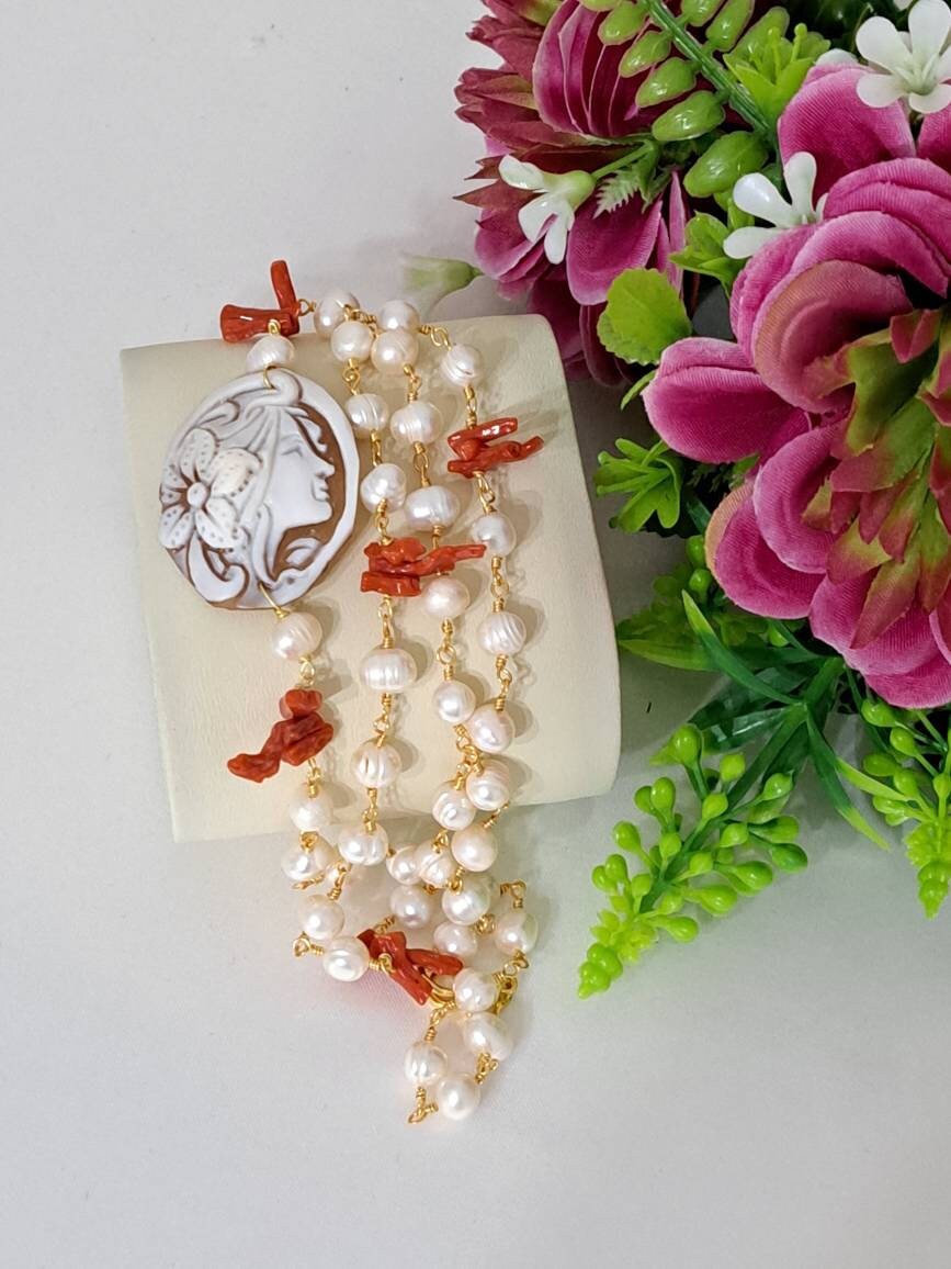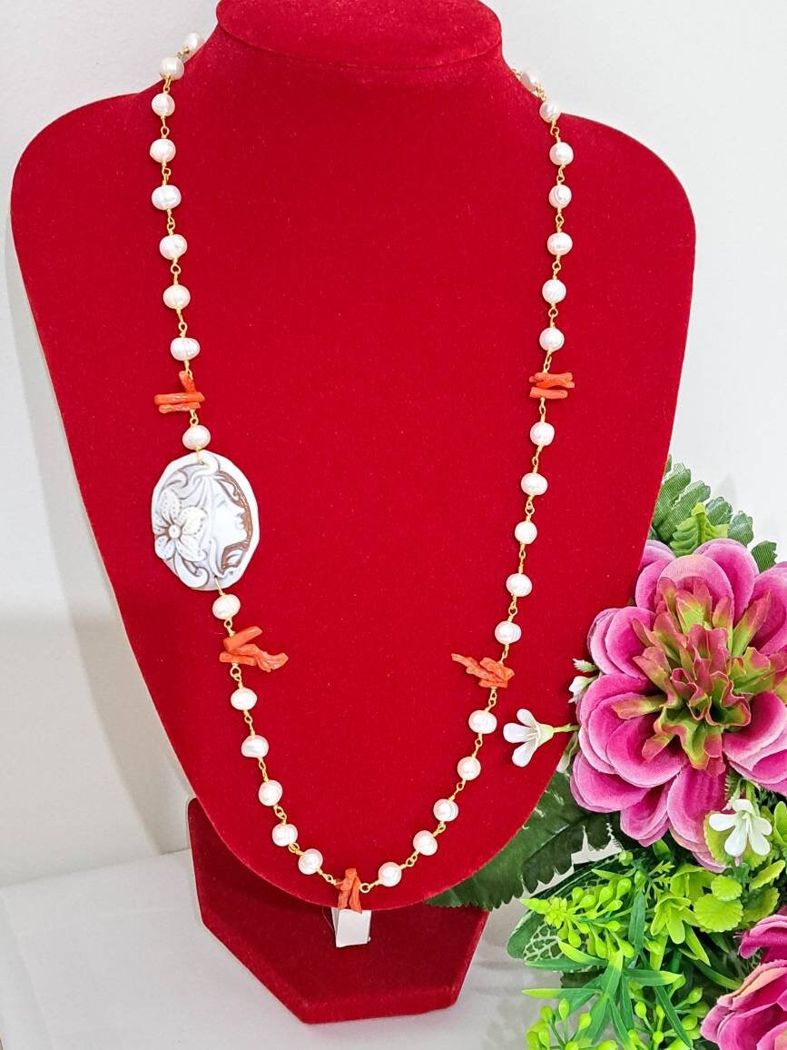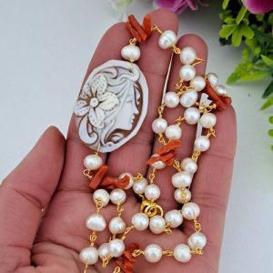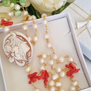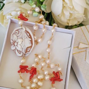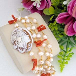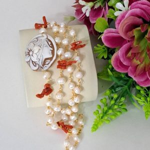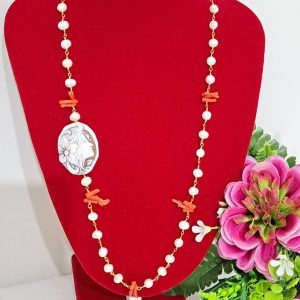 Collana realizzata con catena stile rosario con perle bianche naturali e rametti corallo rosso mediterraneo naturale e con pendente in cammeo conchiglia sardonica scolpito a mano a Torre del greco raffigurante volto di donna 4×3 cm dimensioni .
