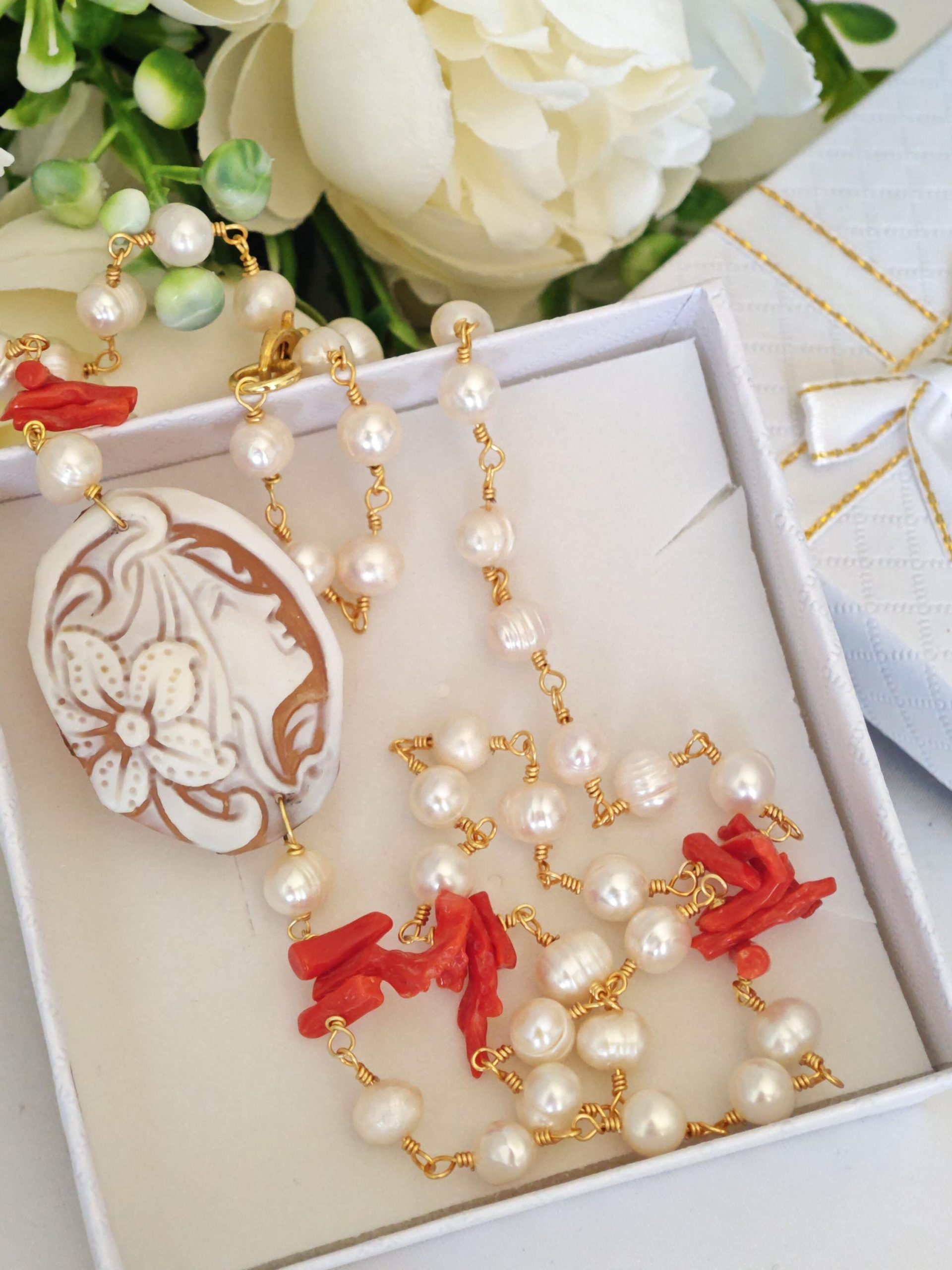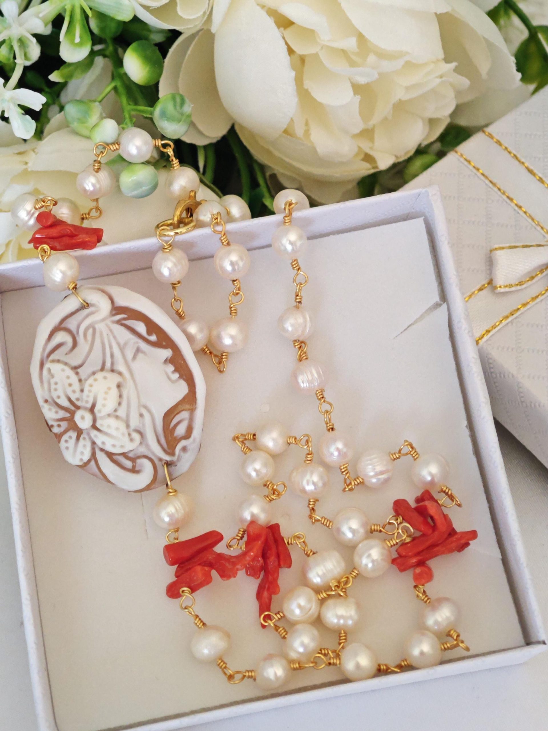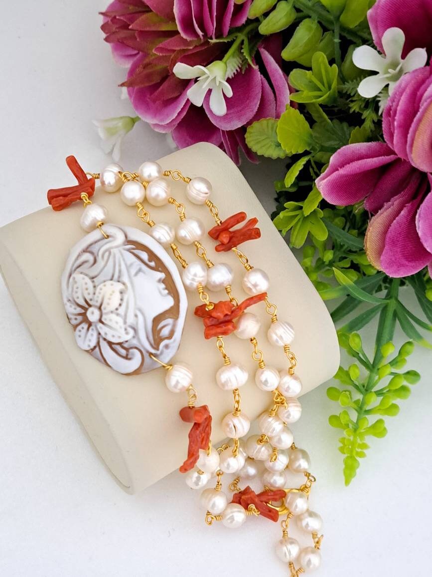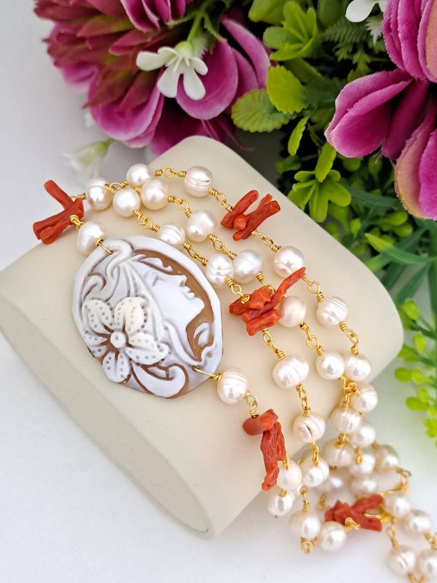 Collana realizzata con catena stile rosario con perle bianche naturali e rametti corallo rosso mediterraneo naturale e con pendente in cammeo conchiglia sardonica scolpito a mano a Torre del greco raffigurante volto di donna 4×3 cm dimensioni .