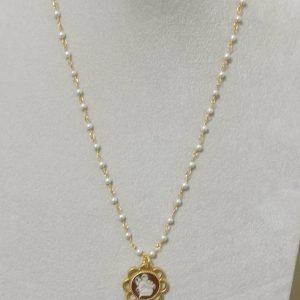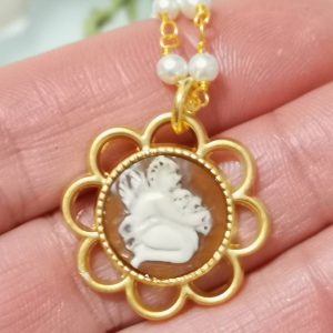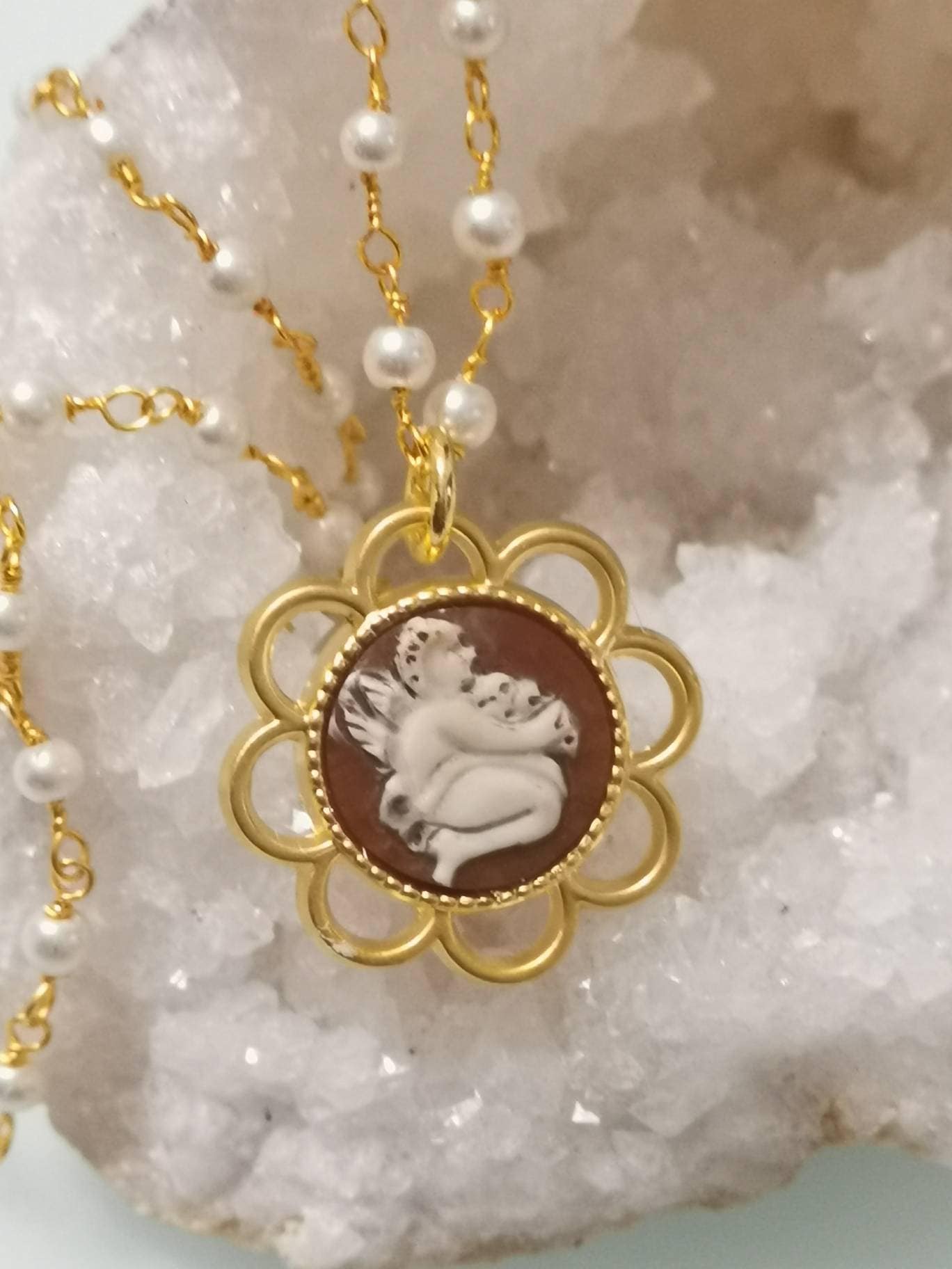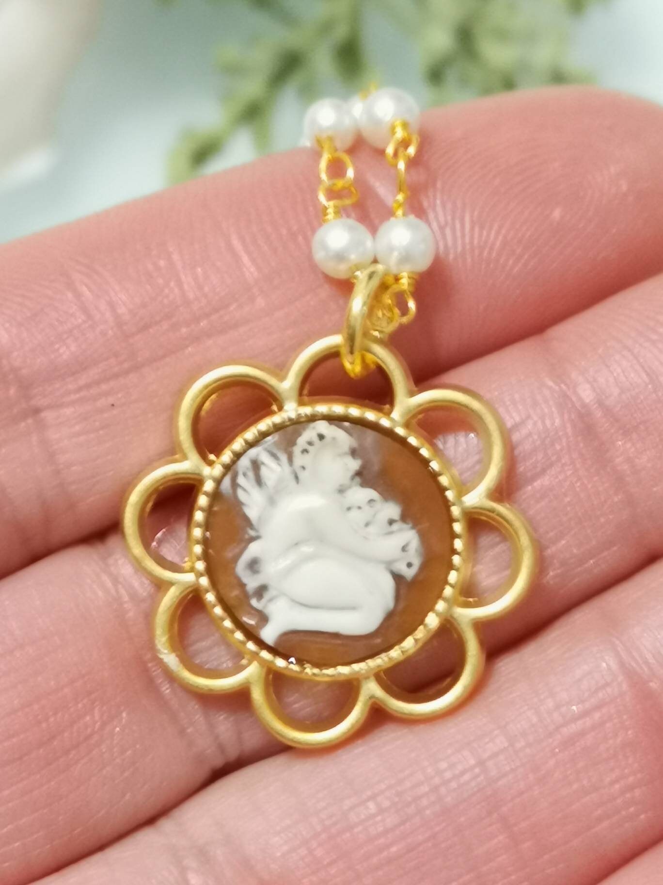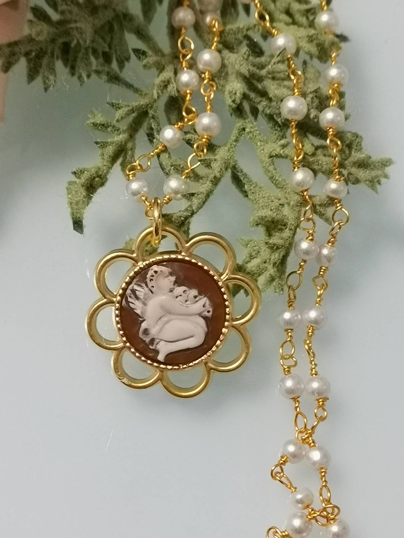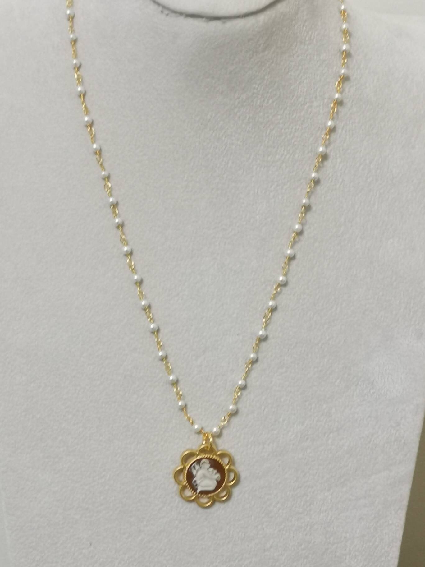 Collana girocollo realizzata con catena stile rosario con perle bianche imitazione e con pendente a forma di fiore in ottone dorato 2,5 cm diametro con cammeo conchiglia sardonica scolpito a mano a Torre del greco raffigurante fatina 1,5 cm diametro .
