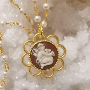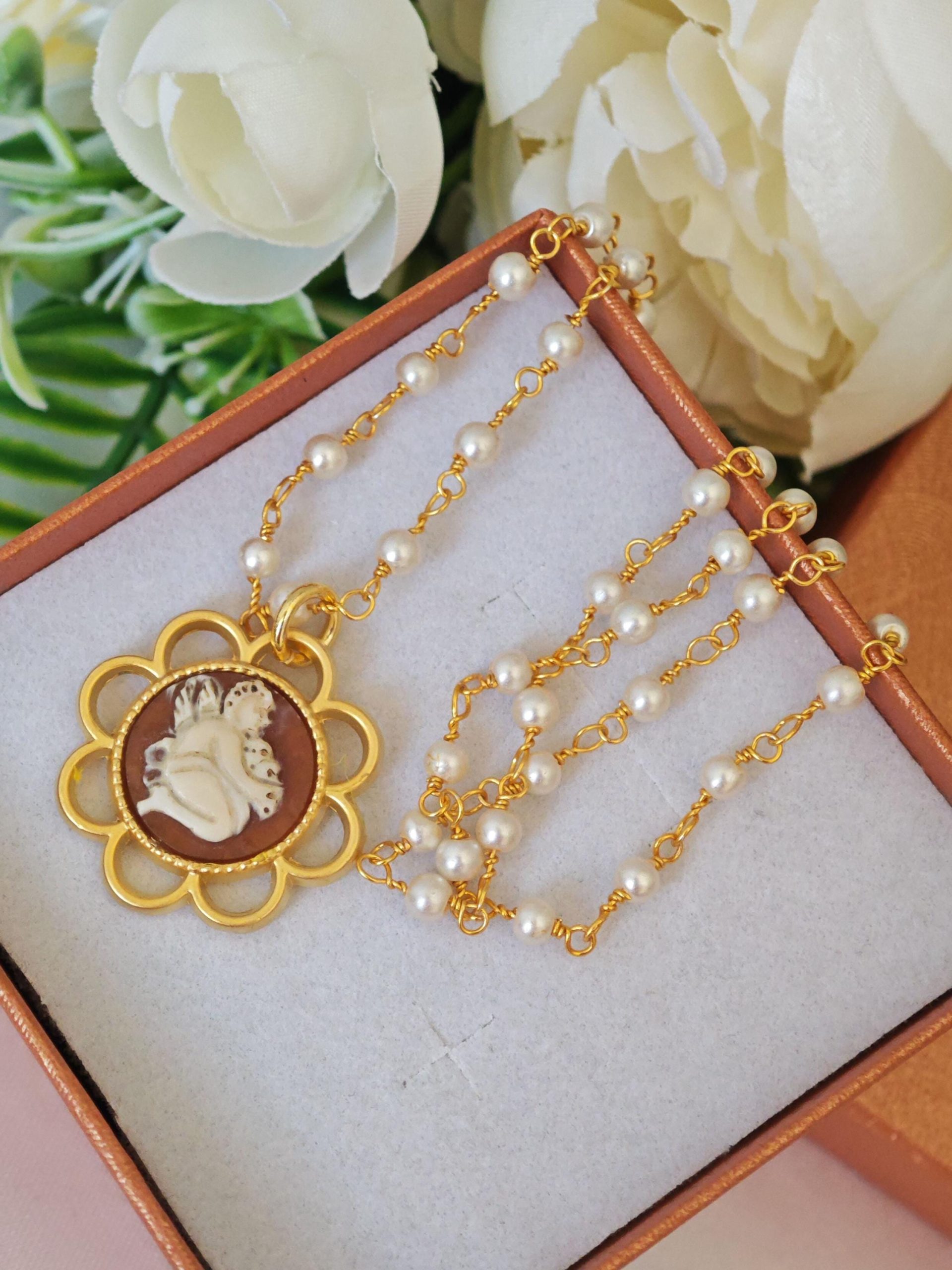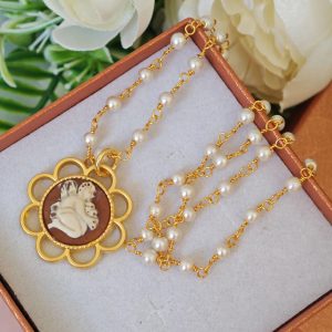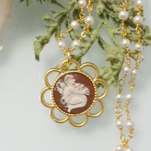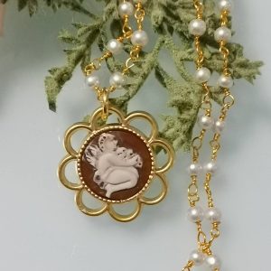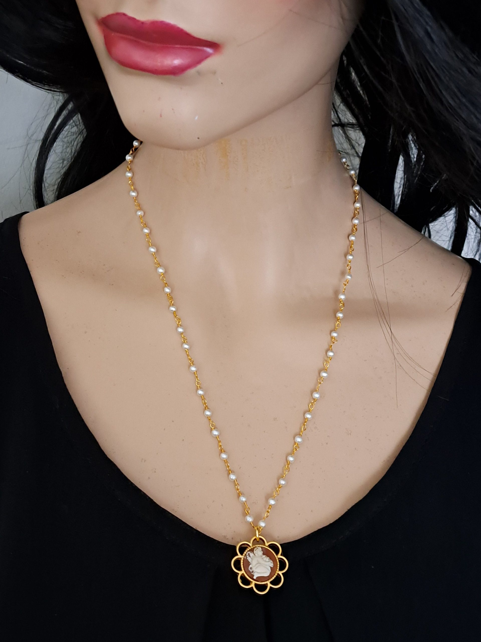 Collana cammeo conchiglia sardonica e catena rosario perle bianche, gioielli italiani