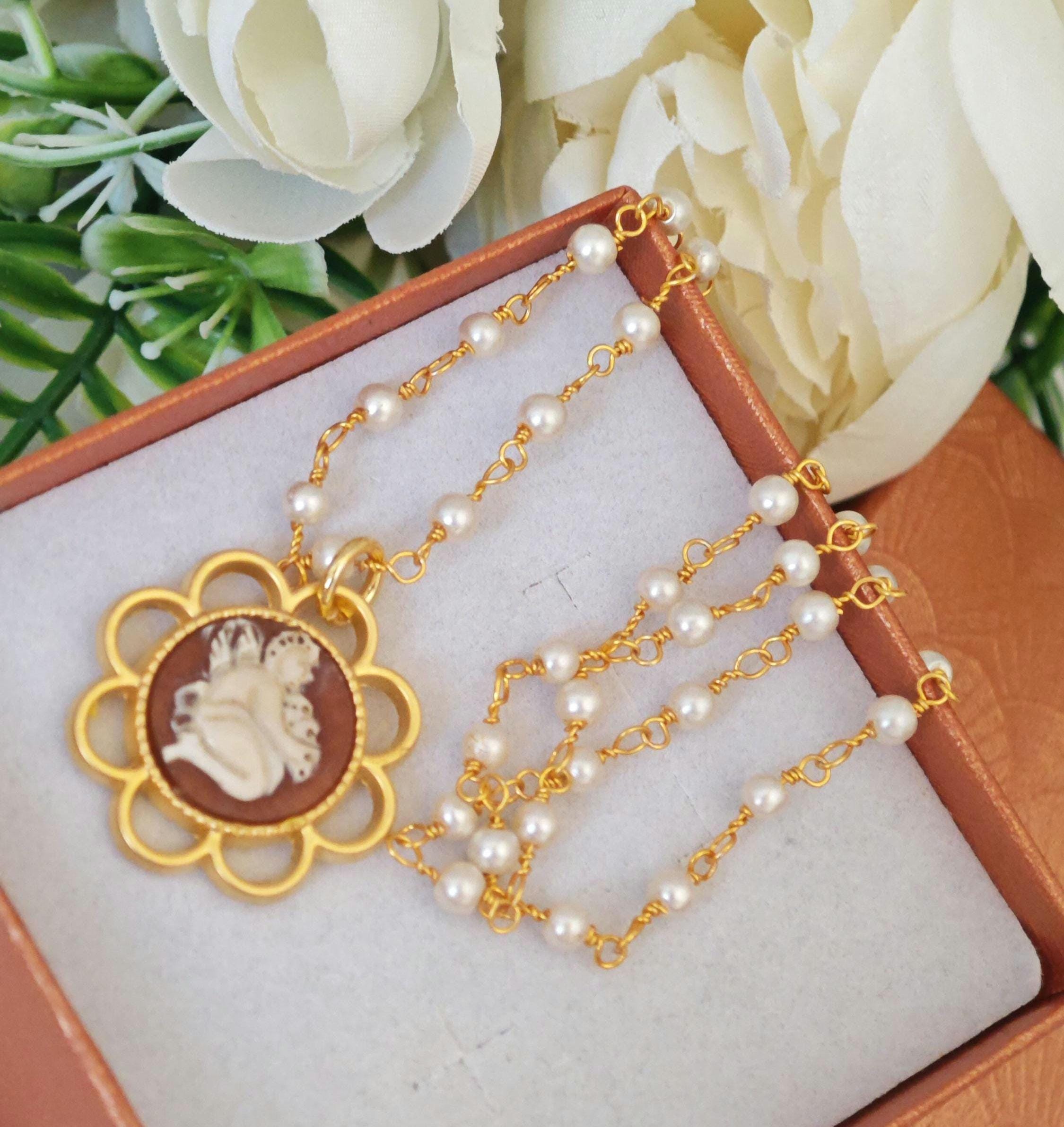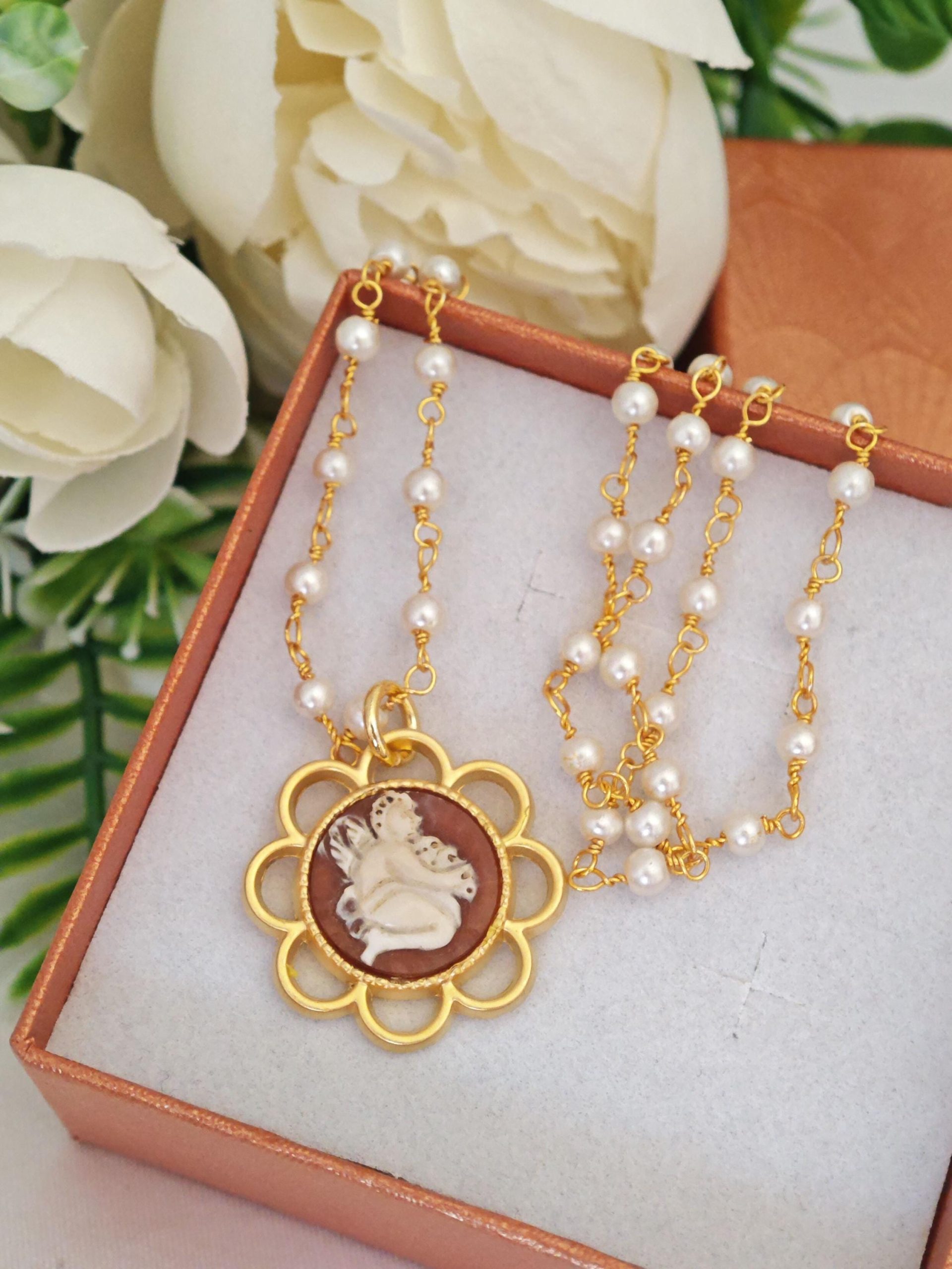 Collana cammeo conchiglia sardonica , collana perle bianche , gioielli italiani