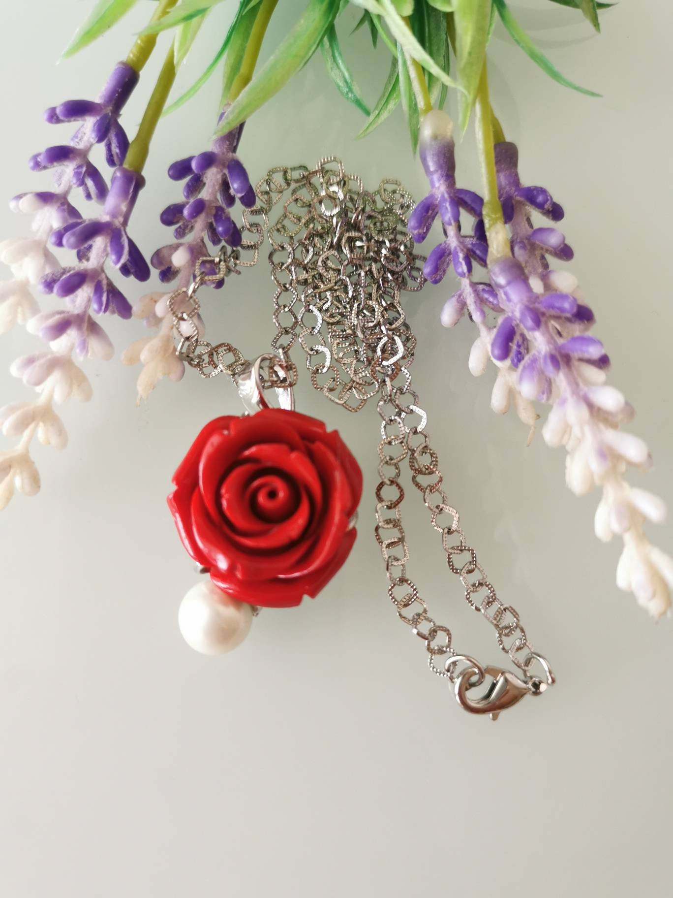 Collana realizzata con catena acciaio e pendente rosa resina imitazione corallo rosso , 2 cm diametro.