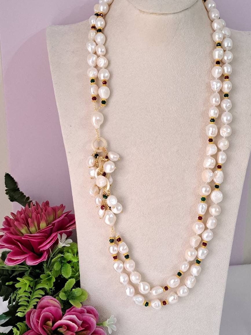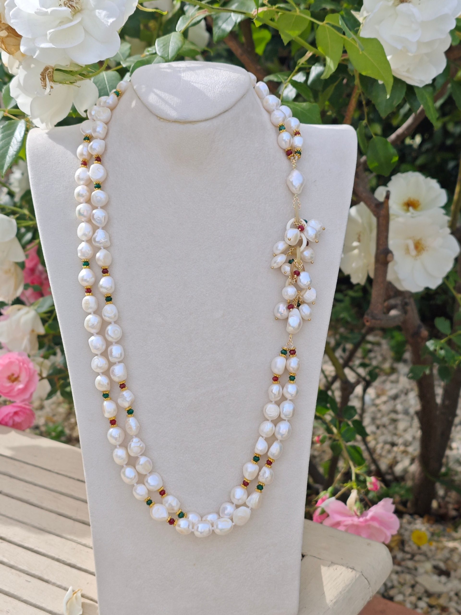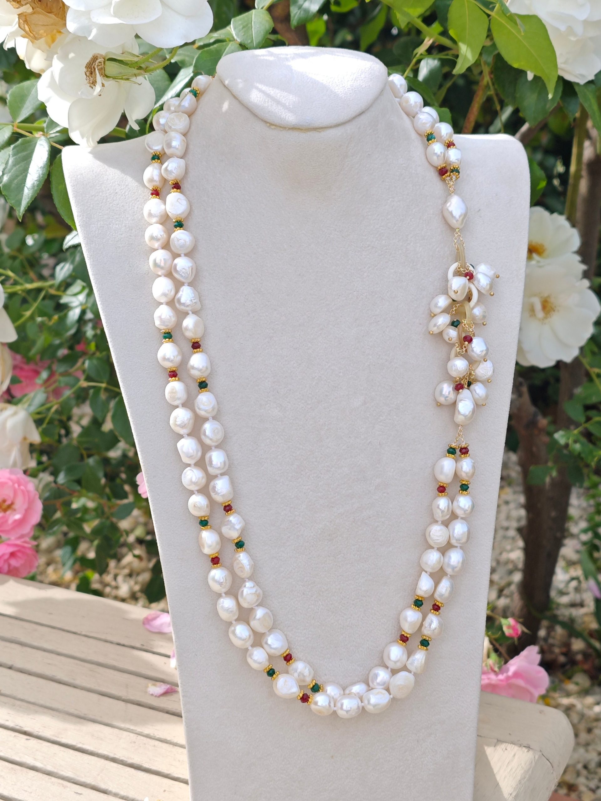 Collana maxi a 2 fili con perle barocche bianche annodate a mano con piccole pietre dure agata verde e rossa con grappolo laterale in corno , lunghezza collana 70 cm