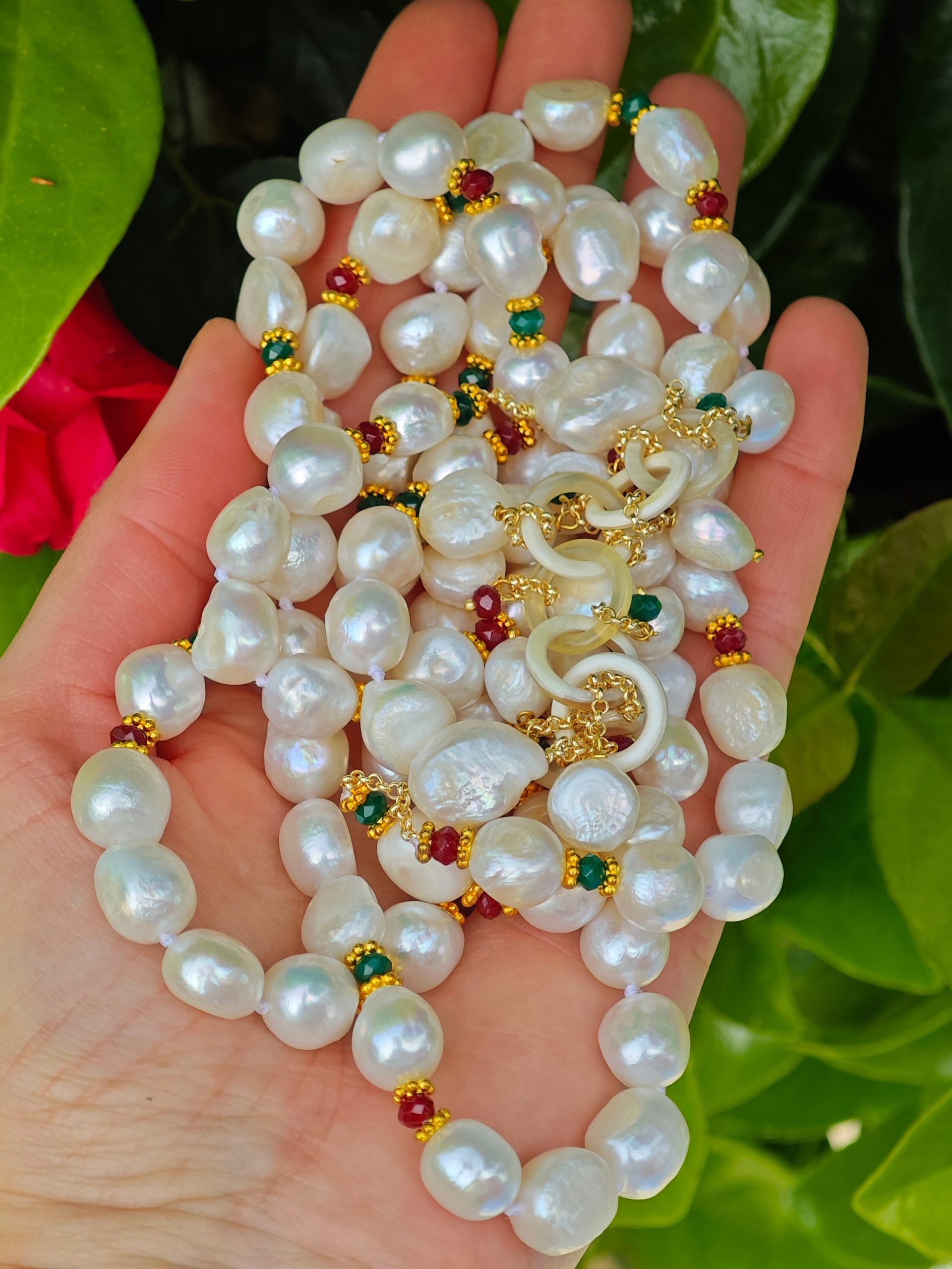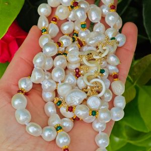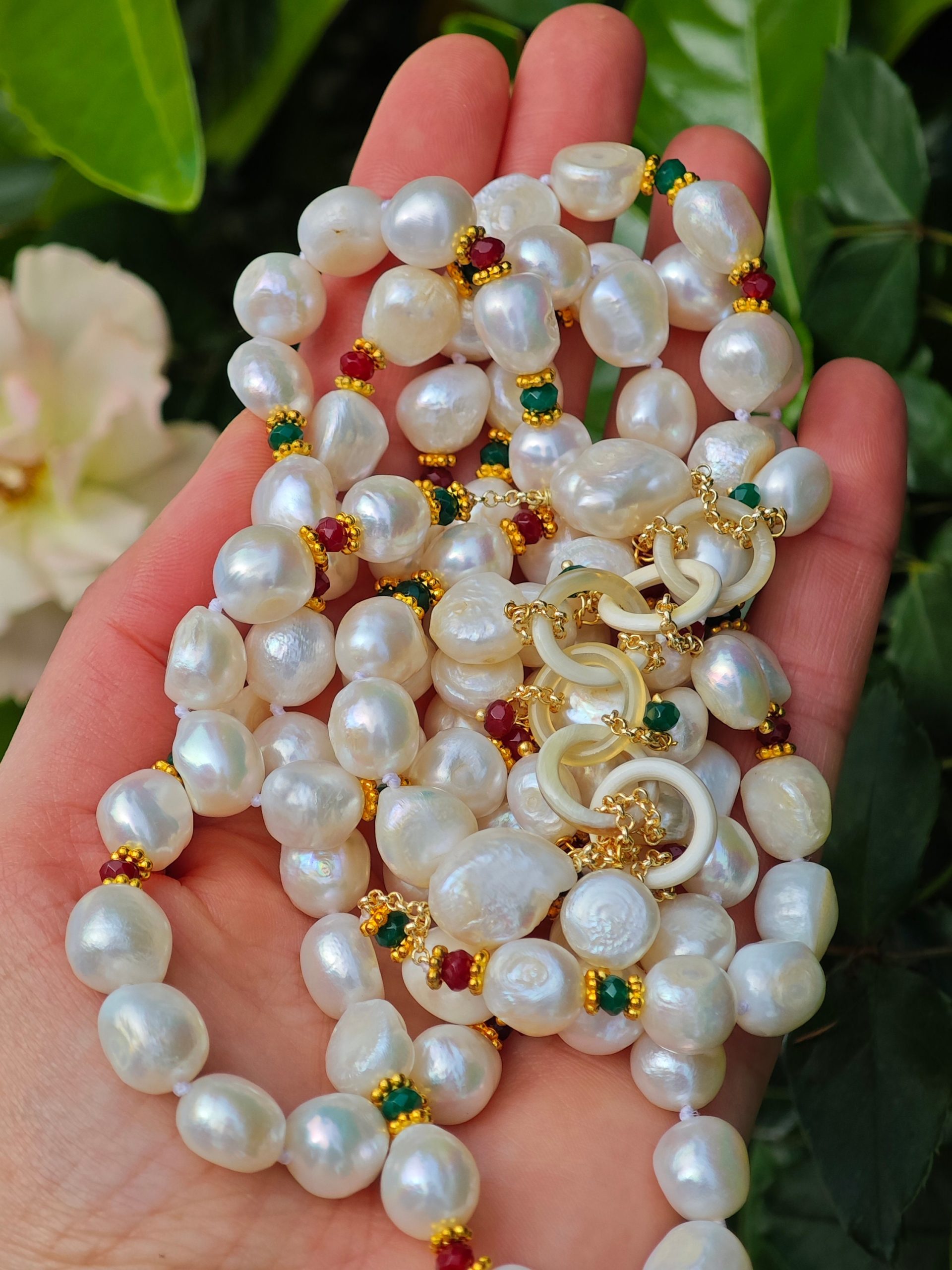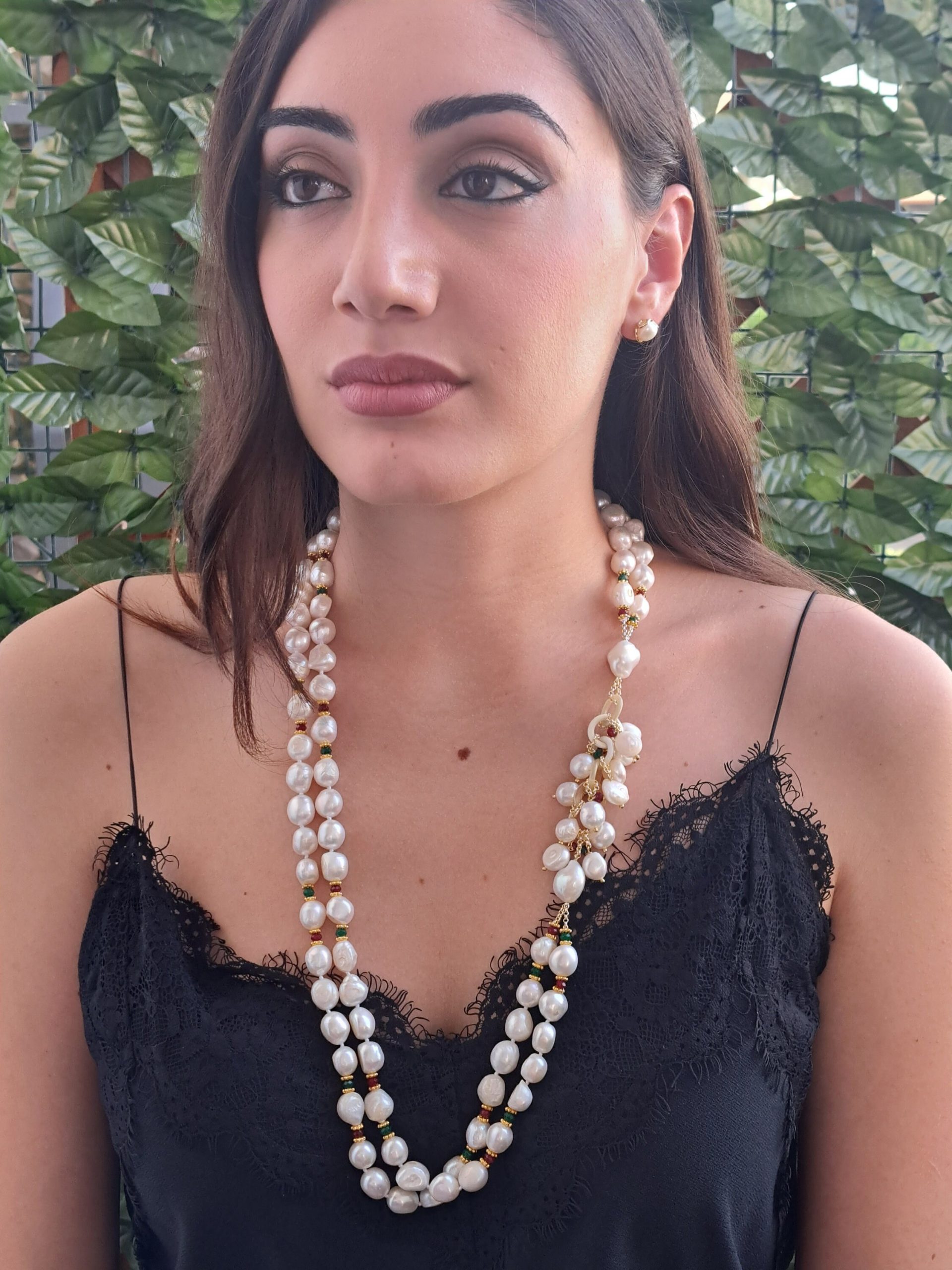 Collana maxi a 2 fili con perle barocche bianche annodate a mano con piccole pietre dure agata verde e rossa con grappolo laterale in corno , lunghezza collana 70 cm