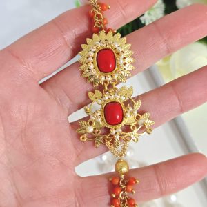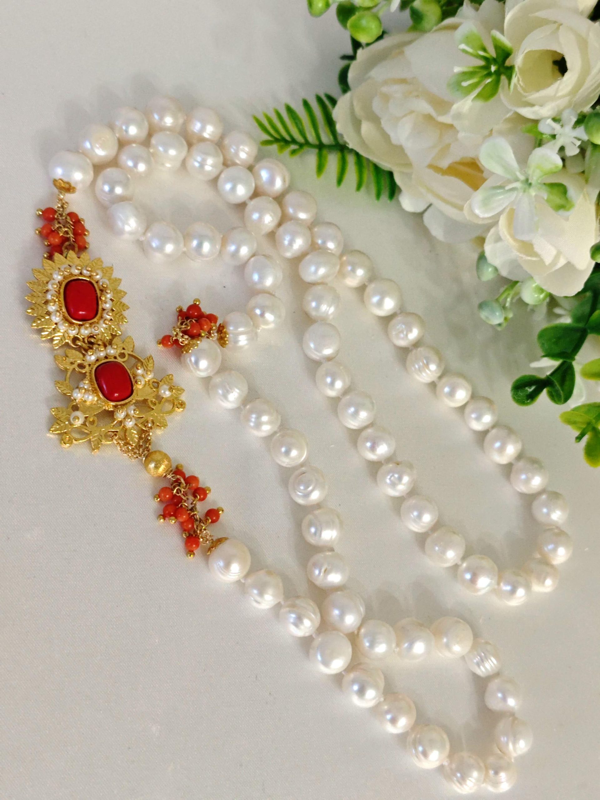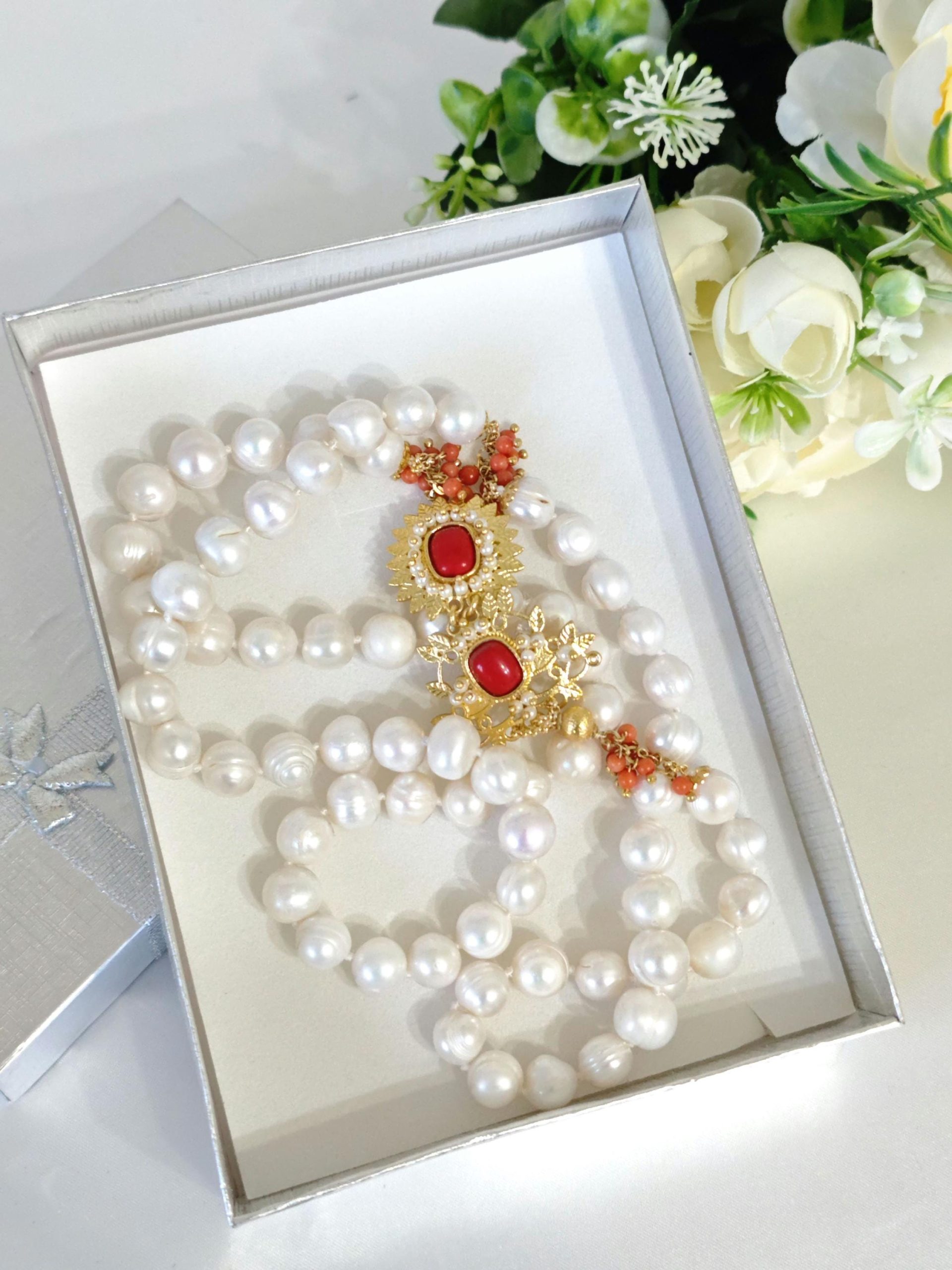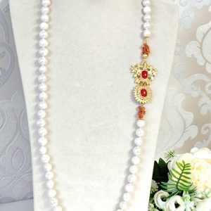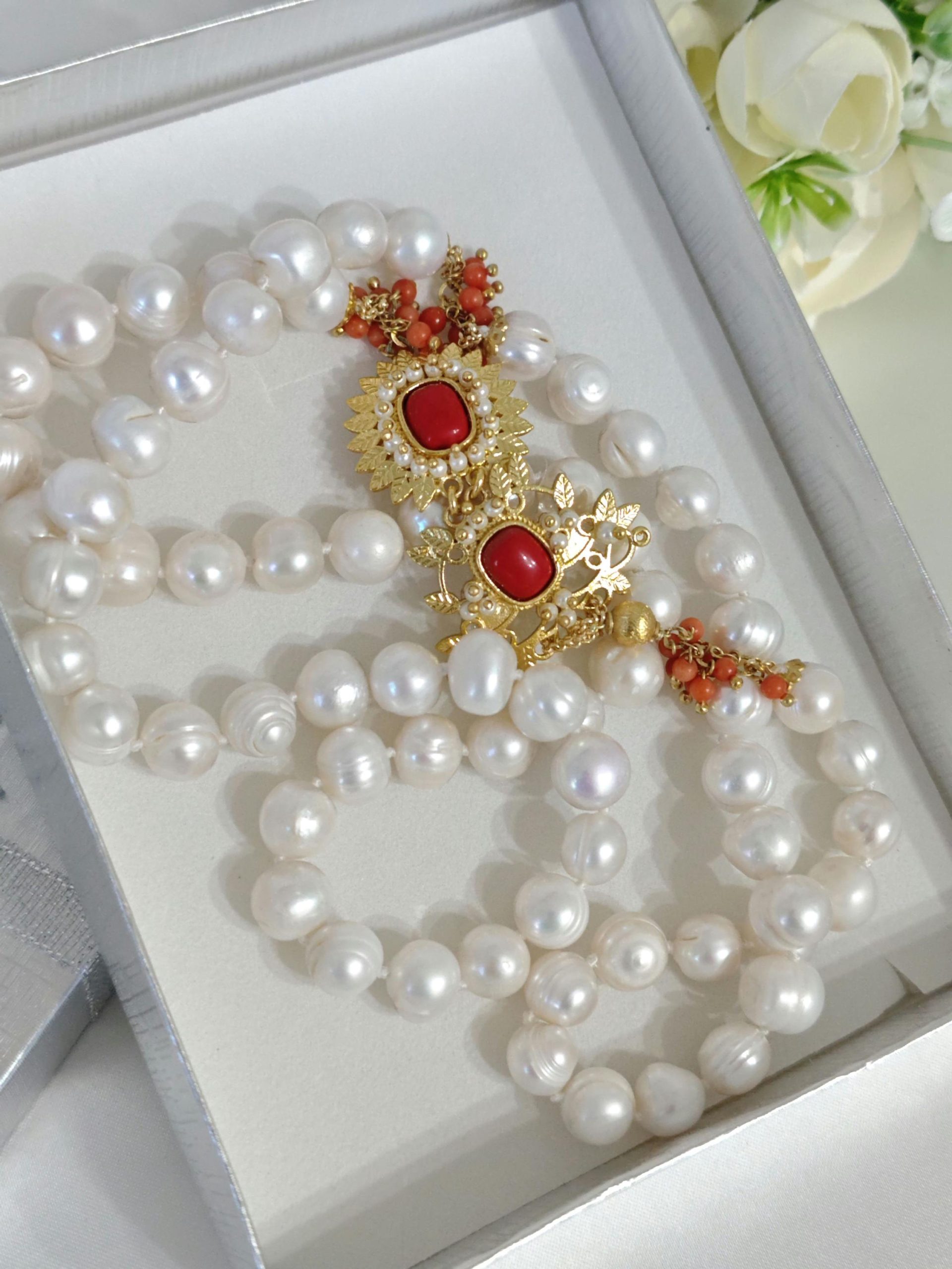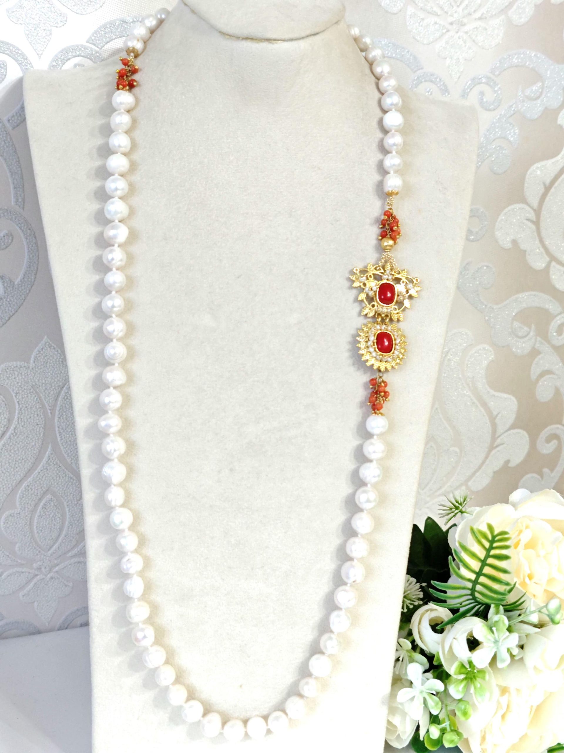 Collana lunga annodata a mano con perle naturali bianche 10 mm e con perline corallo rosso bambù e con elemento laterale placcato oro decorato con perline, lunghezza collana 80 cm