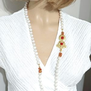 Collana perle bianche con corallo rosso, collana lunga, gioielli italiani
