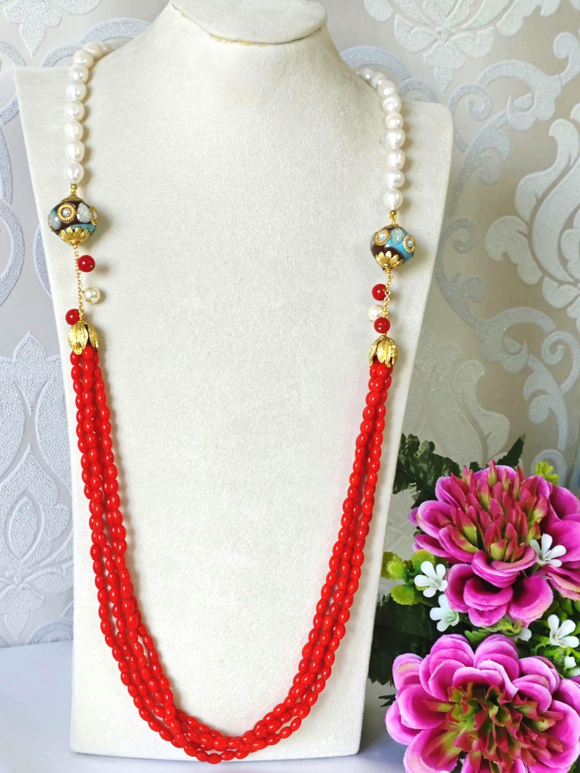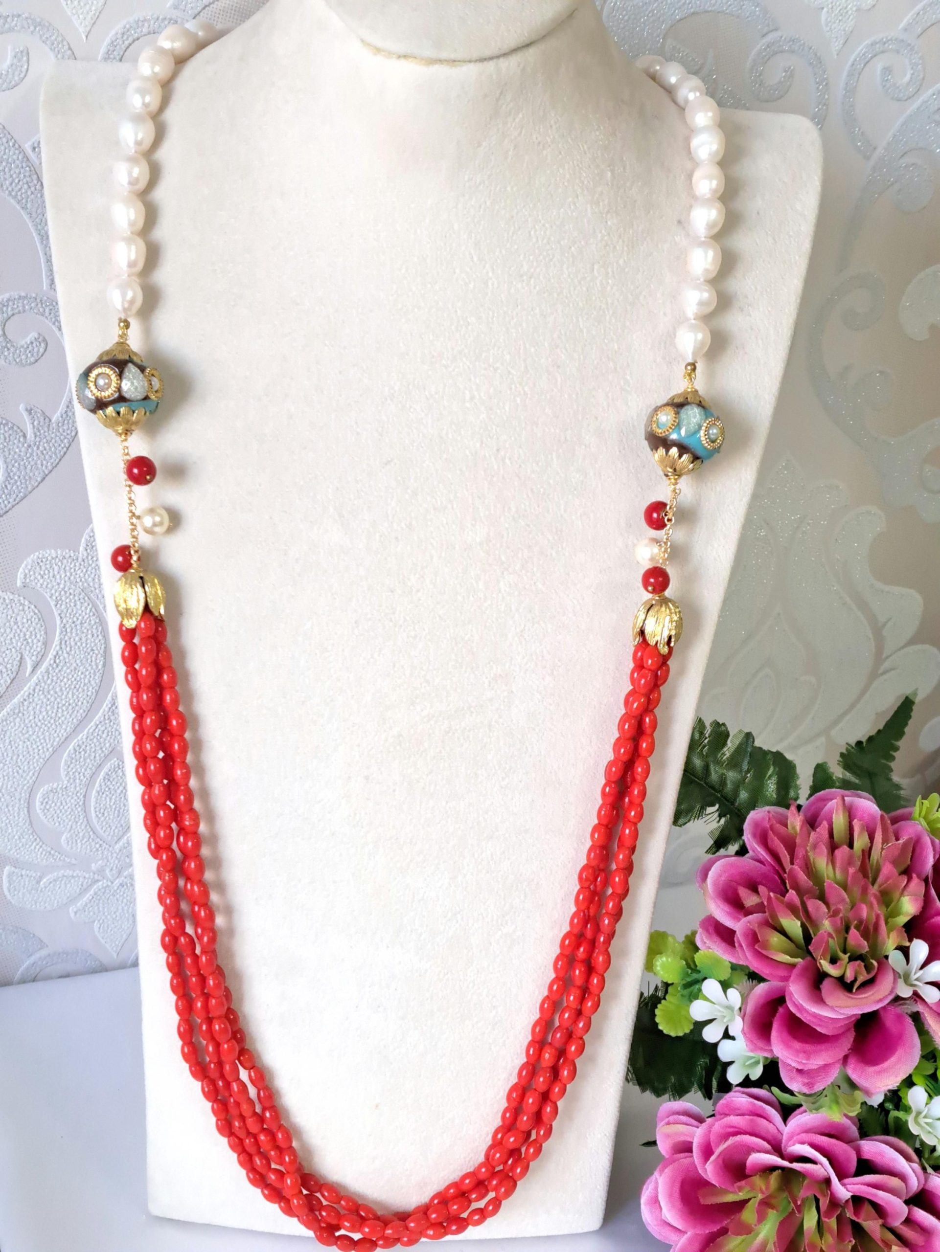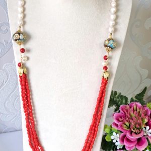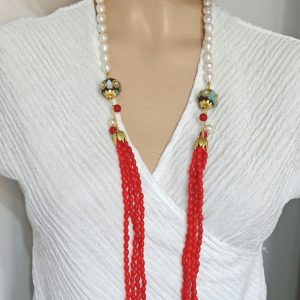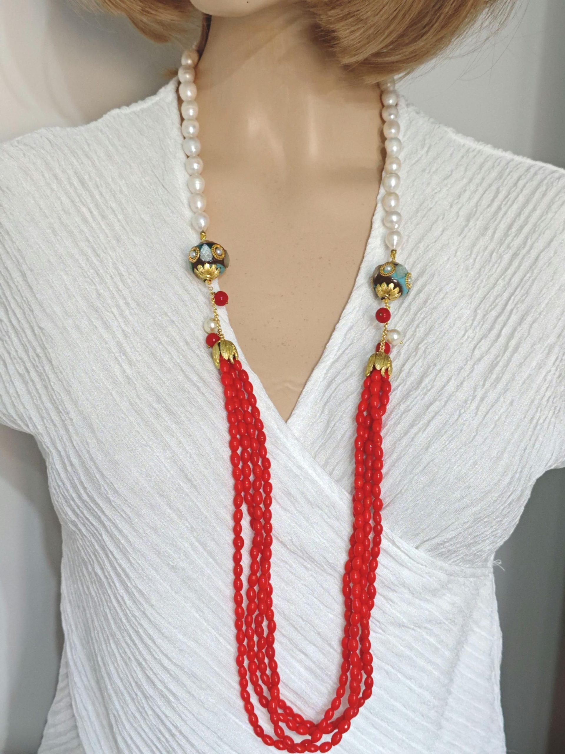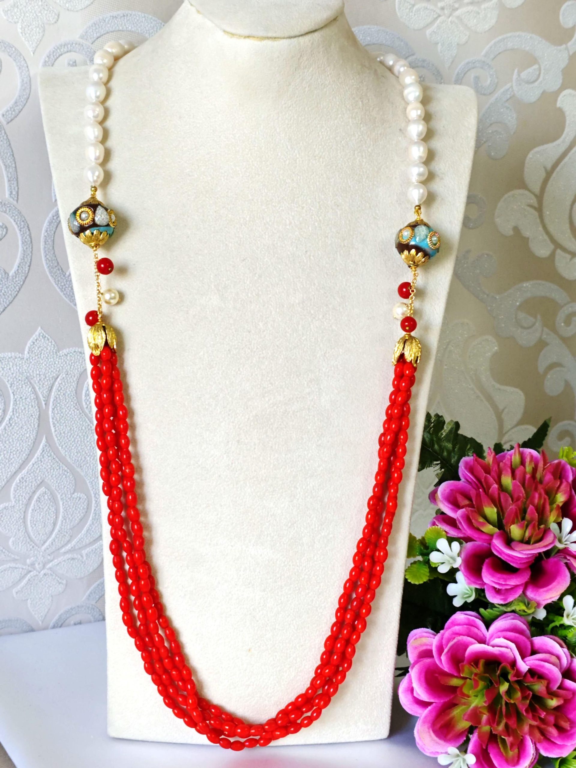 Collana lunga realizzata con perle bianche naturali annodate a mano , con 4 fili perline pasta dii corallo rosso imitazione e con 2 perle fantasia laterali.