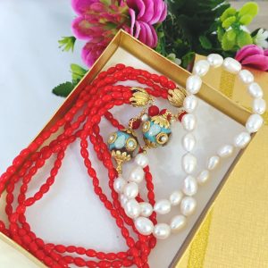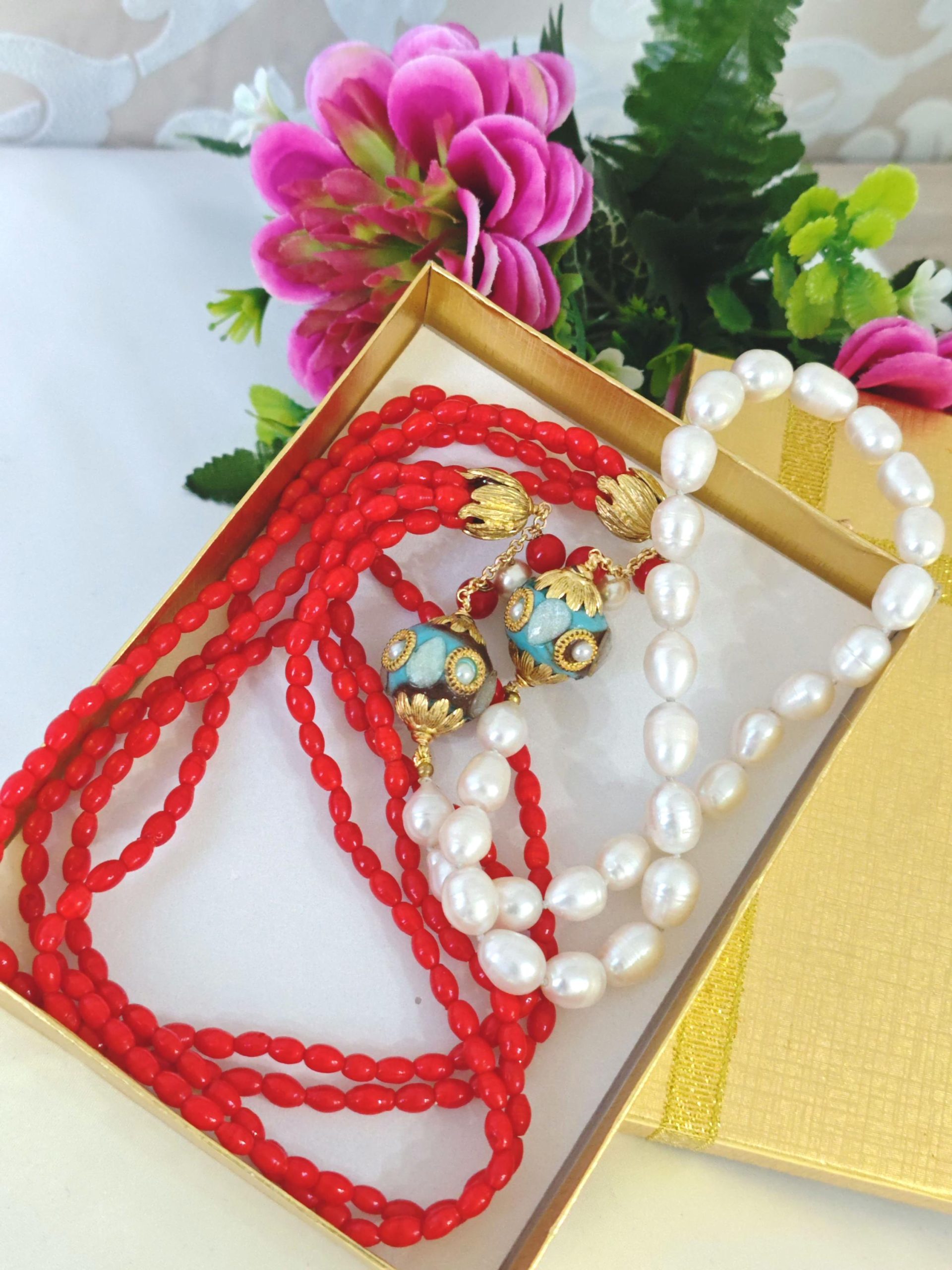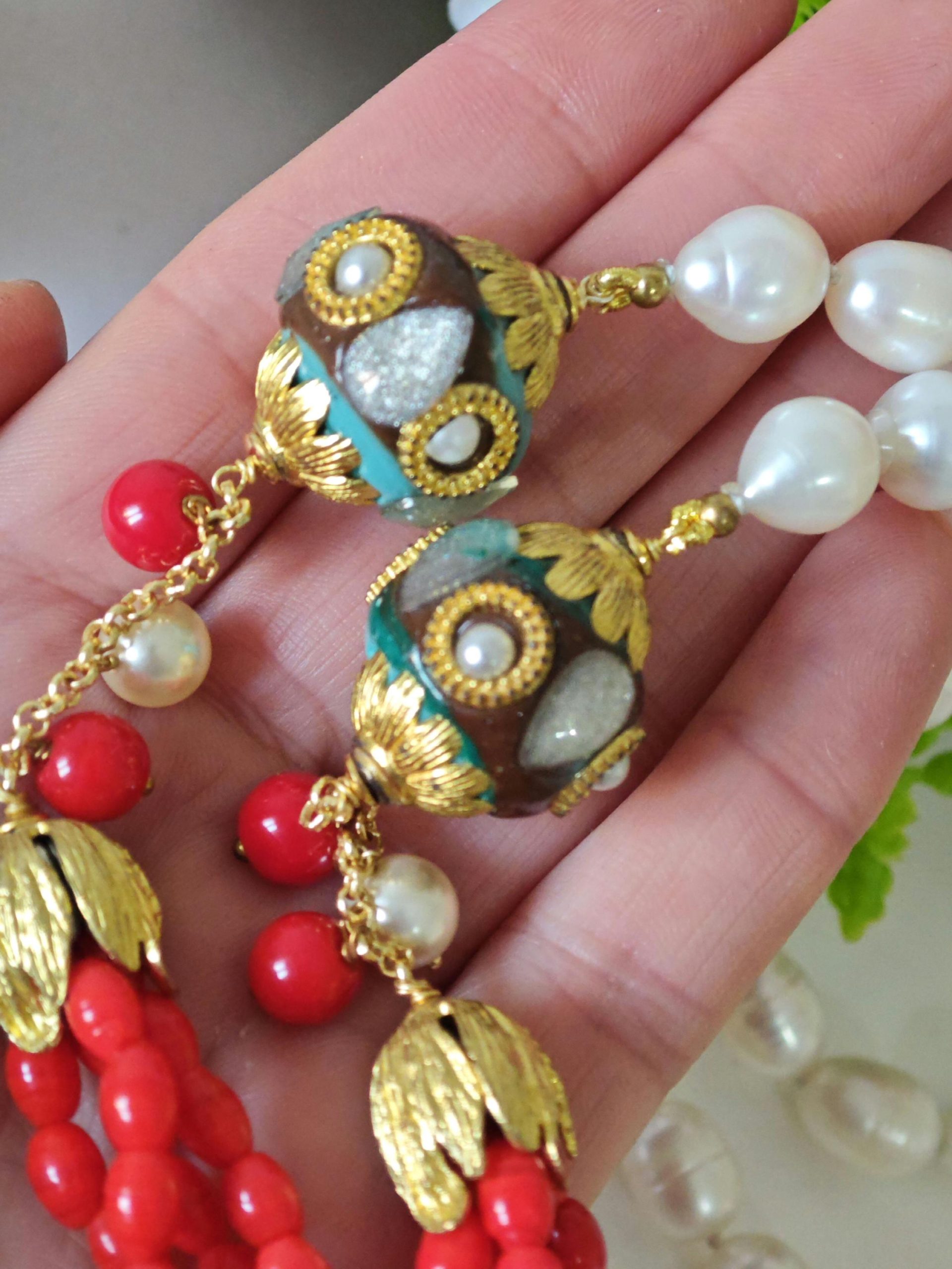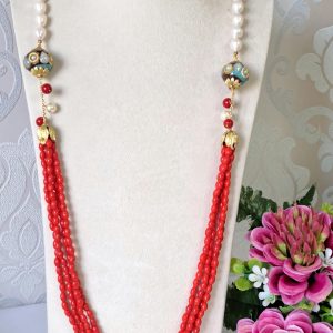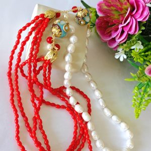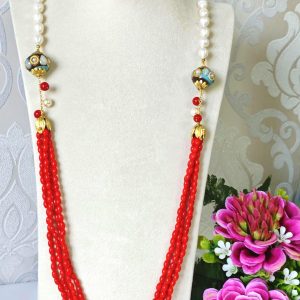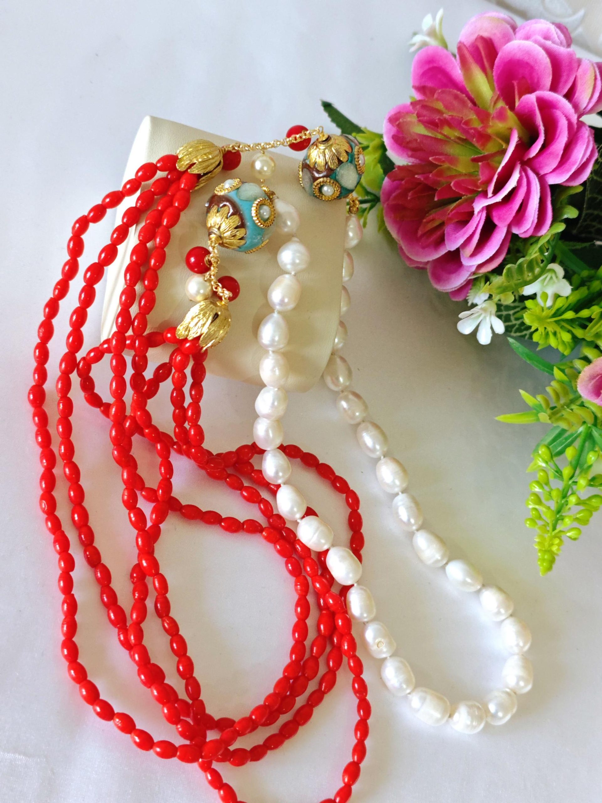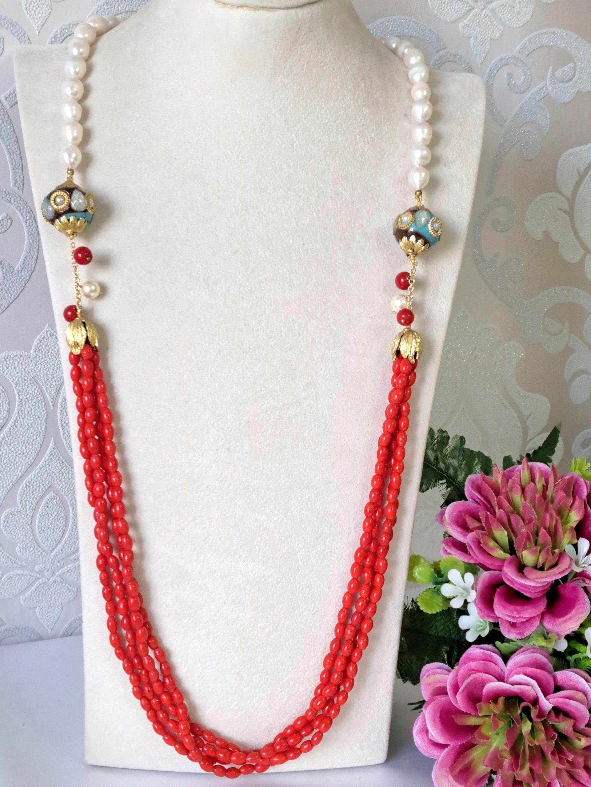 Collana lunga realizzata con perle bianche naturali annodate a mano , con 4 fili perline pasta dii corallo rosso imitazione e con 2 perle fantasia laterali.