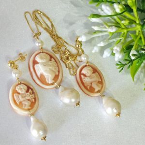 Set collana con orecchini  cammeo conchiglia con  perle barocche bianche in argento 925 placcato oro , gioielli italiani