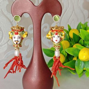 Orecchini teste di moro in ceramica di Caltagirone, perle bianche e corallo rosso naturale, orecchini siciliani