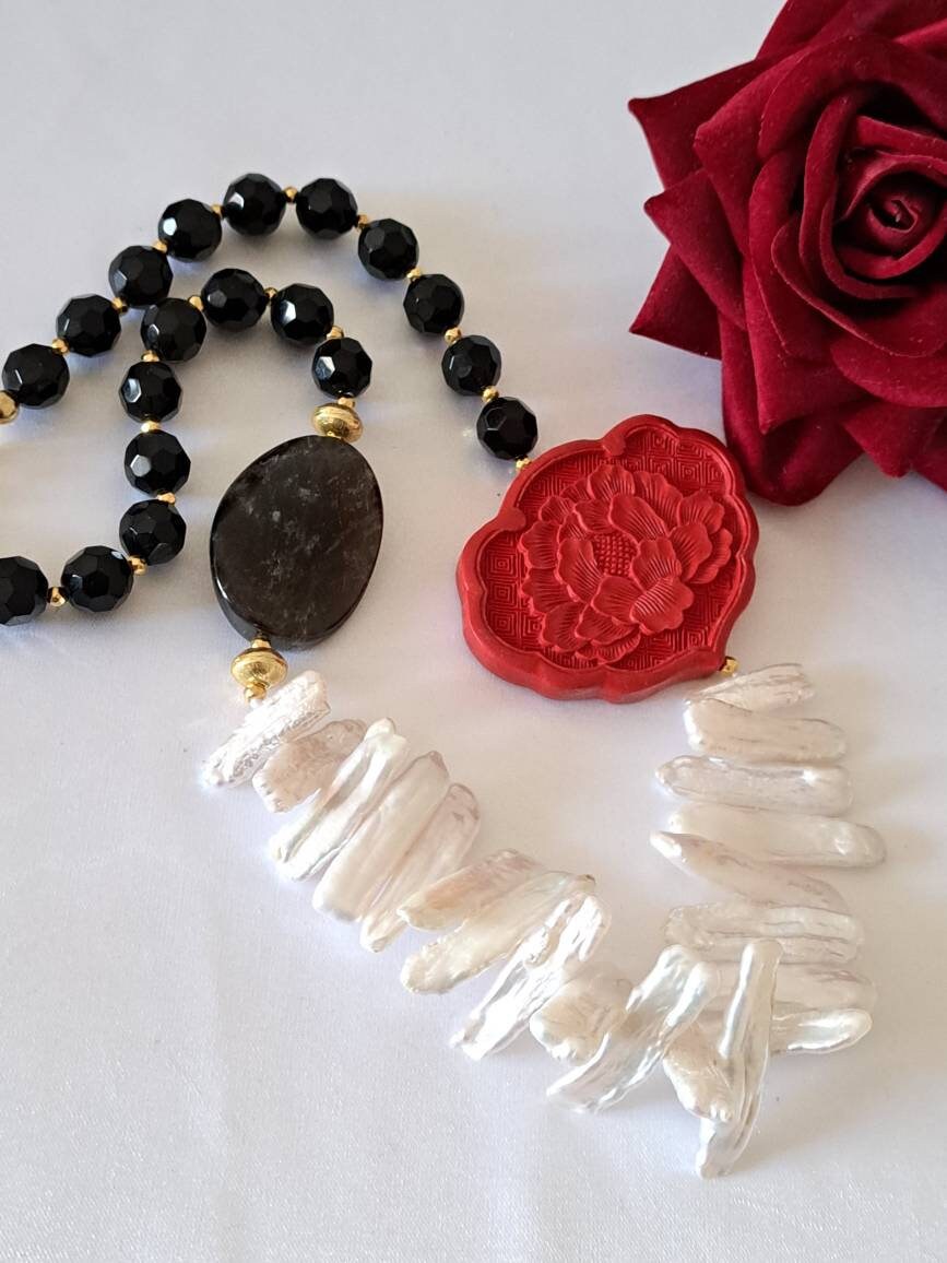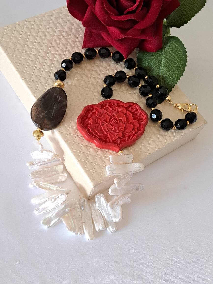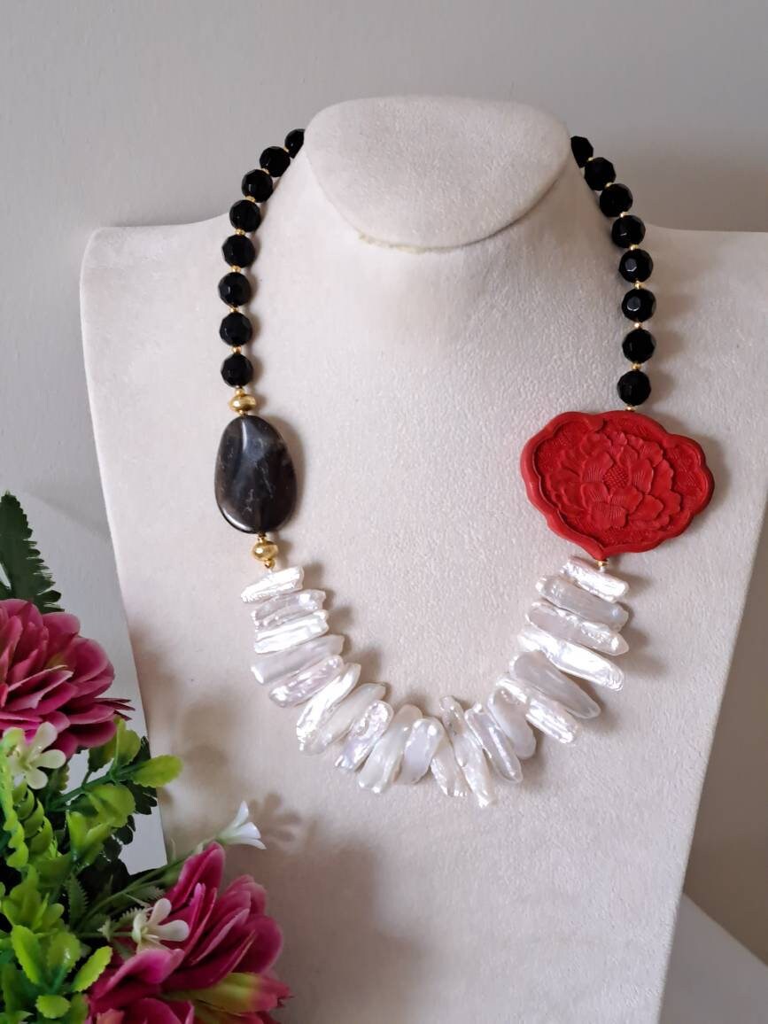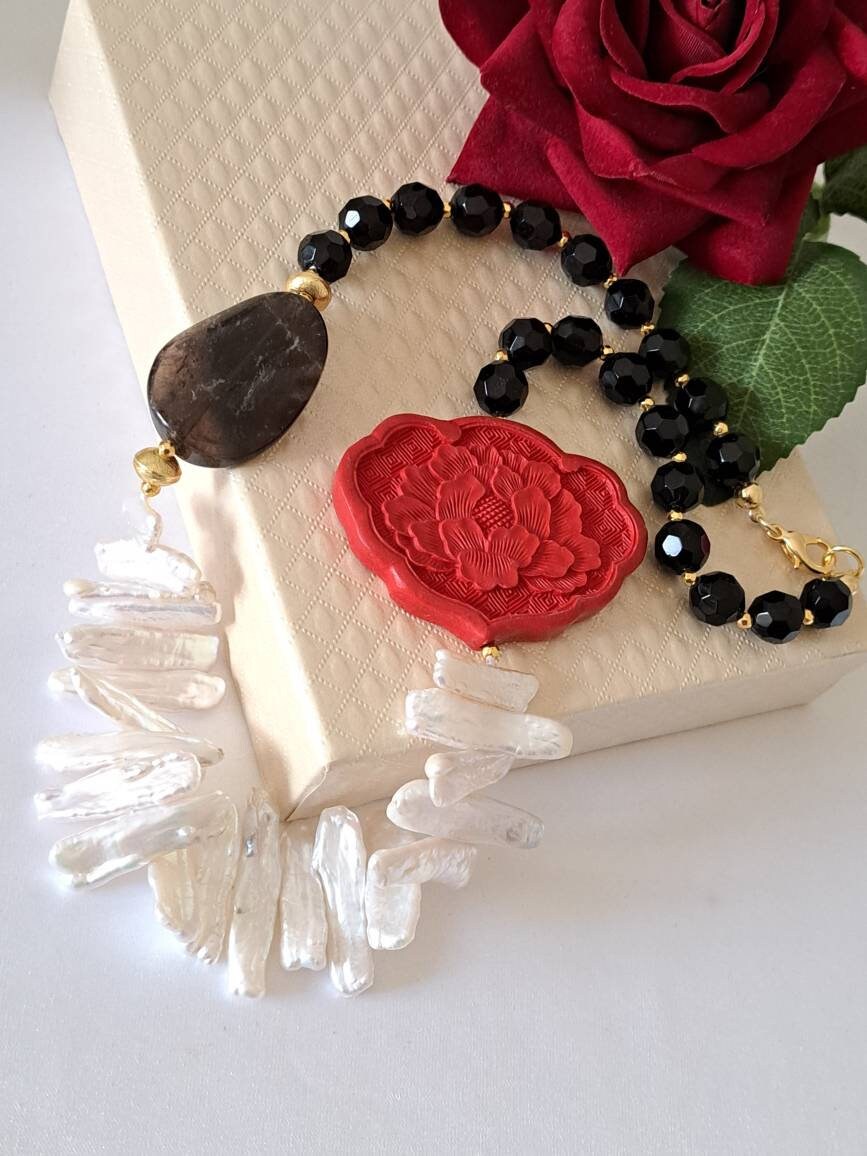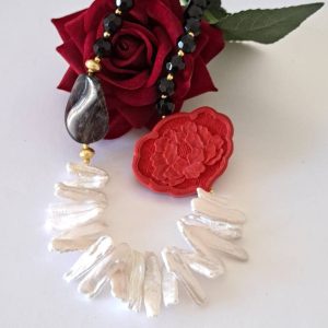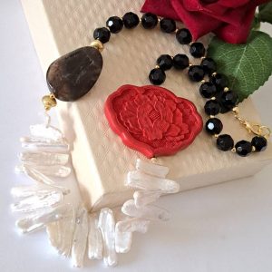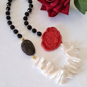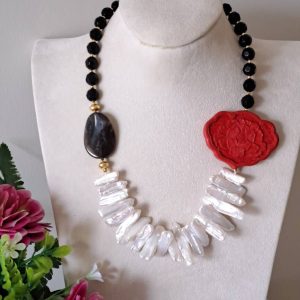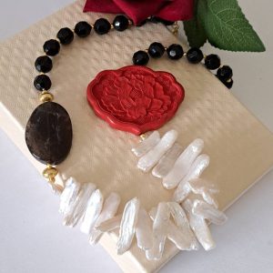 Categoria: Collane Perle Tag: collana_cinabro, collana_girocollo, collana_onice, collana_perle, collana_pietre_dure, lacca_cinese, perle_bianche, quarzo_fume