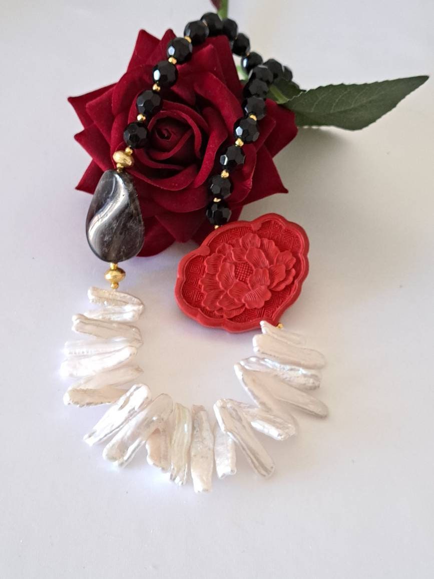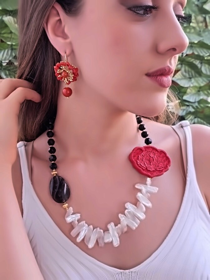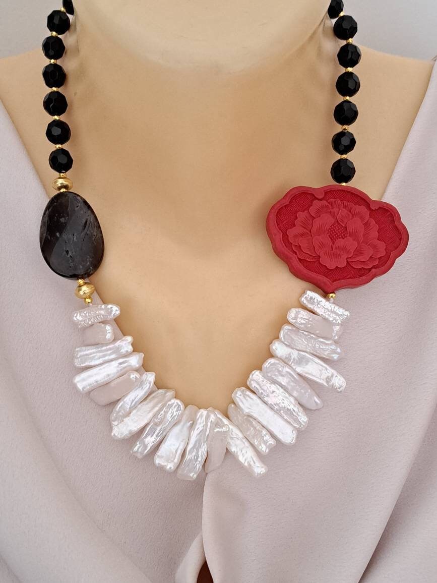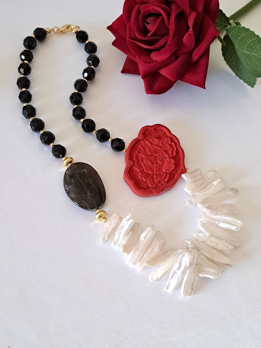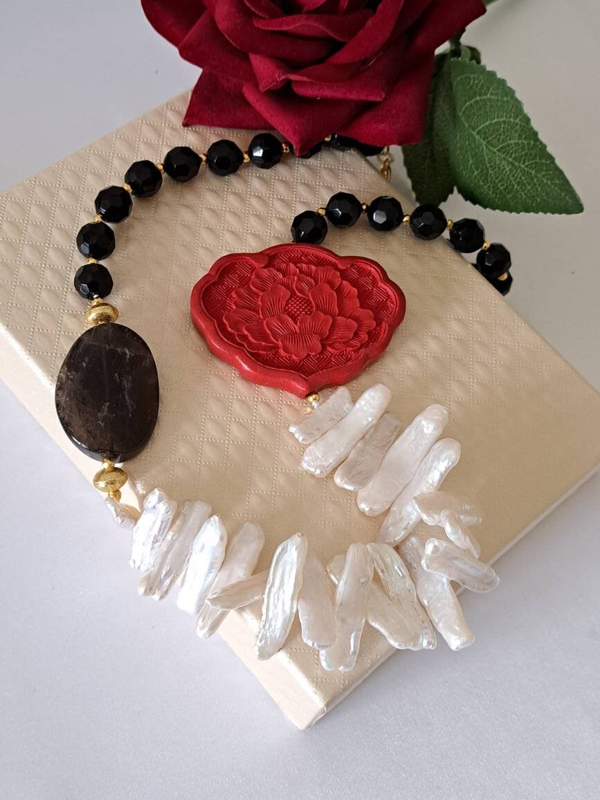 Categoria: Collane Perle Tag: collana_cinabro, collana_girocollo, collana_onice, collana_perle, collana_pietre_dure, lacca_cinese, perle_bianche, quarzo_fume