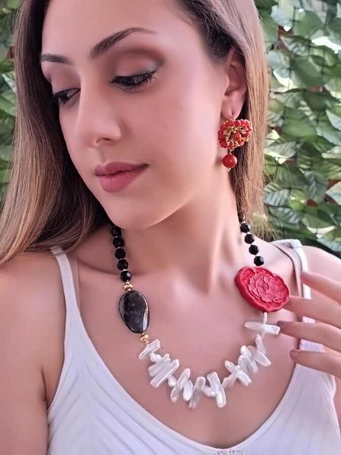 Collana girocollo realizzata con perle bianche e con pietre dure sfaccettate onice nero 10 mm, laterale in cinabro rosso e pietra quarzo fume , pendente in onice nero , chiusura a moschettone in ottone dorato .
