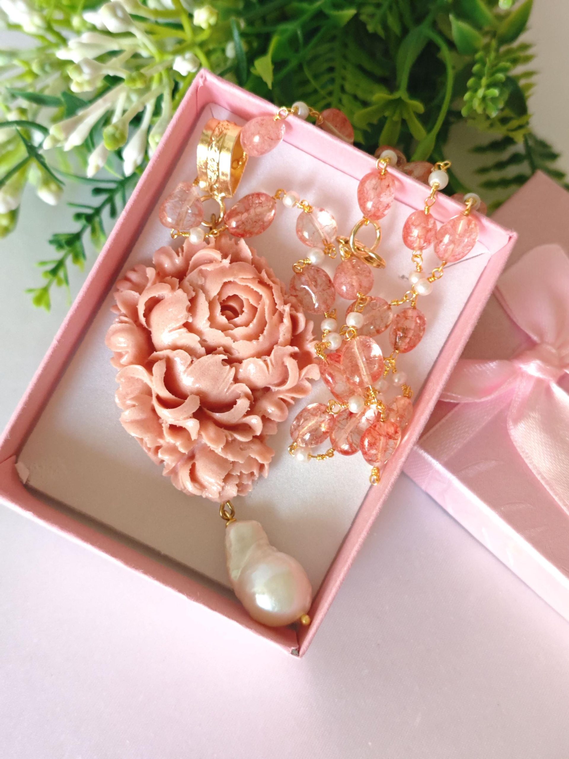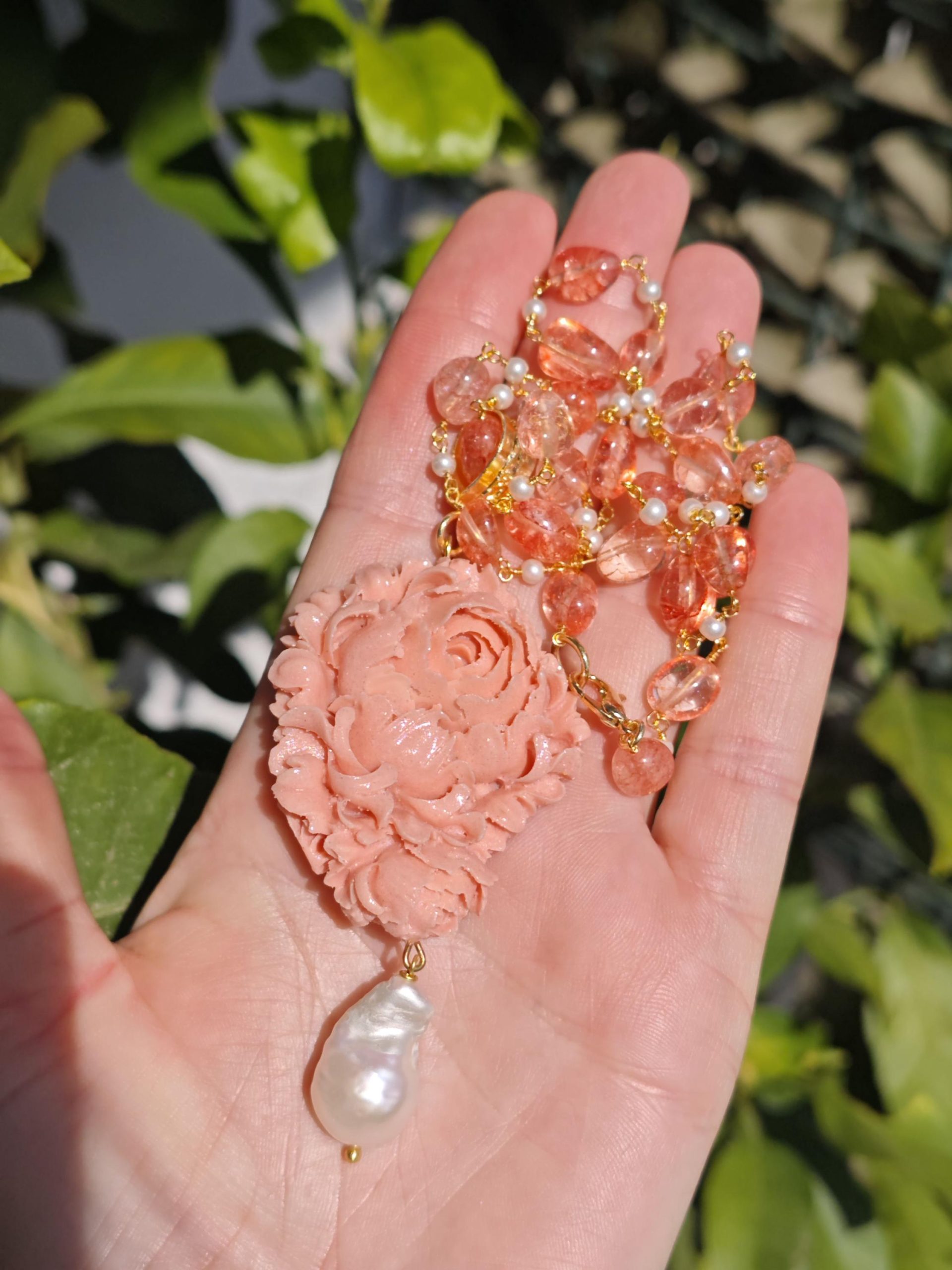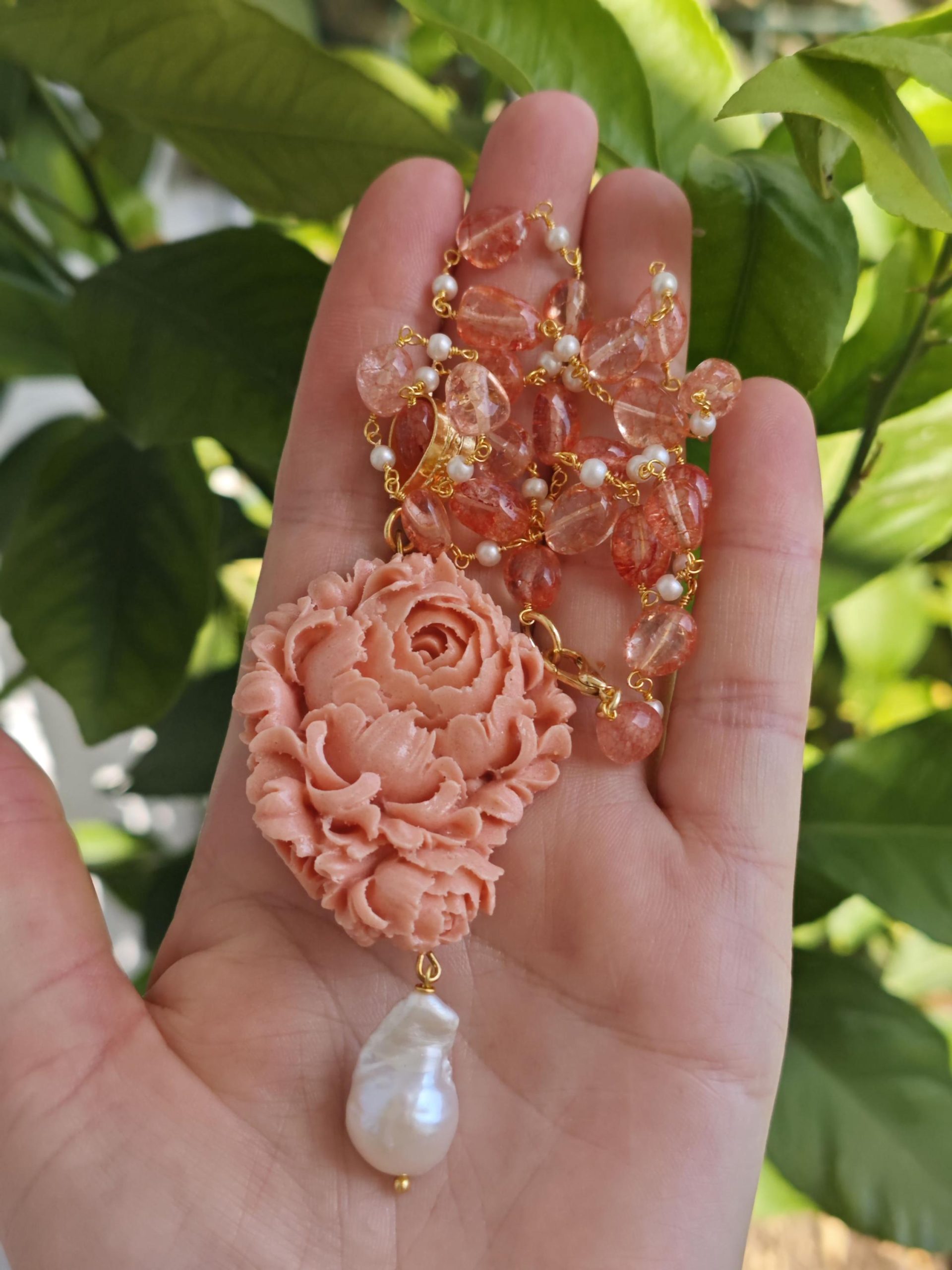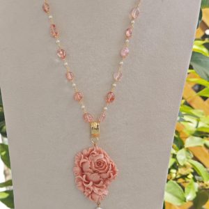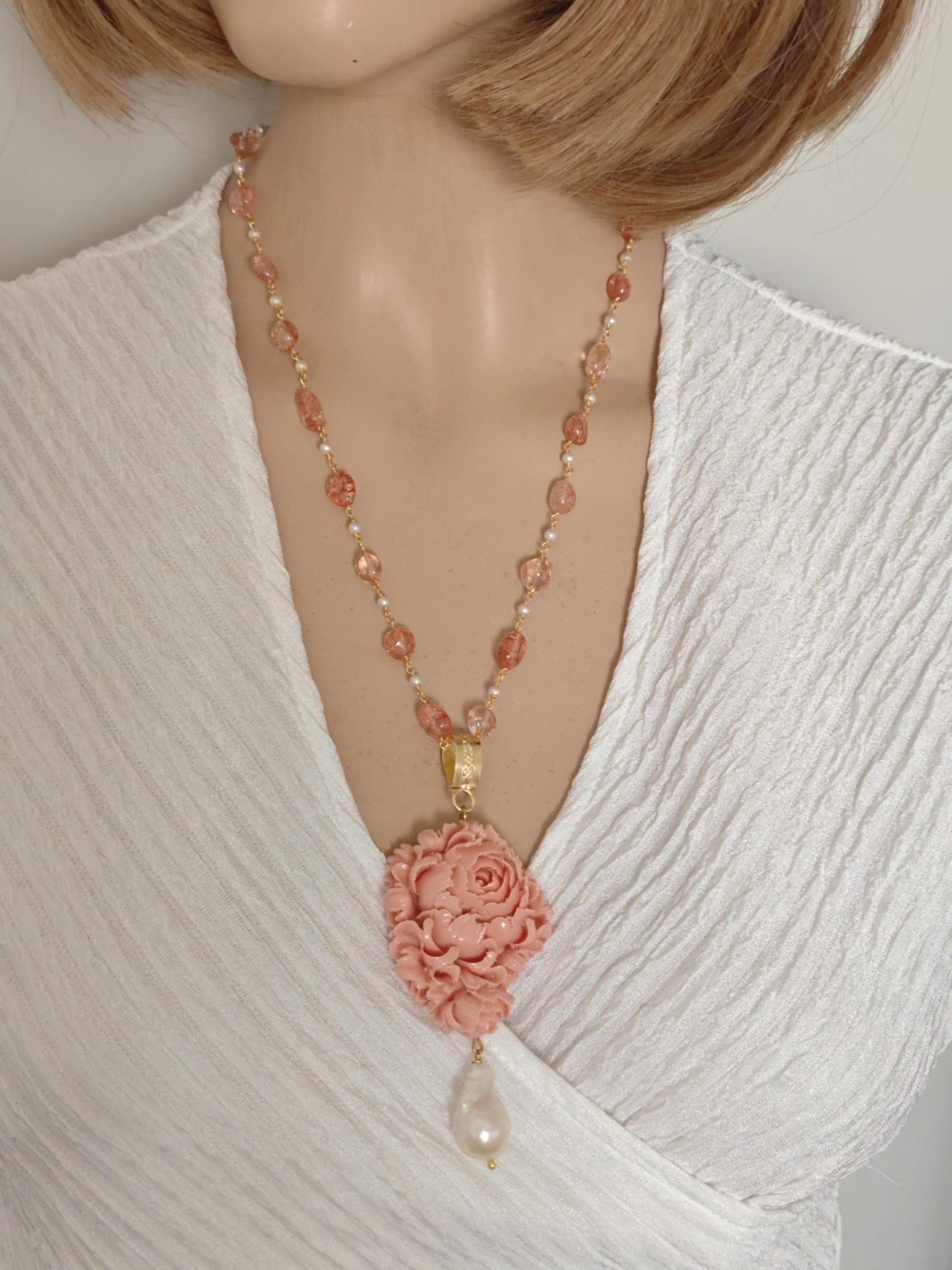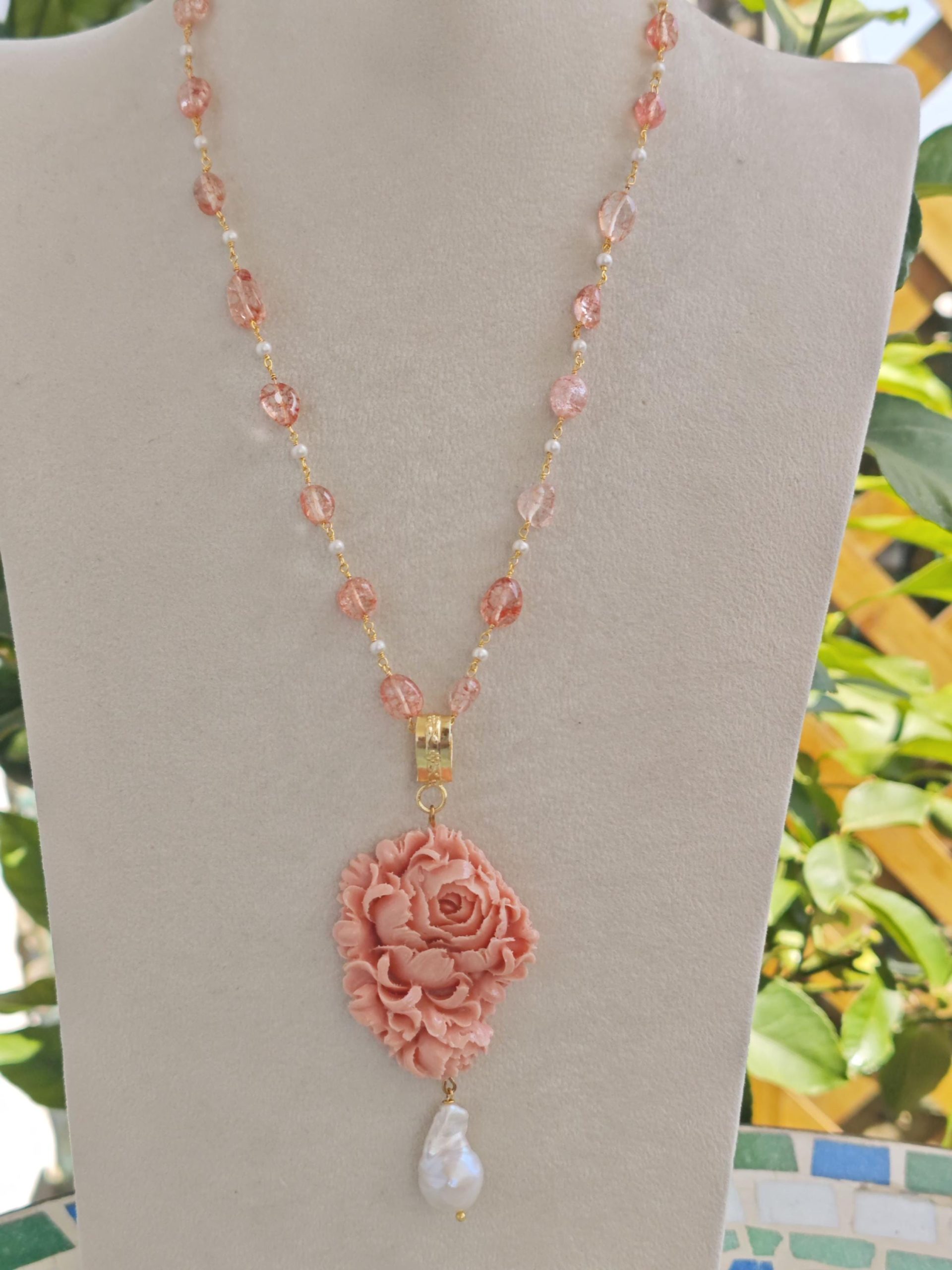 Collana realizzata con catena stile rosario con perle naturali bianche e quarzo rosa fragola con pendente fiore rosa in pasta di corallo rosa realizzata a mano a Torre del greco 5×4 cm dimensioni e perla barocca bianca.