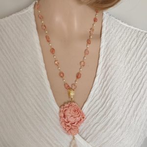 Collana perle bianche e pietre quarzo rosa con pendente rosa pasta di corallo, gioielli italiani