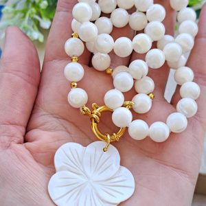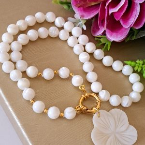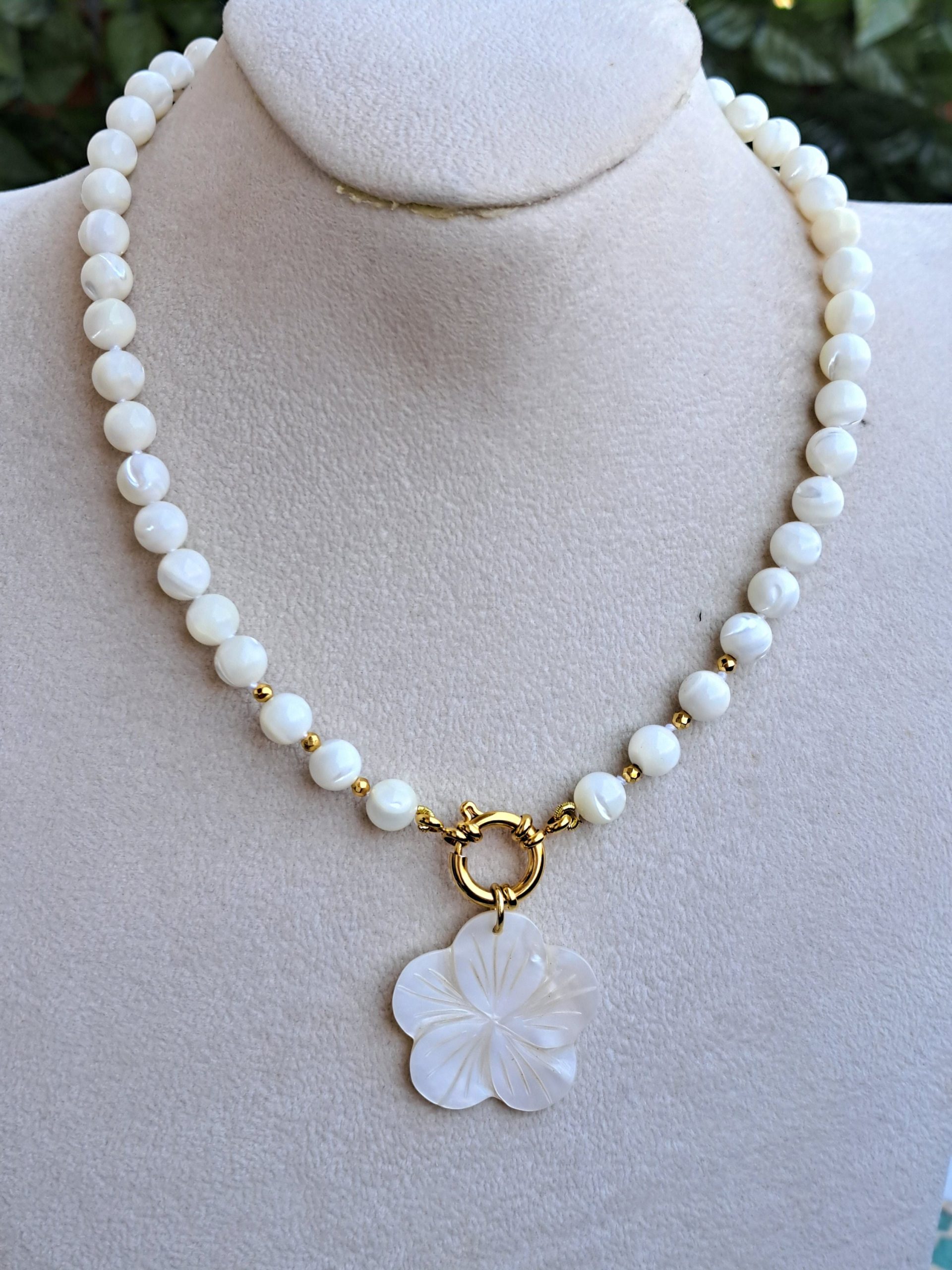Collana girocollo annodata a mano con perle in madreperla naturale 8 mm , chiusura moschettone marianaro in acciaio dorato con pendente fiore madreperla 3,3 cm diametro .