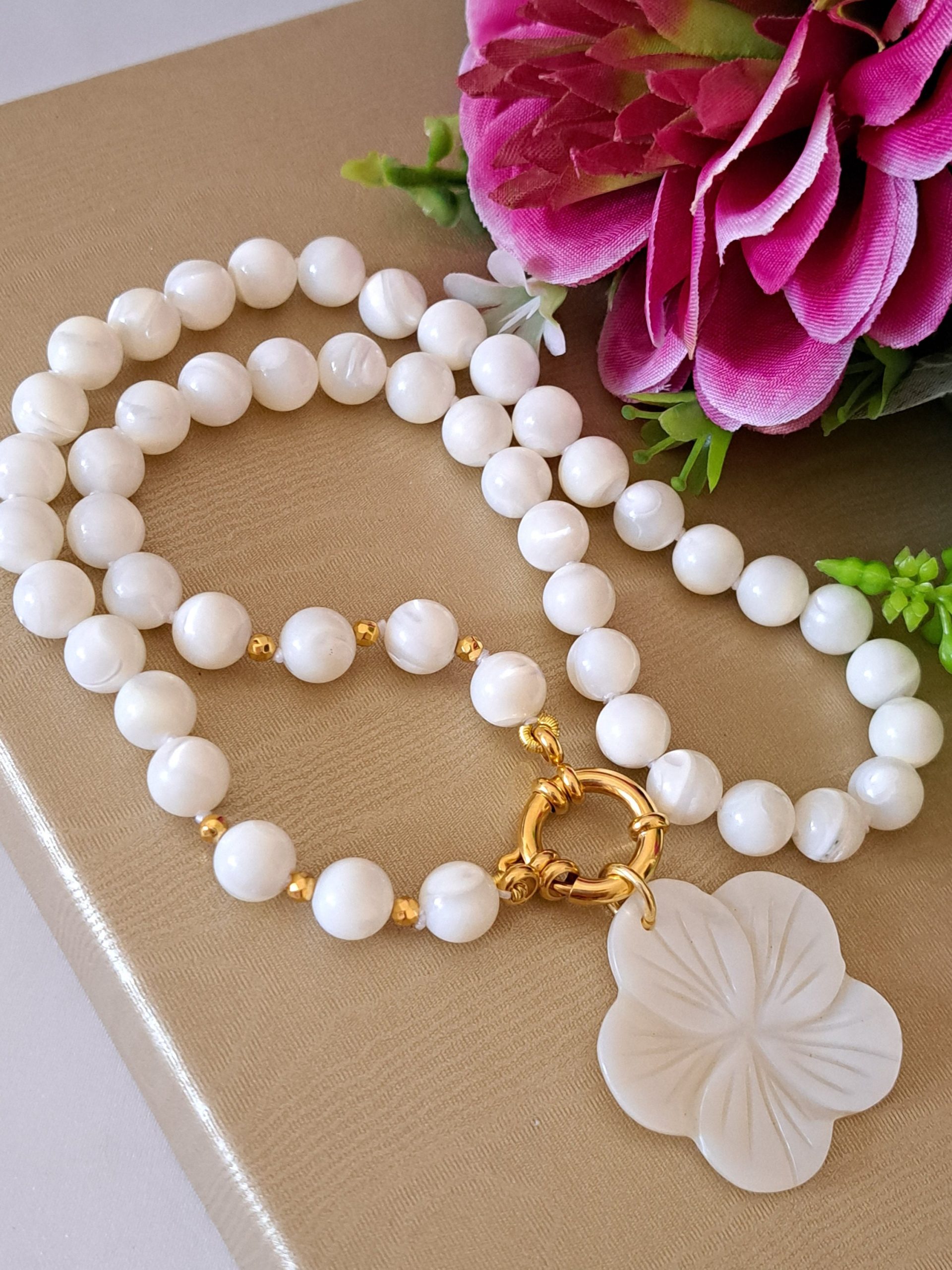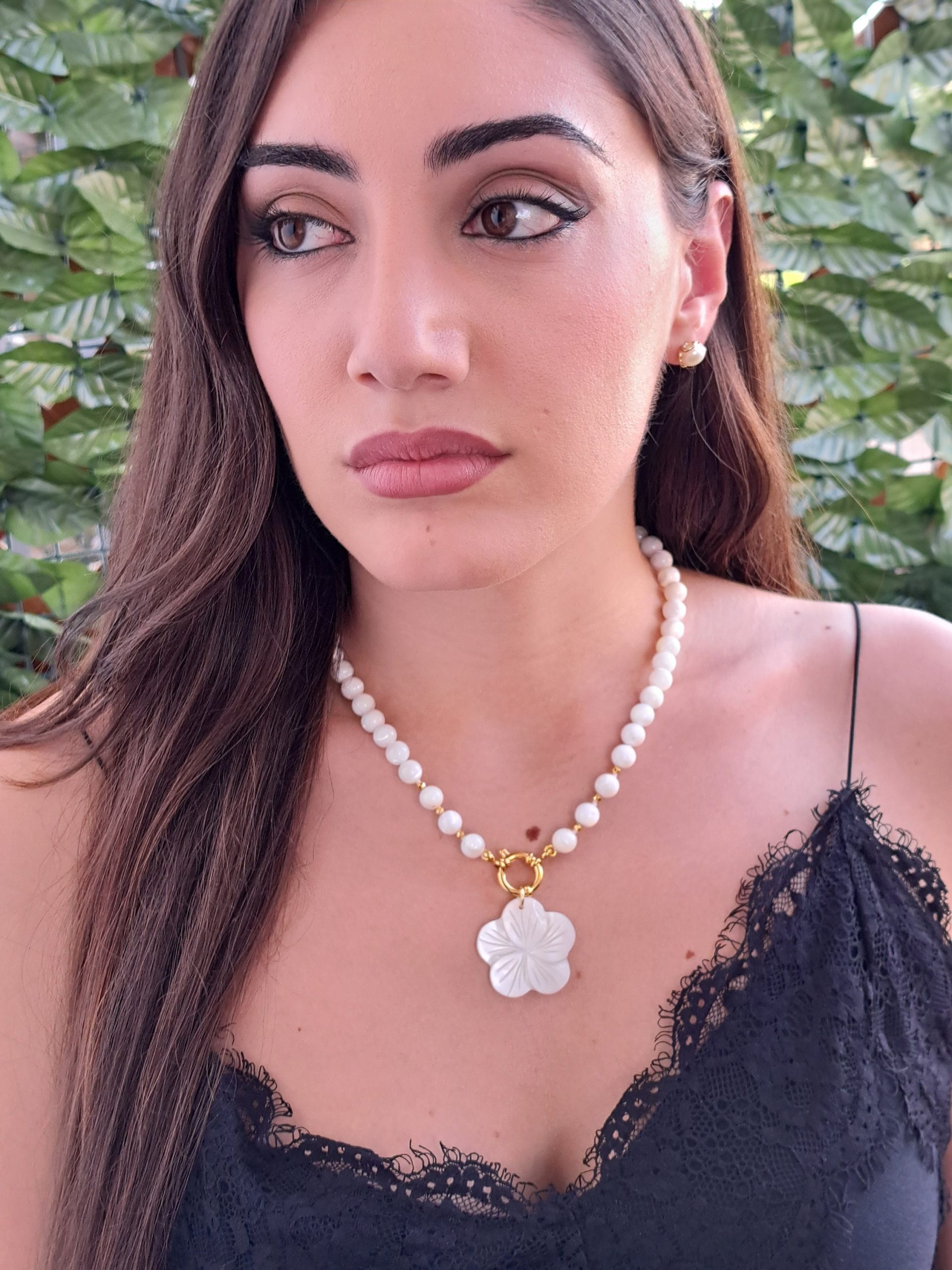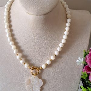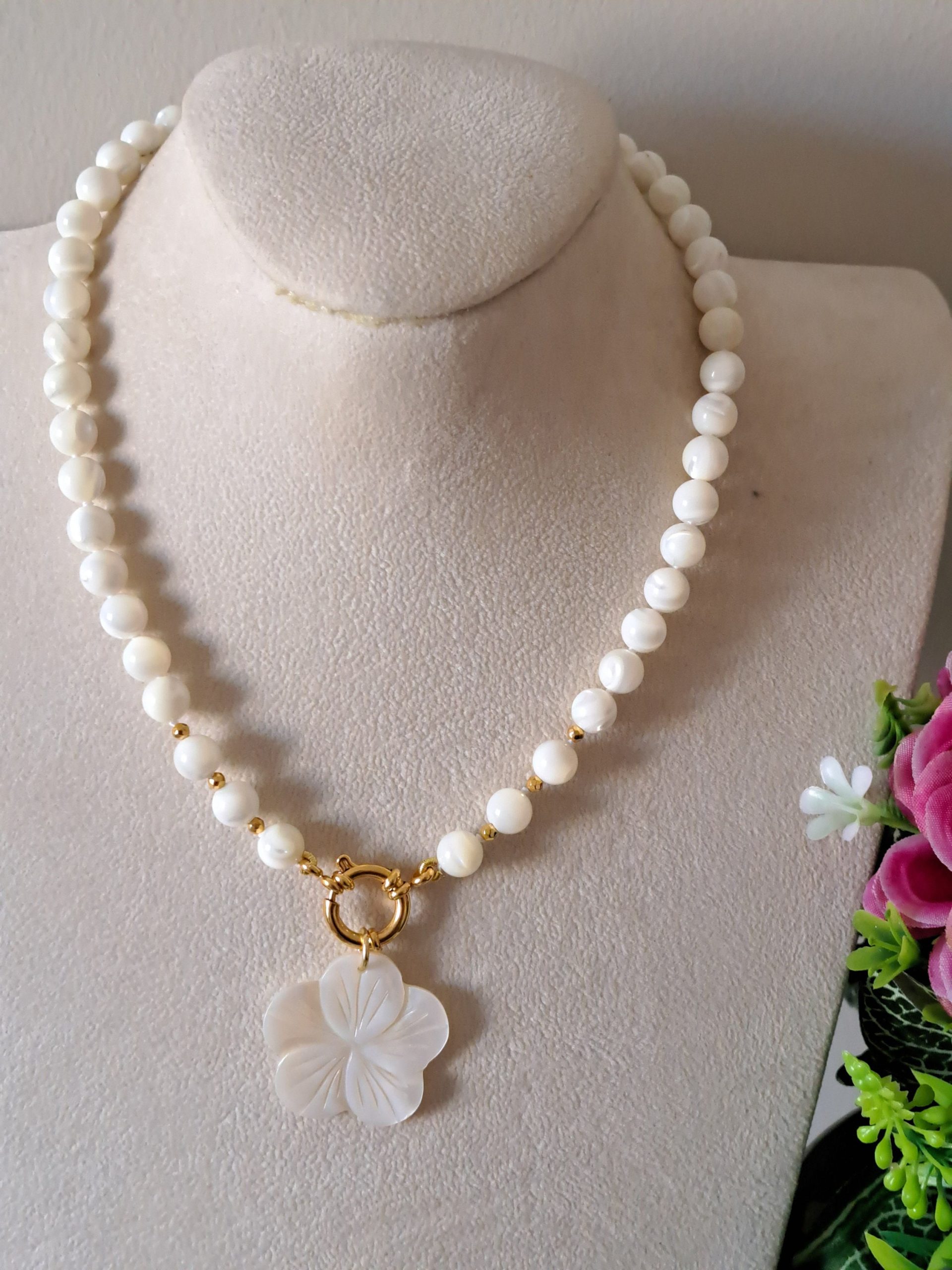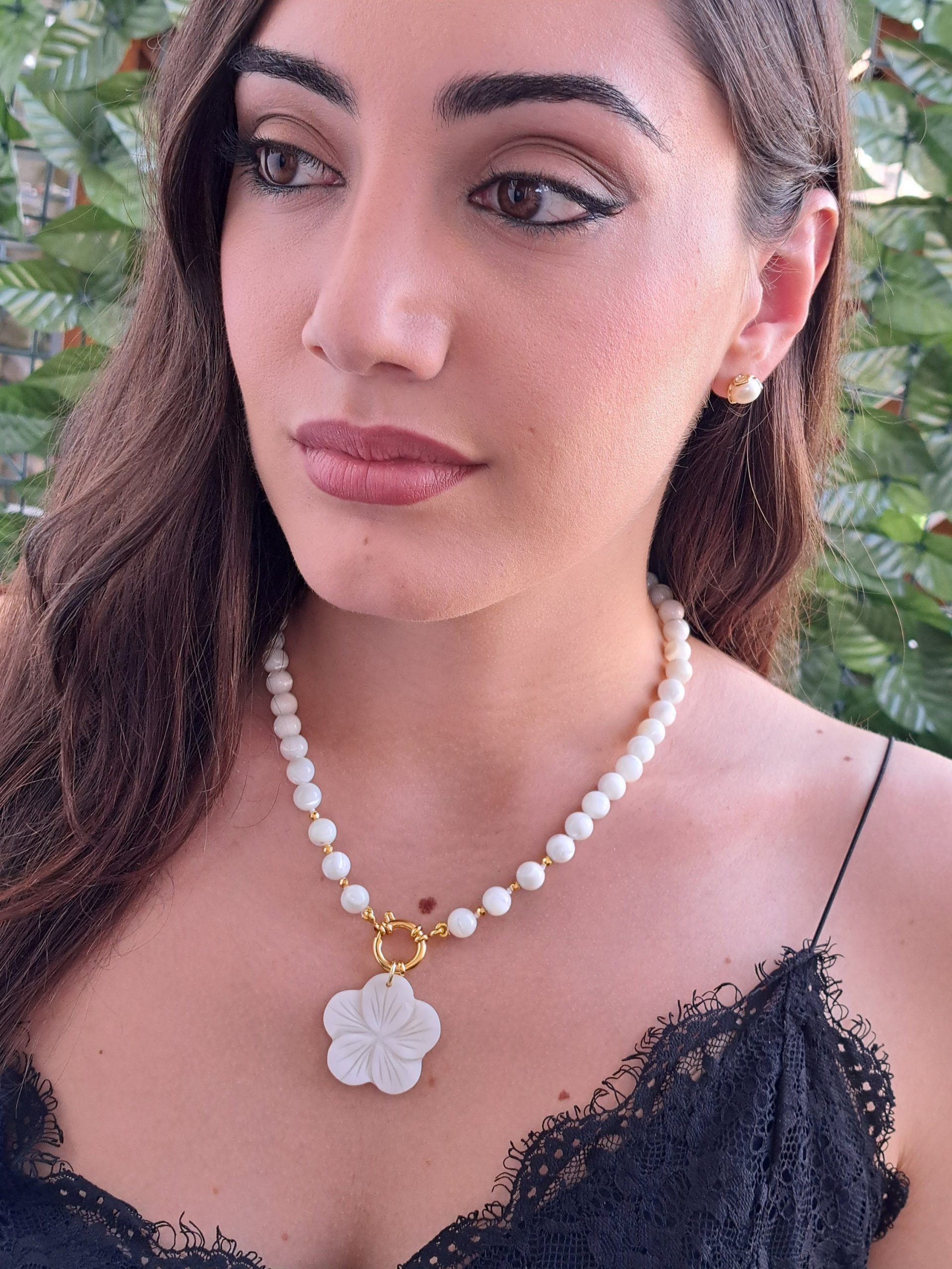 Collana perle bianche madreperla con fiore madreperla , collana girocollo moderna