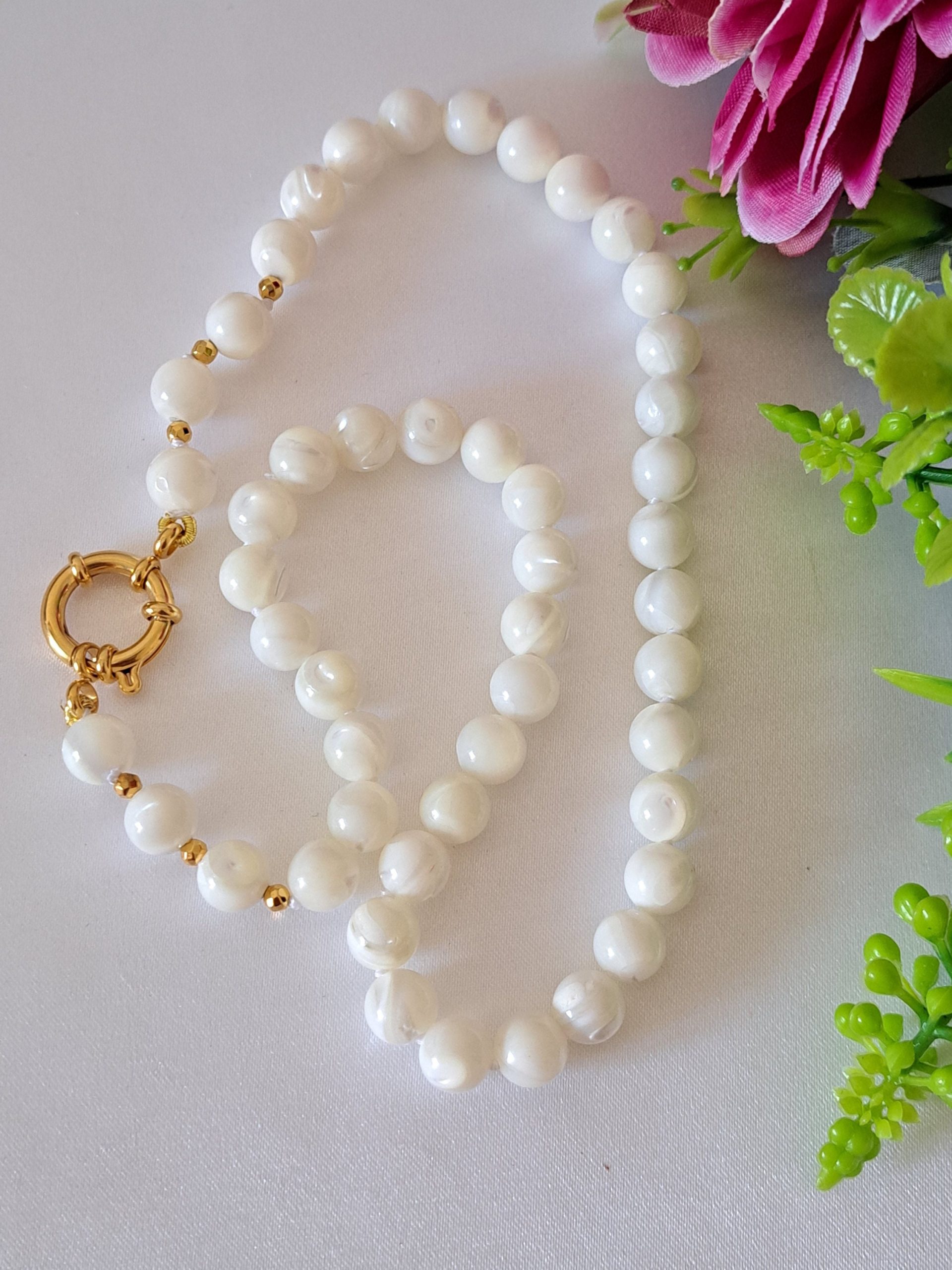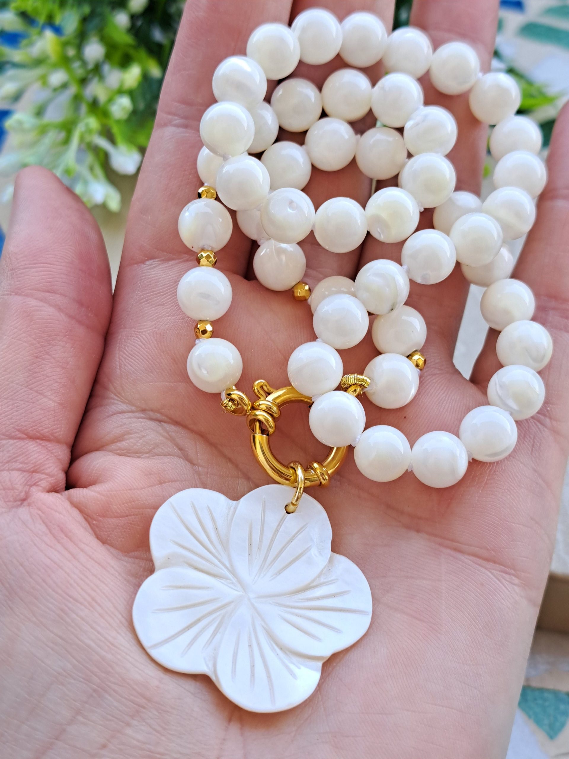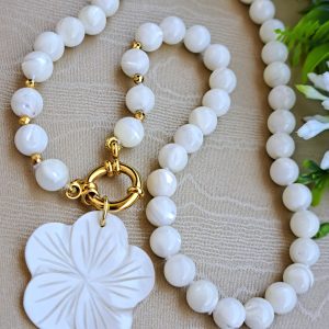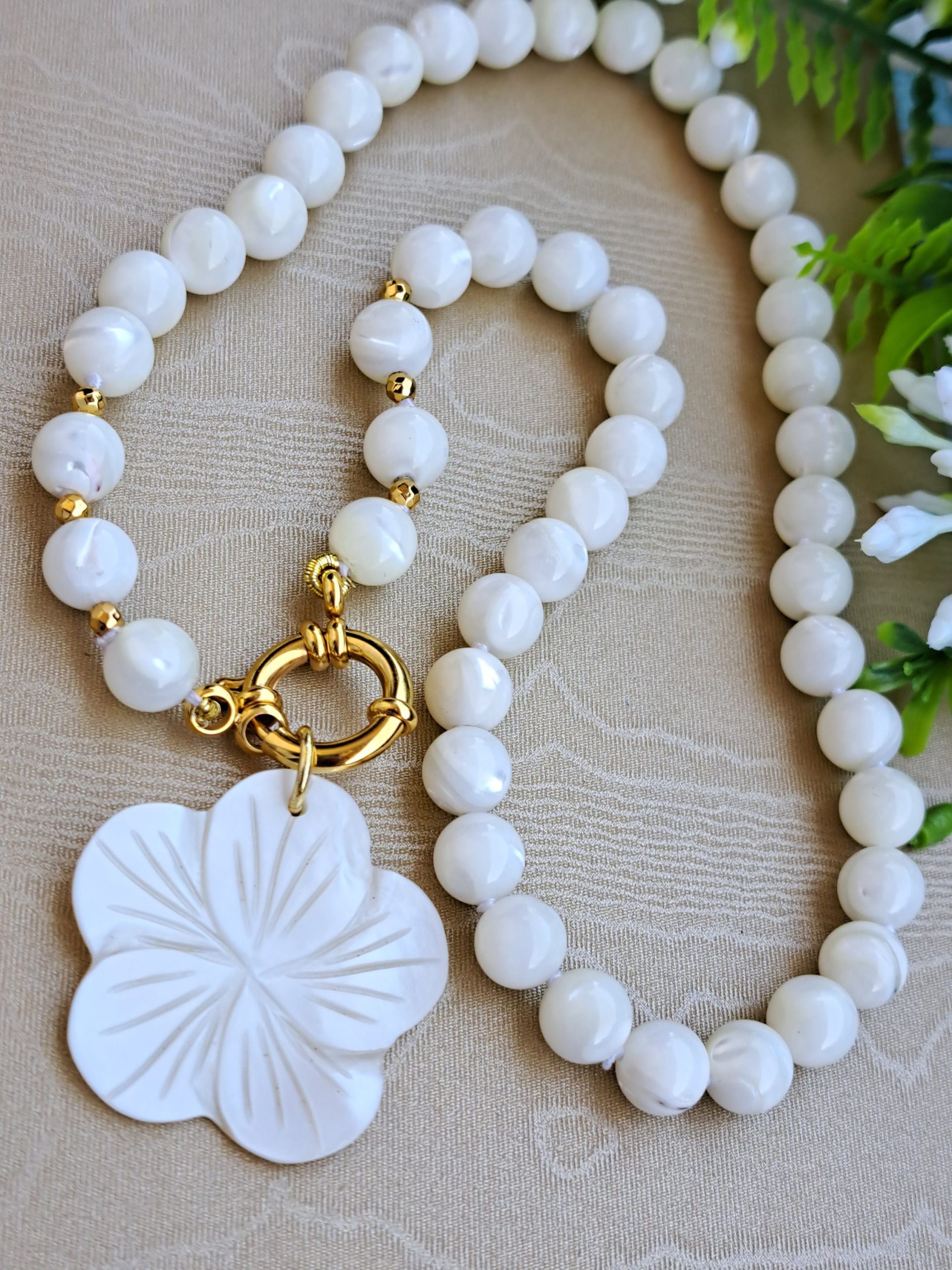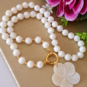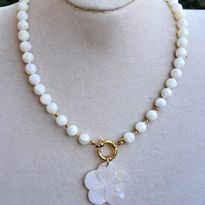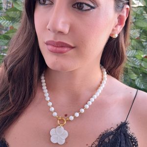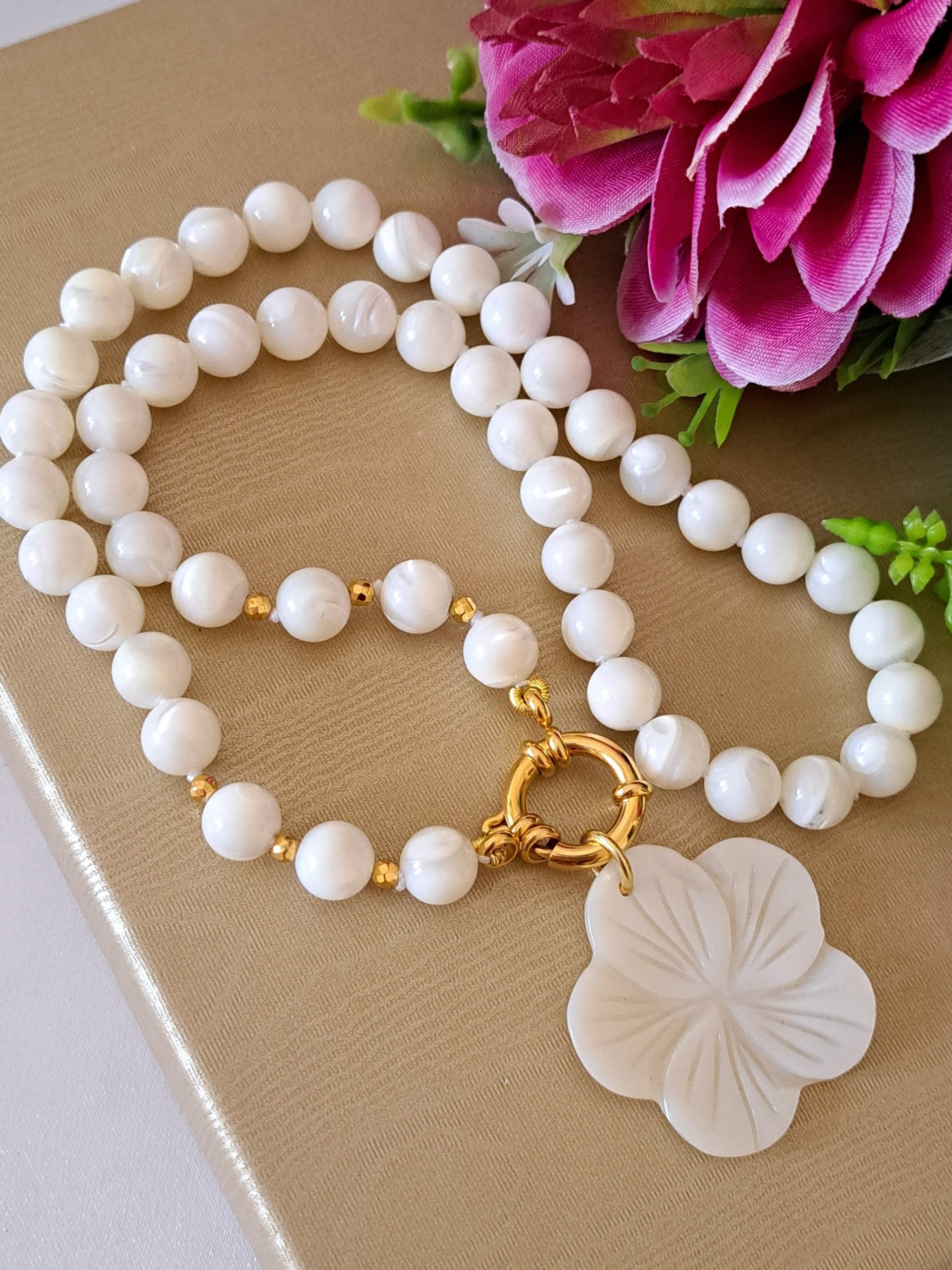 Collana perle bianche madreperla con fiore madreperla , collana girocollo moderna