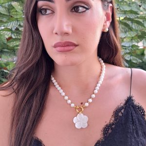 Collana perle bianche madreperla con fiore madreperla , collana girocollo moderna