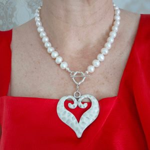 Collana perle bianche con cuore grande argentato , collana girocollo