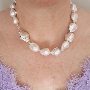 Collana girocollo perle barocche bianche con chiusura in argento 925 , gioielli italiani