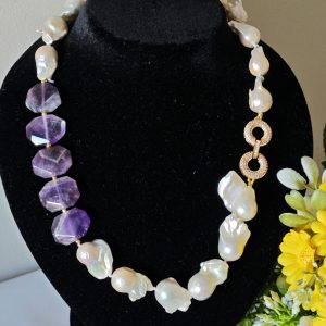 Collana girocollo perle barocche bianche con pietre dure ametista e chiusura gioiello con cristalli,  gioielli italiani