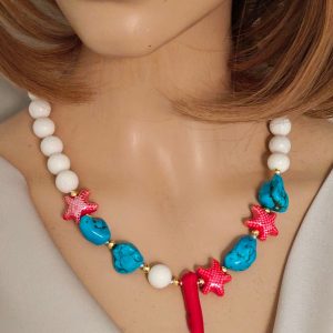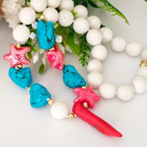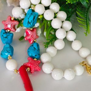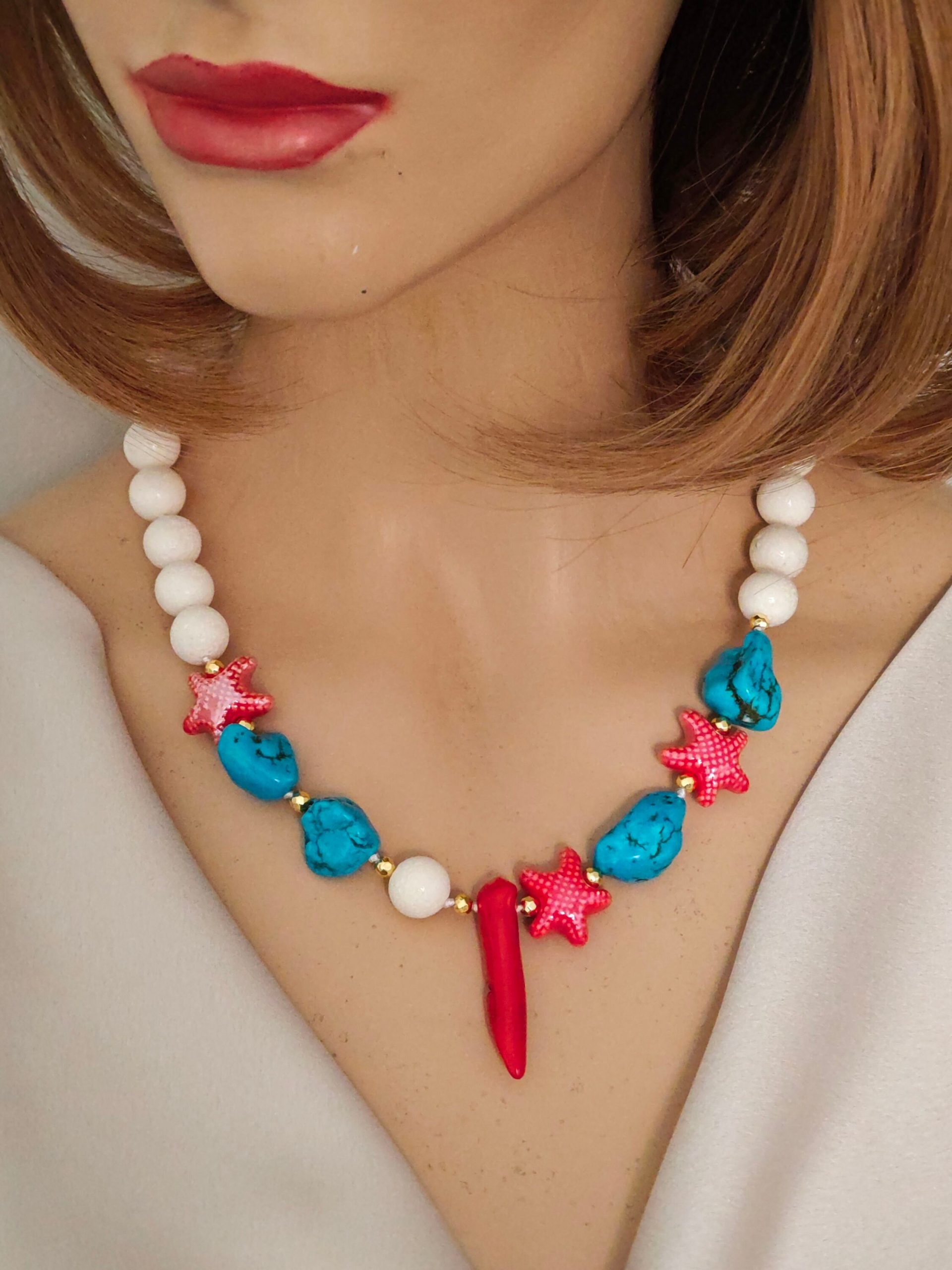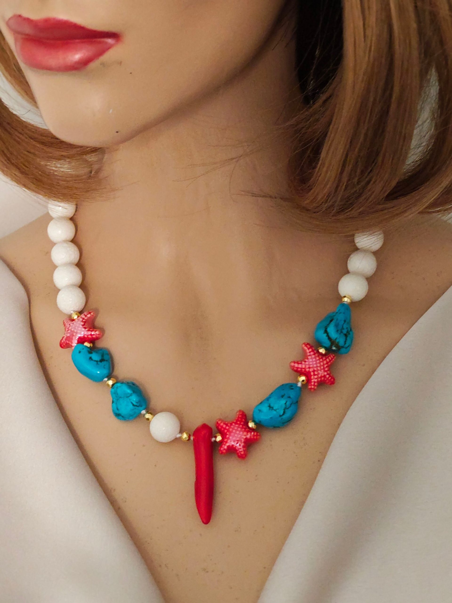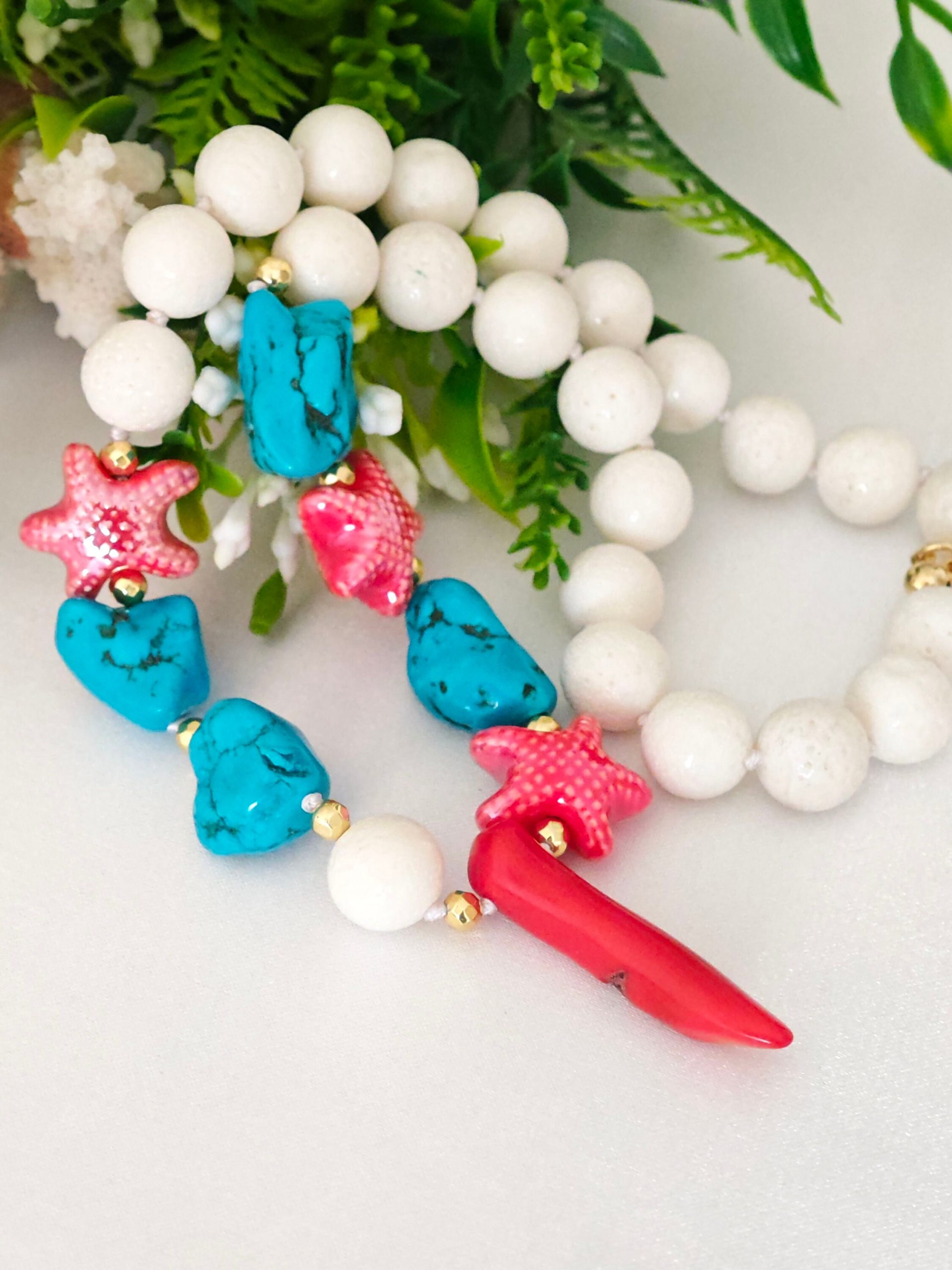 Collana annodata a mano con perle corallo bianco spugna, sassolini turchese , stelle marine in ceramica e cornetto corallo rosso bambù .