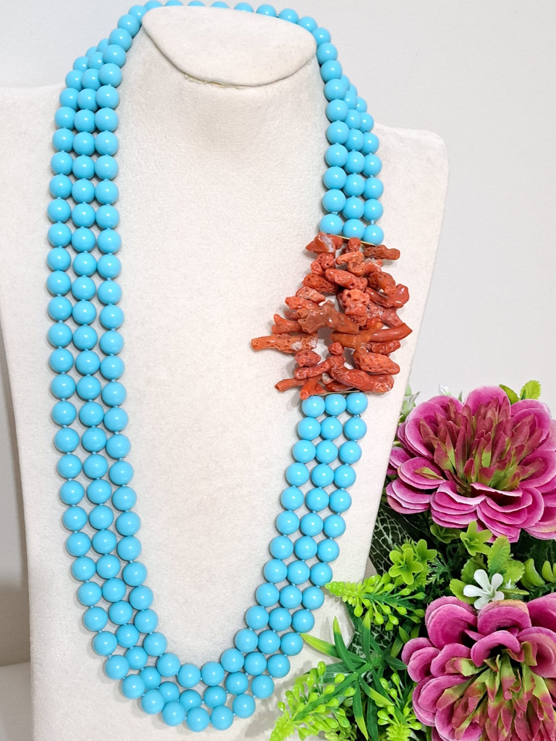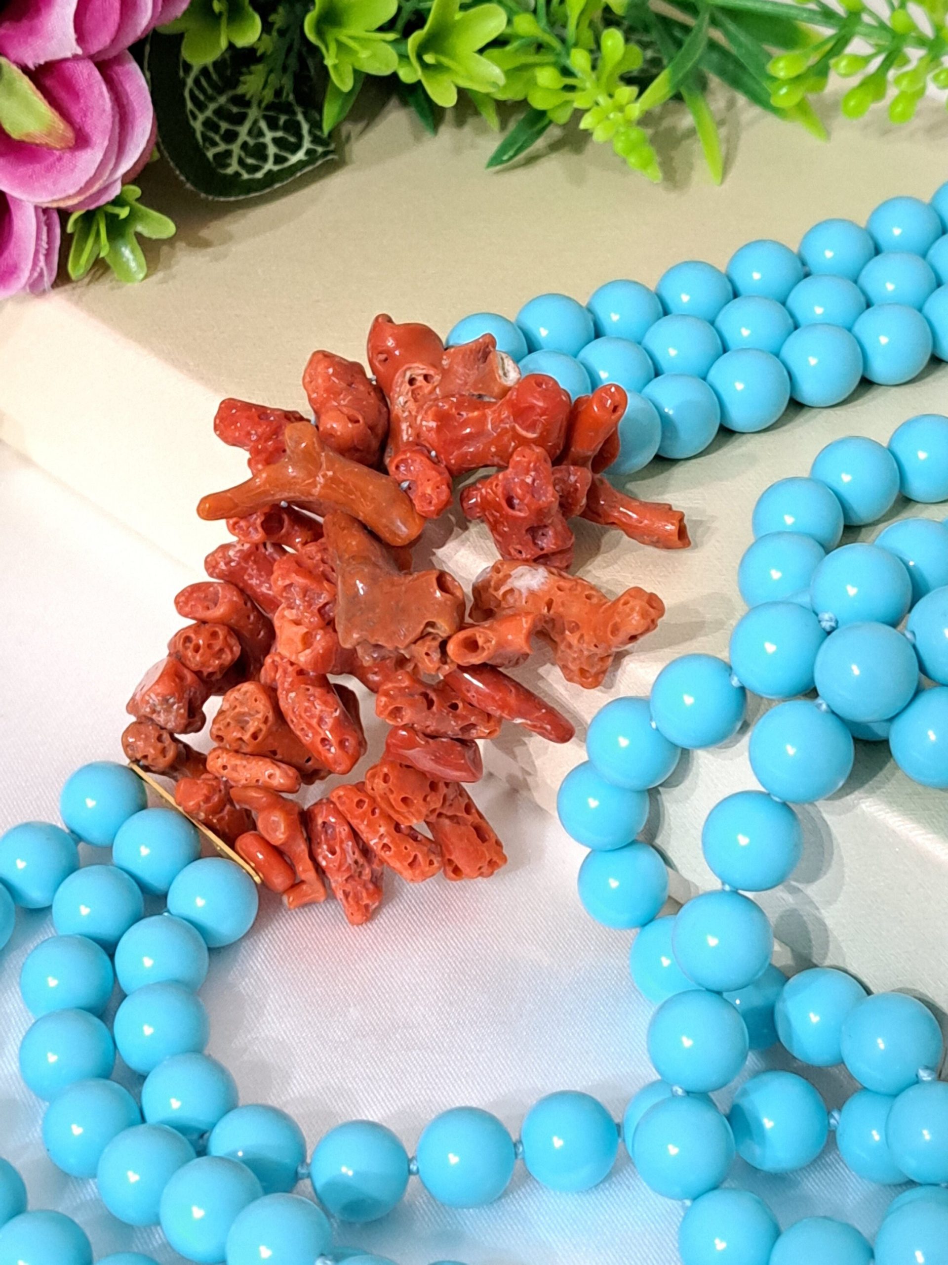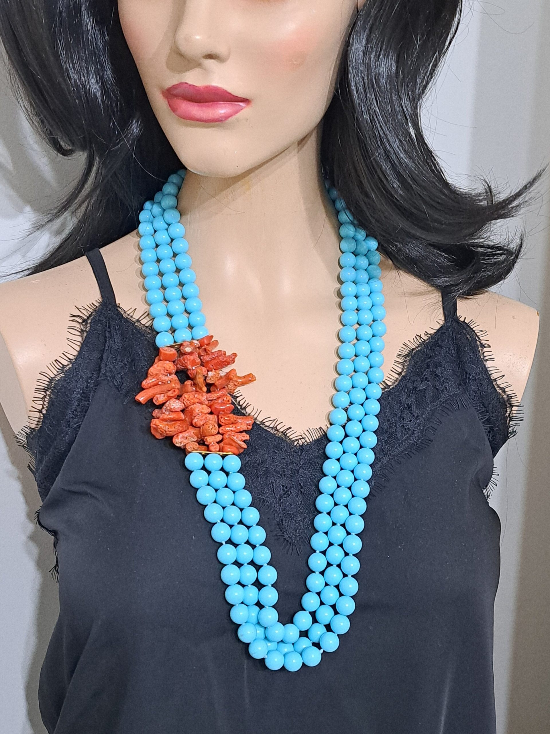 Collana maxi annodata a mano con 3 fili perle pasta di turchese imitazione 12 mm e rametti corallo rosso mediterraneo naturale , lunghezza 70 cm.