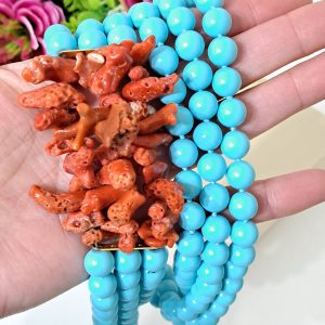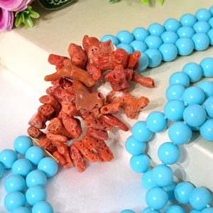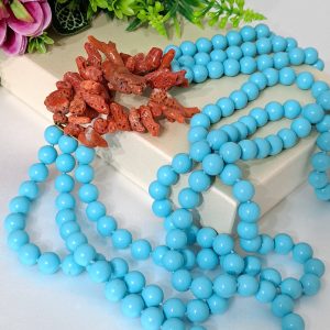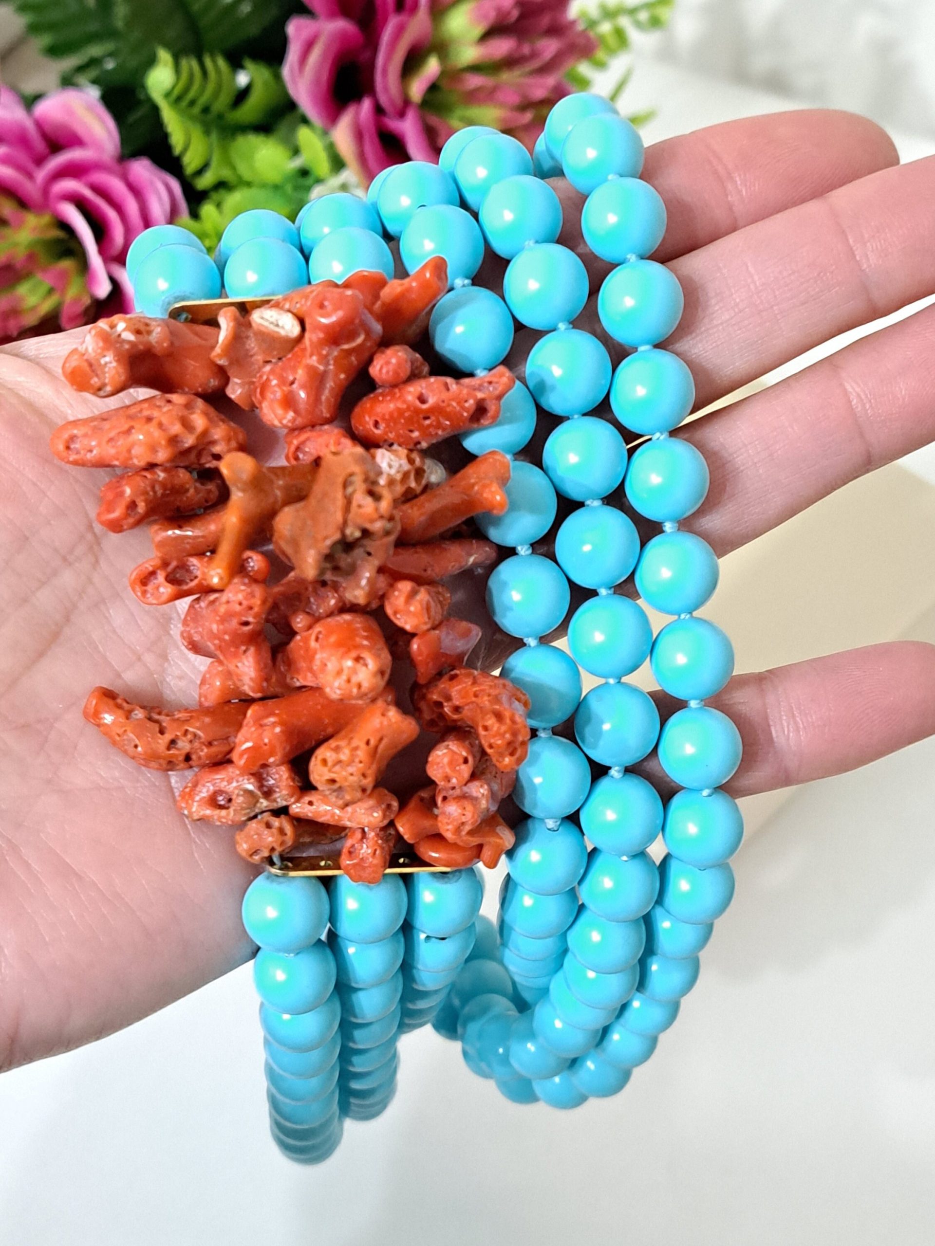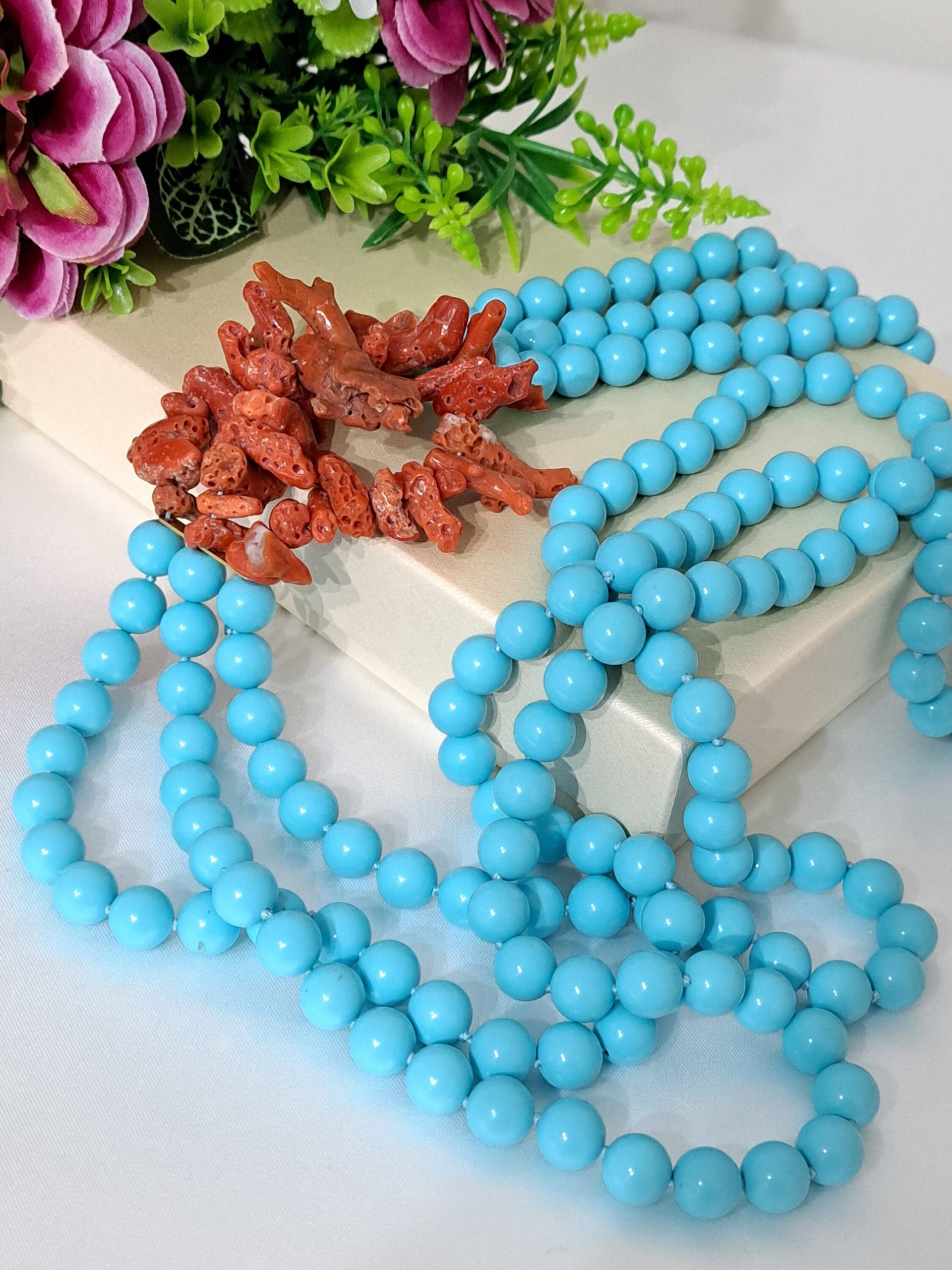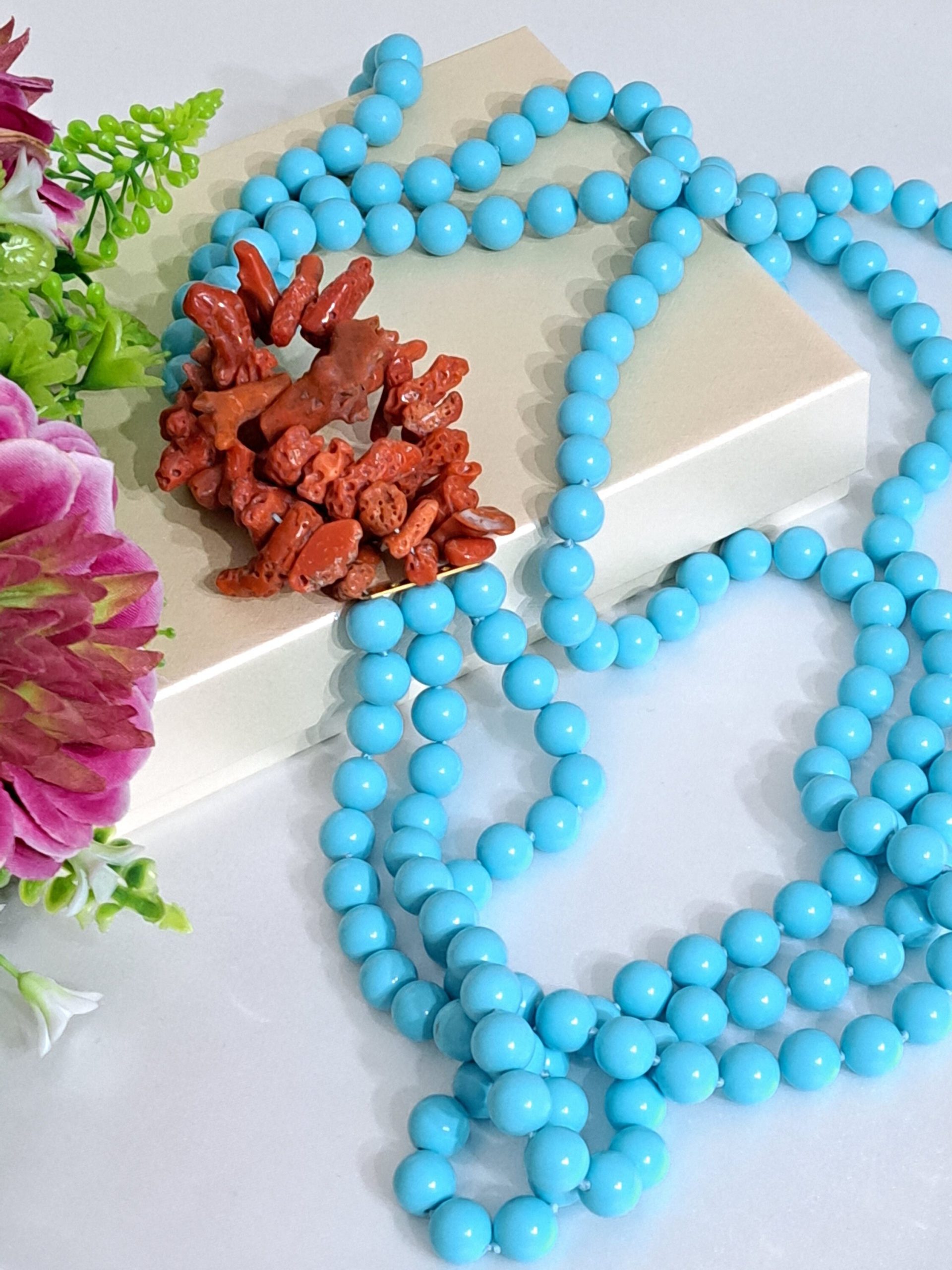 Collana maxi annodata a mano con 3 fili perle pasta di turchese imitazione 12 mm e rametti corallo rosso mediterraneo naturale , lunghezza 70 cm.