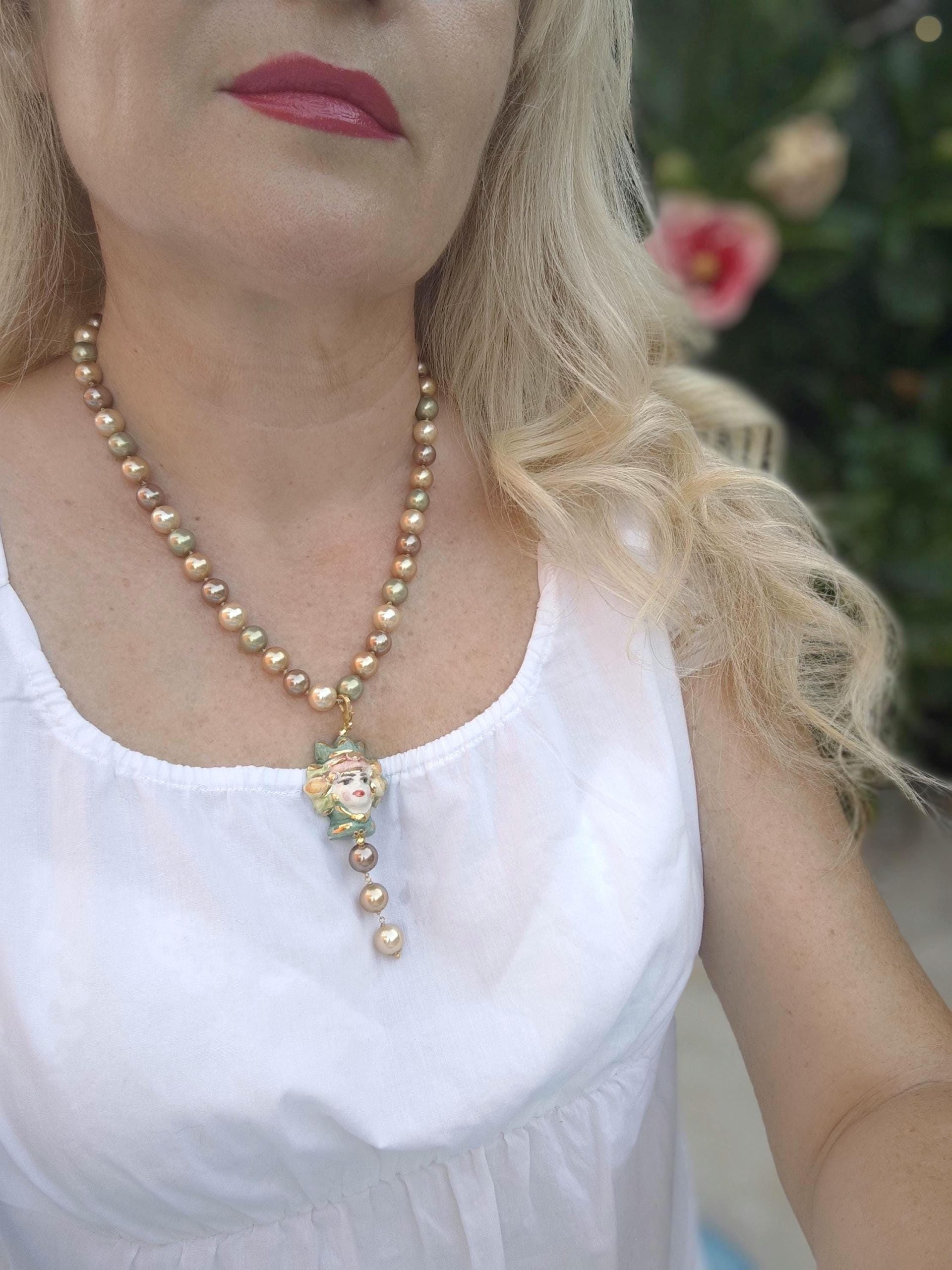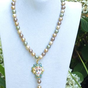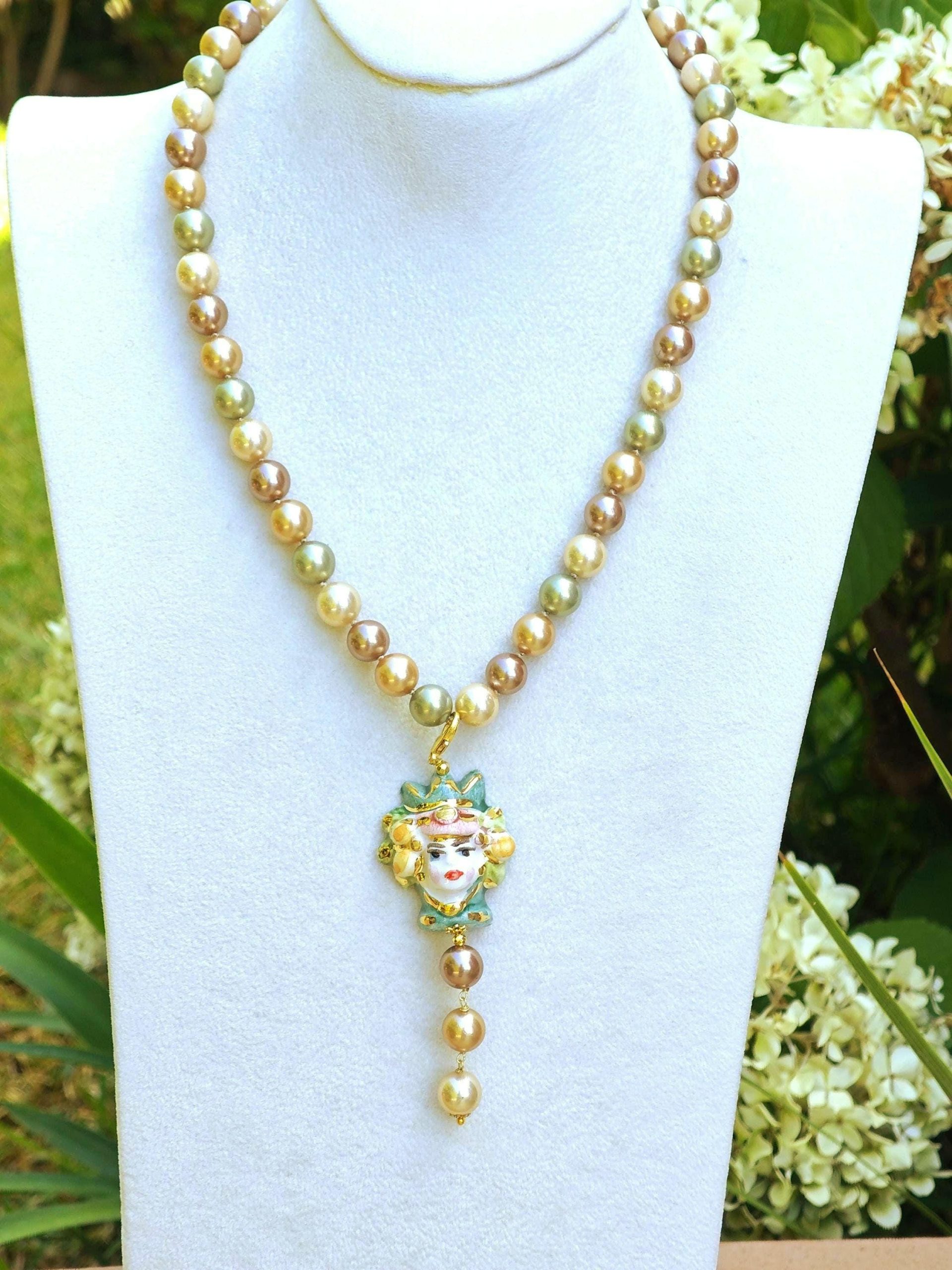 Collana girocollo annodata a mano con perle di Majorca imitazione verde e marrone 10 mm con pendente testa di moro donna in ceramica Caltagirone realizzata e dipinta a mano con applicazioni foglia oro 22 kt, 3,5 cm dimensioni.