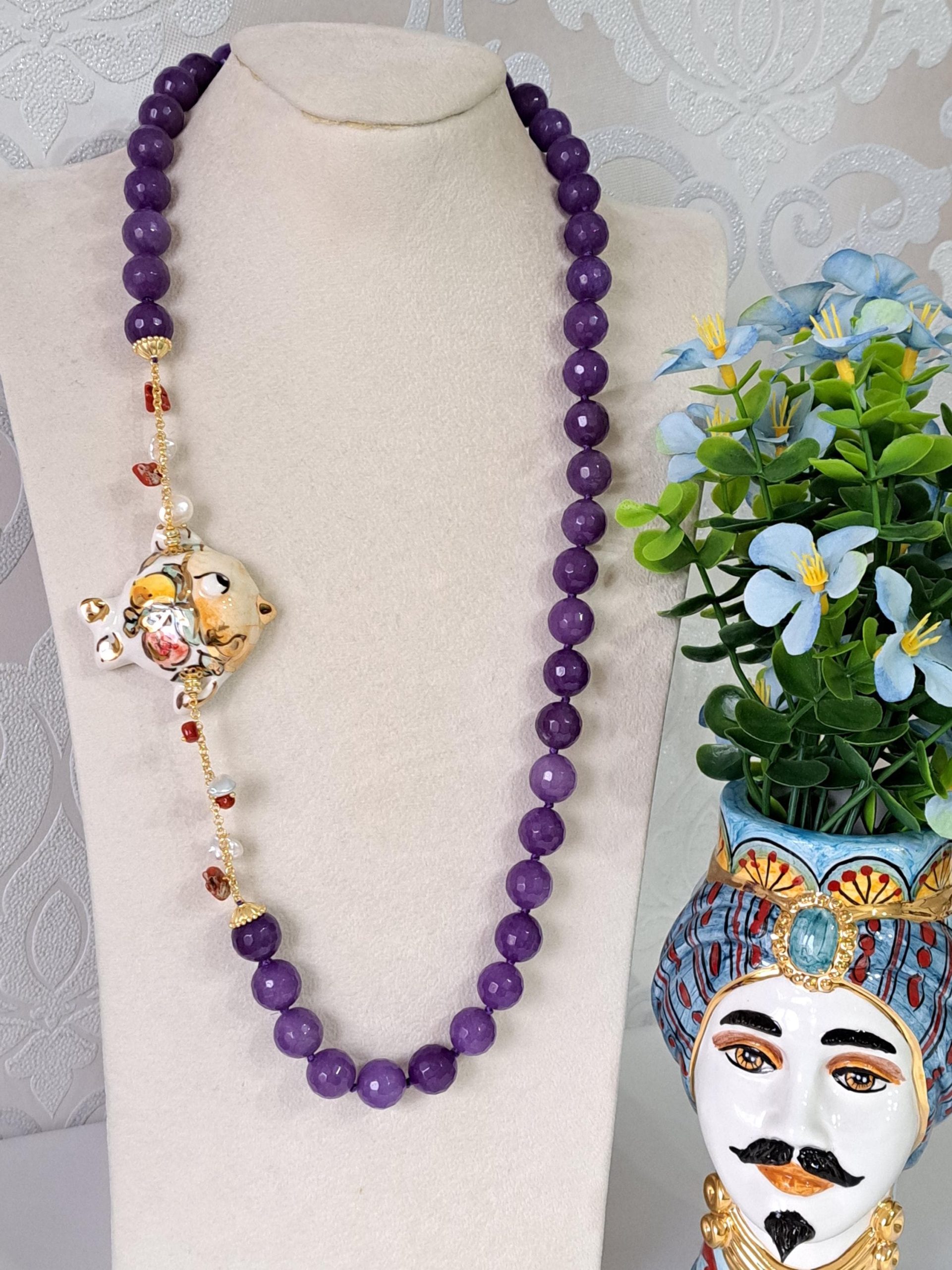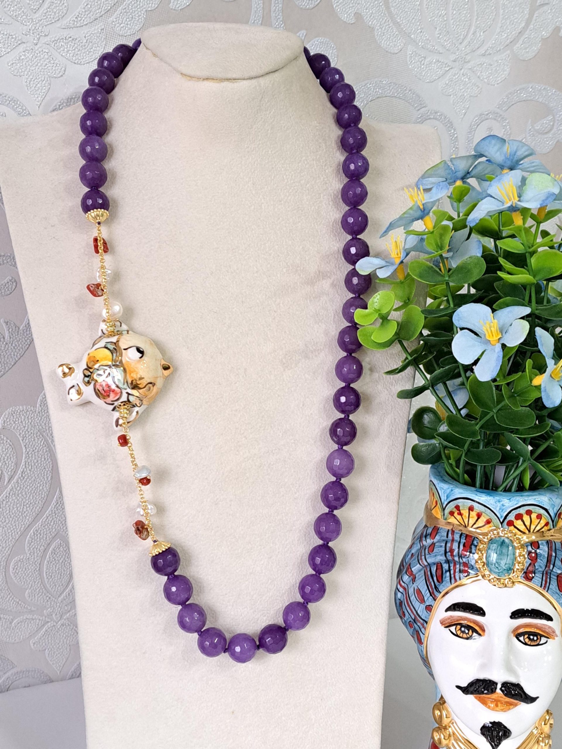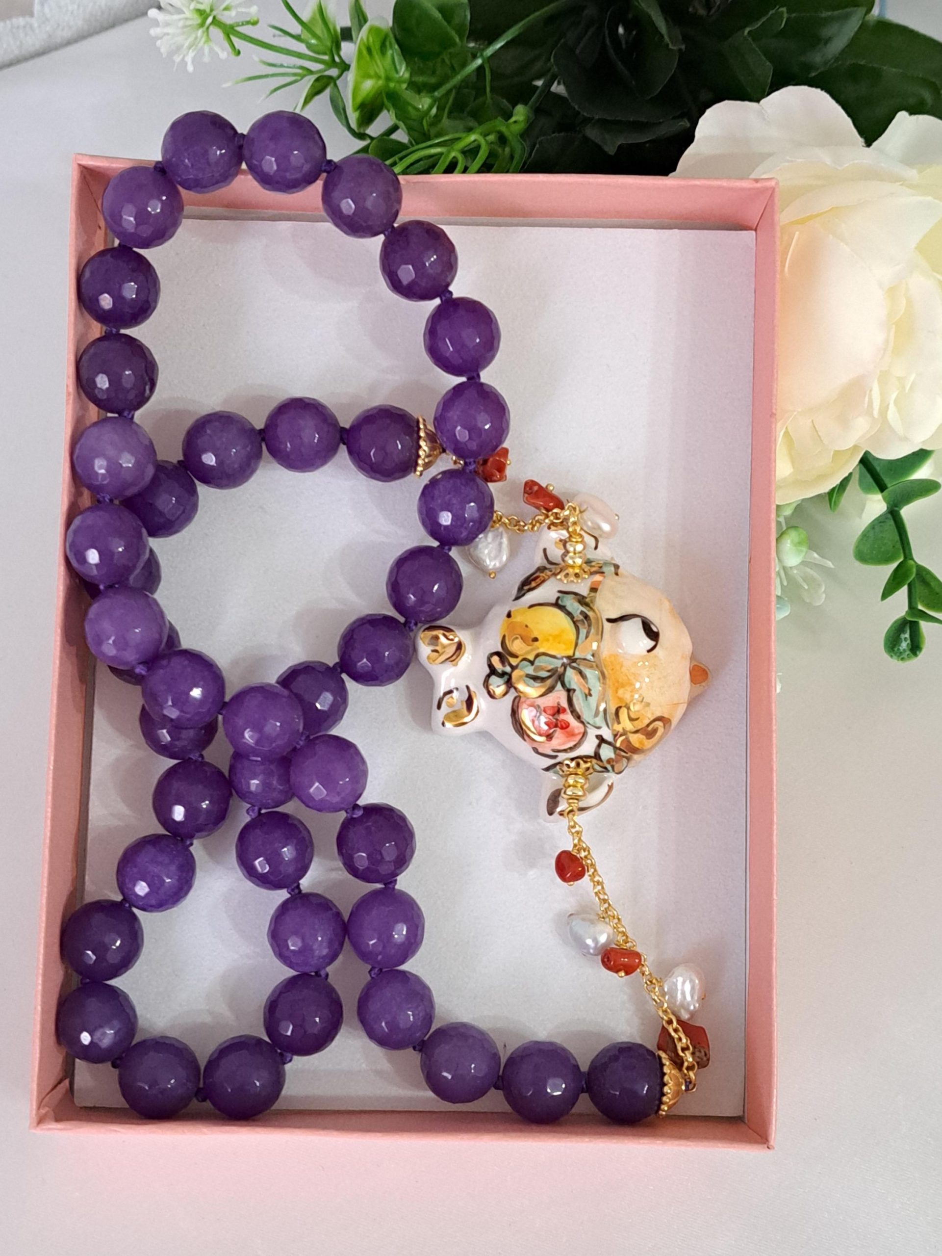 Collana pesce ceramica Caltagirone, collana pietre agata viola, collana siciliana