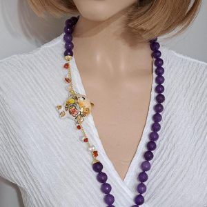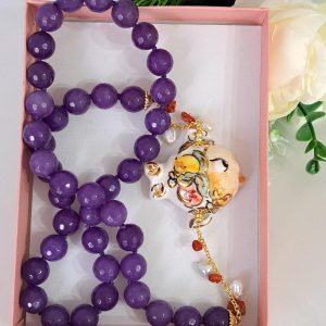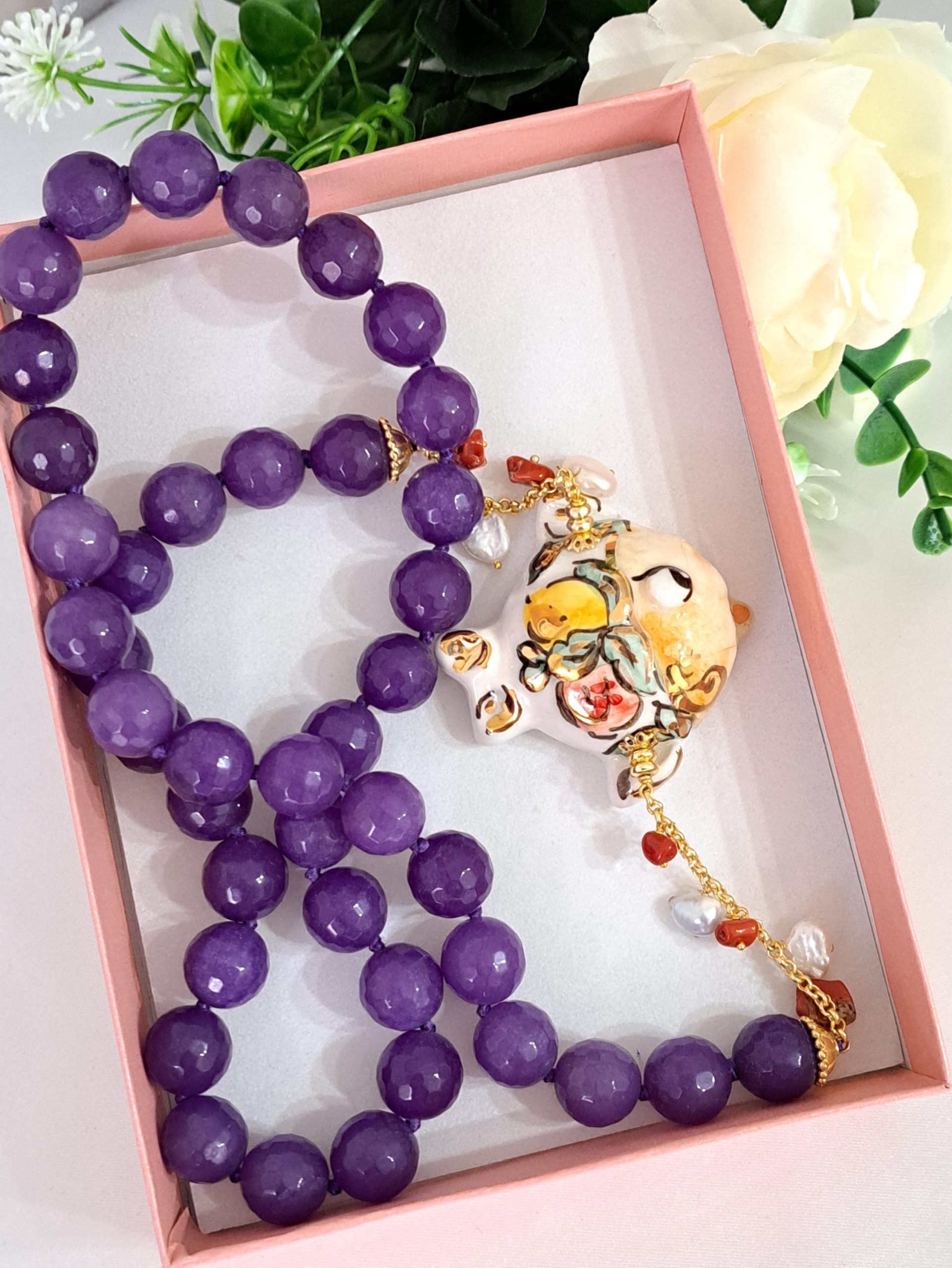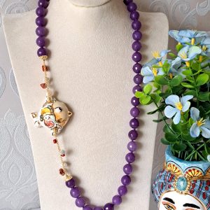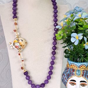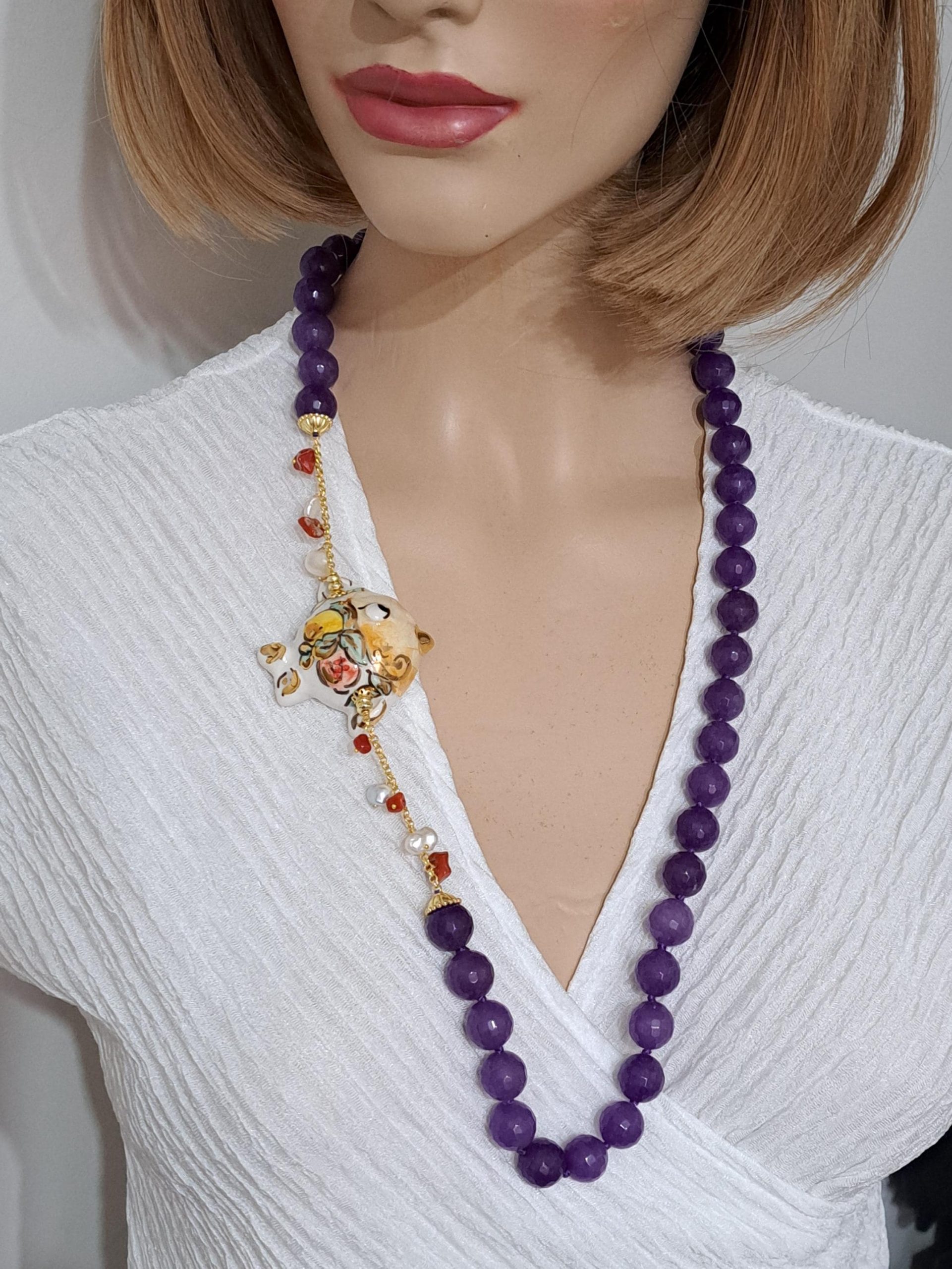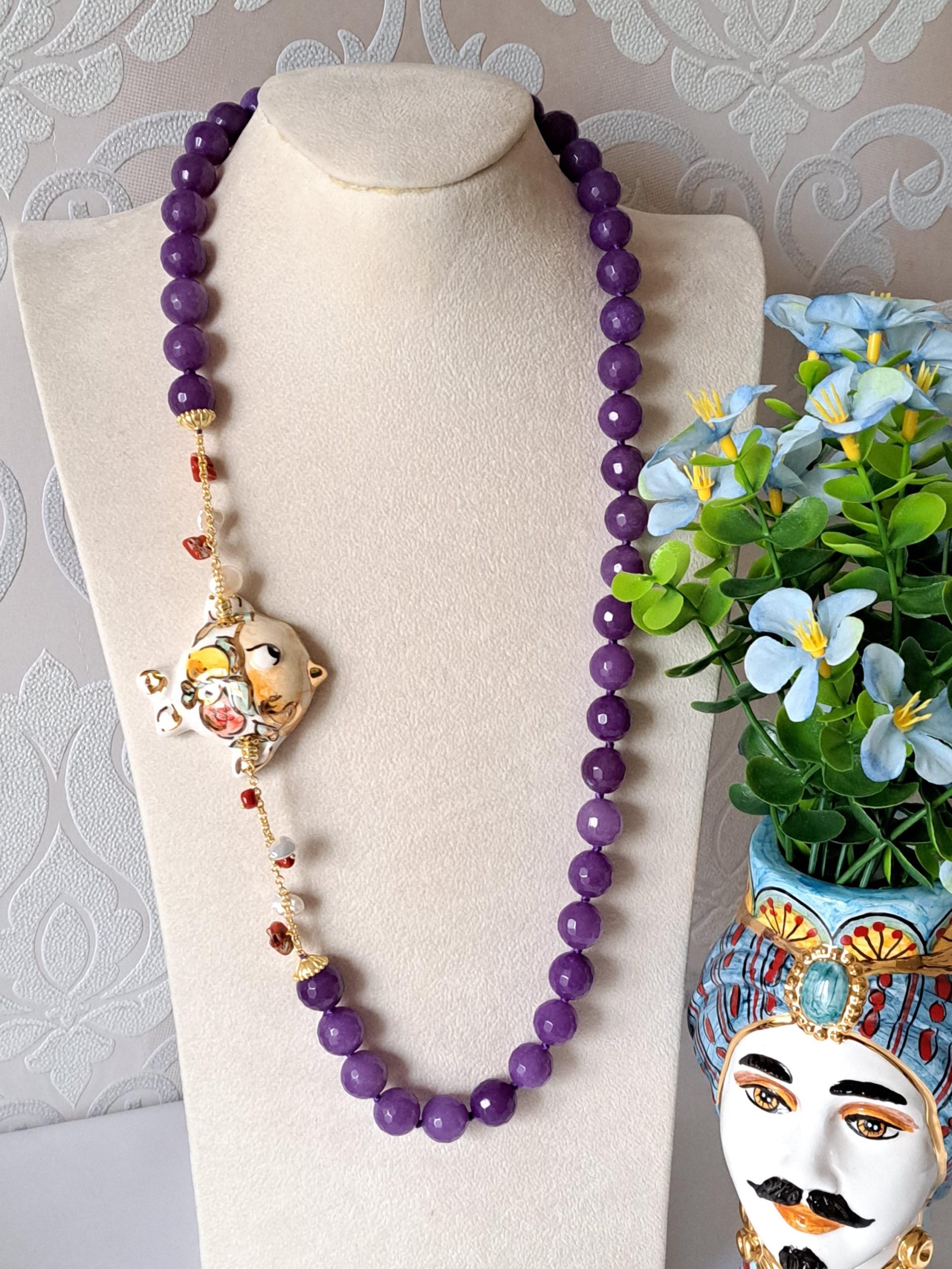 Collana pesce ceramica Caltagirone, collana pietre agata viola, collana siciliana