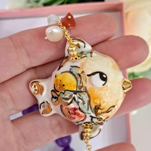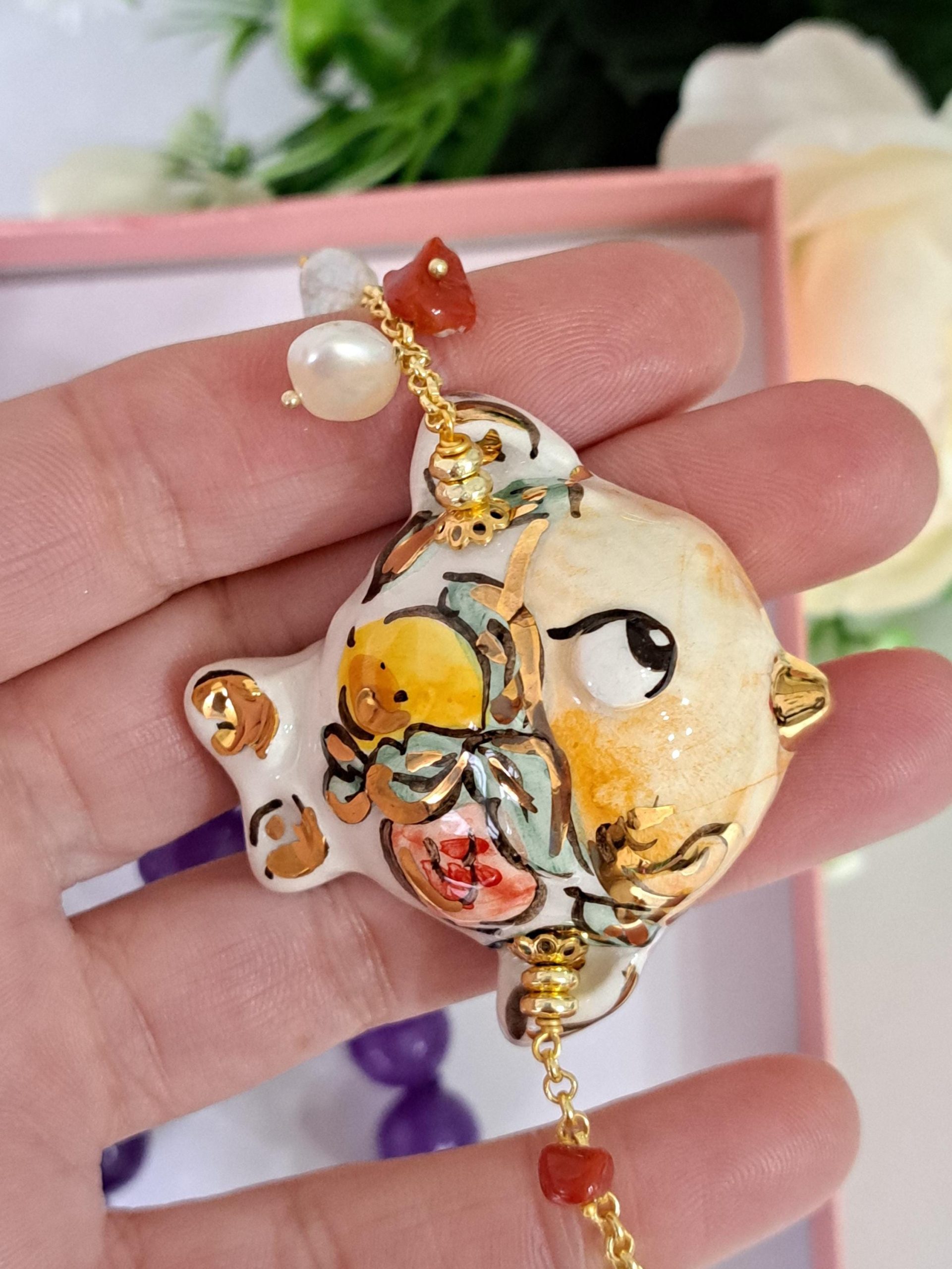 Collana annodata a mano con pietre dure sfaccettate agata viola 12 mm e con pesce in ceramica Caltagirone dipinta e realizzata a mano, con applicazioni foglia oro 22 kt , 5 cm dimensioni, perle bianche naturali e corallo rosso mediterraneo.