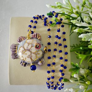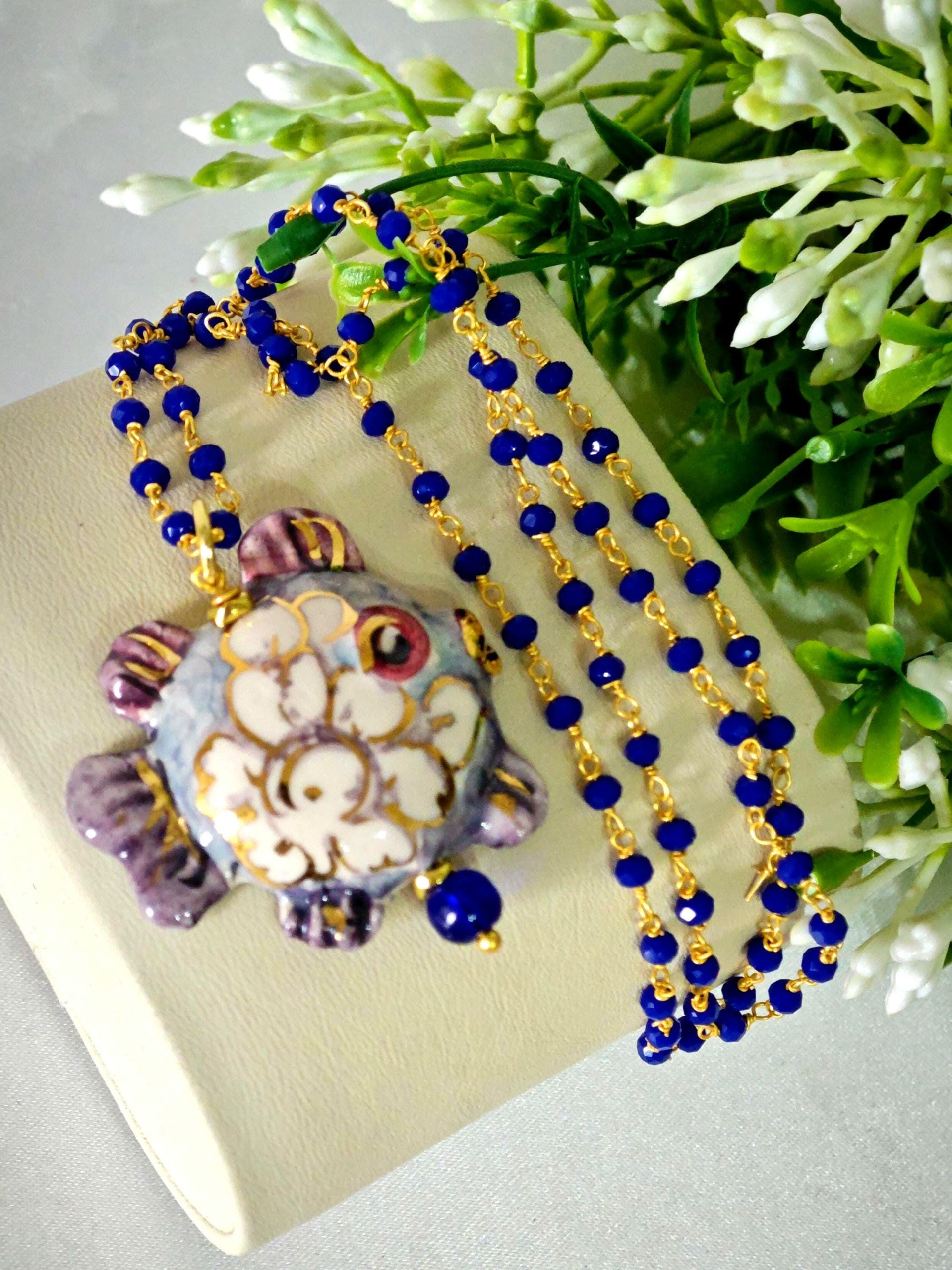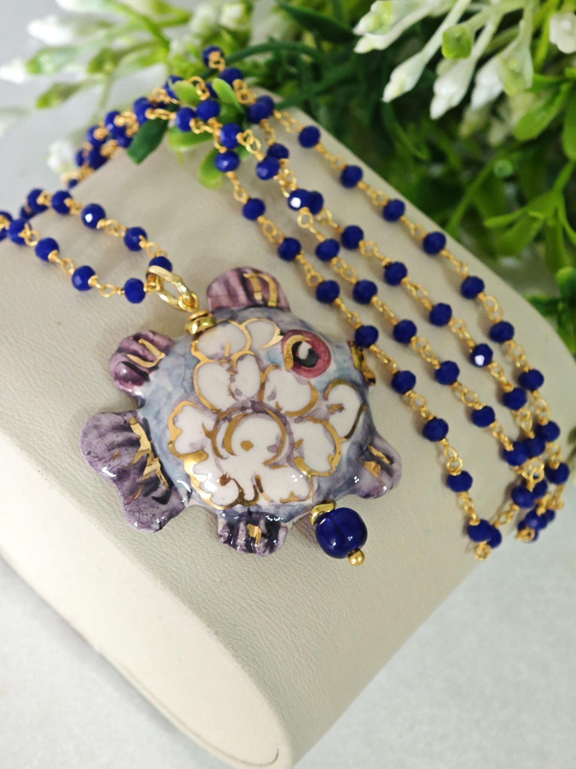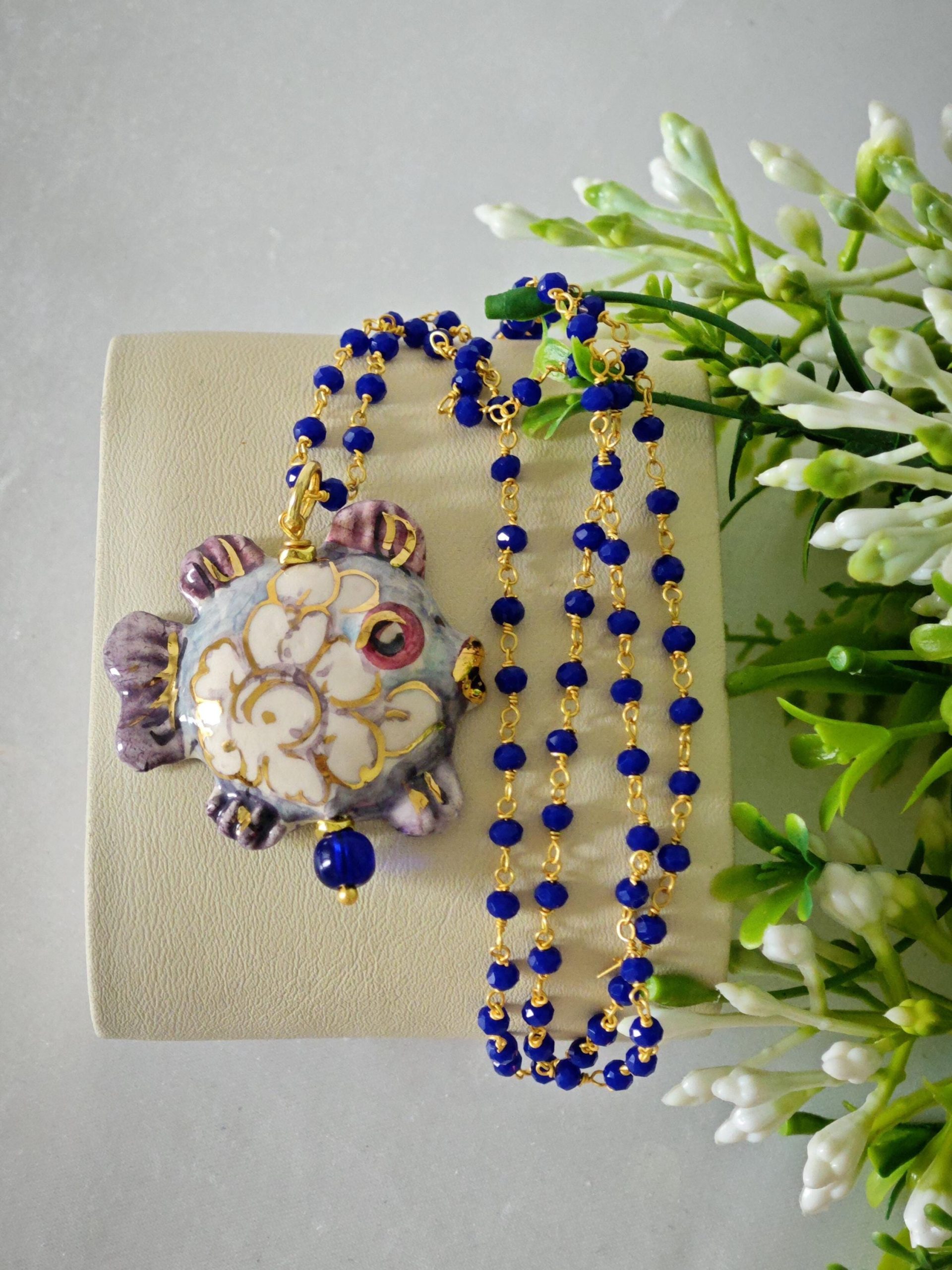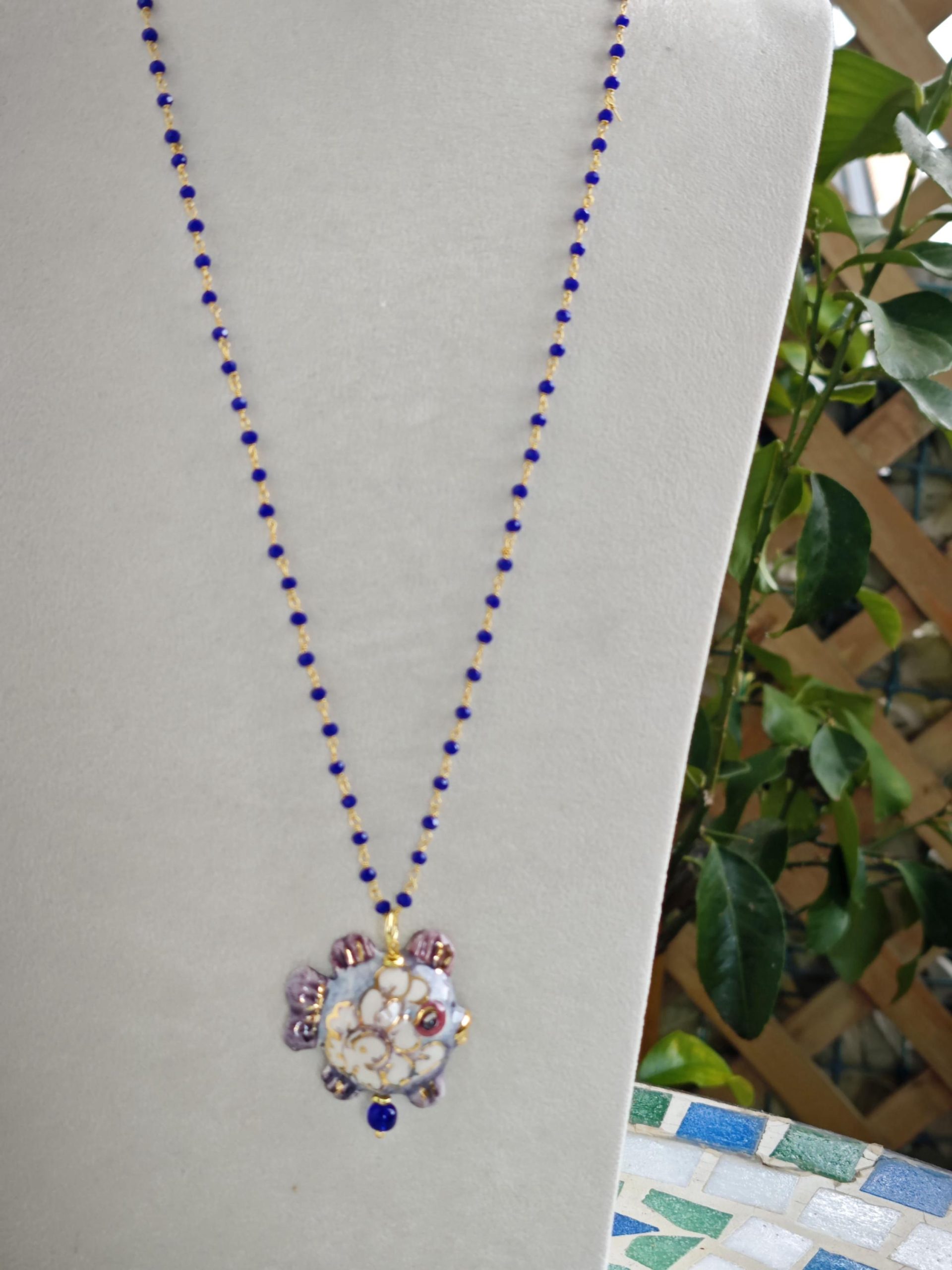 Collana catena a rosario con cristalli blu con pendente pesciolino in ceramica di Caltagirone realizzata e dipinta a mano, 3,5×2,5 cm dimensioni .