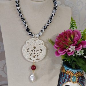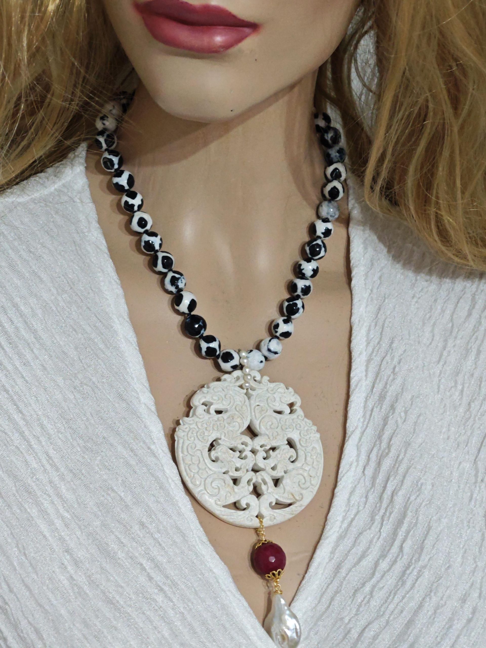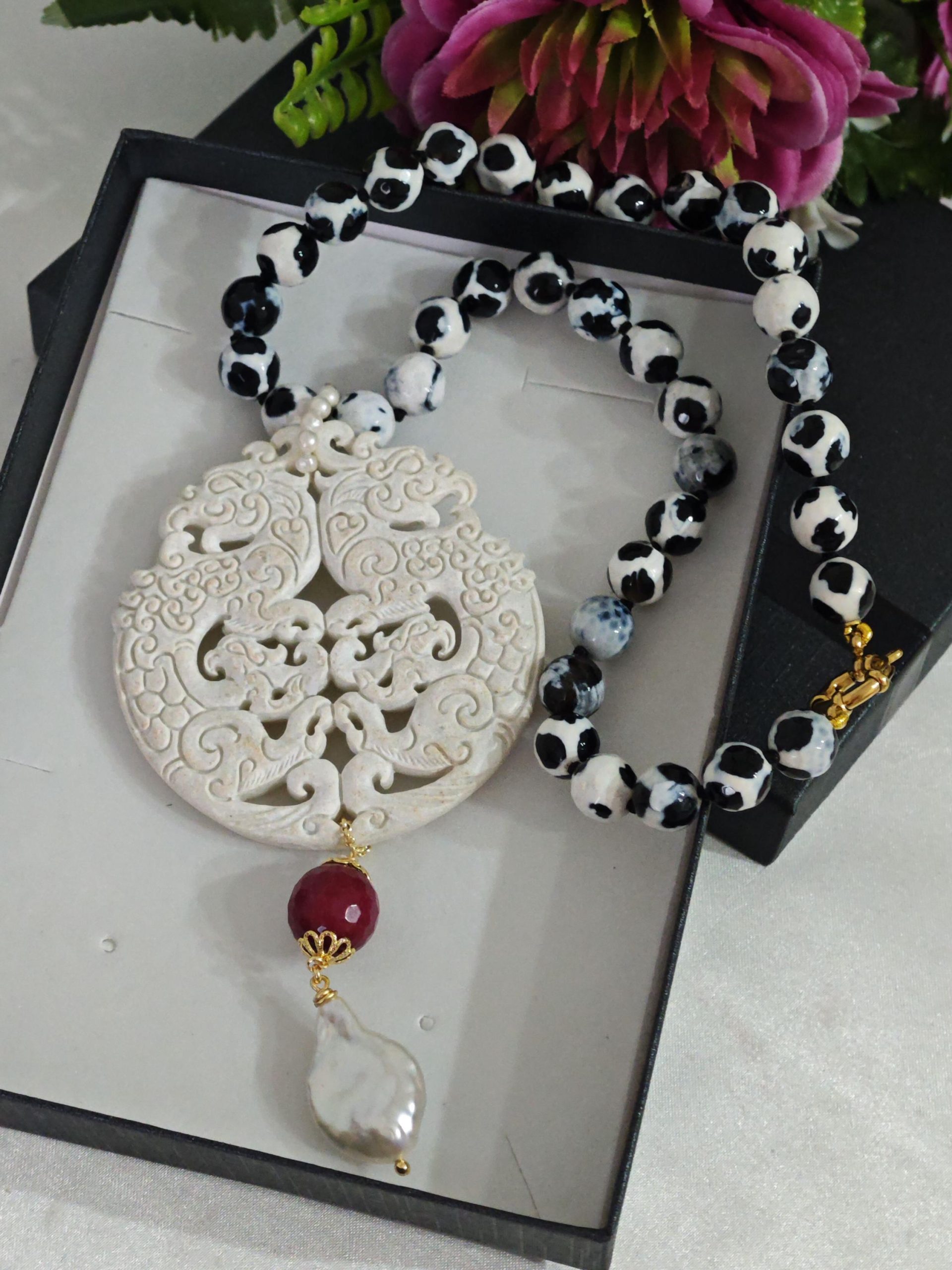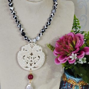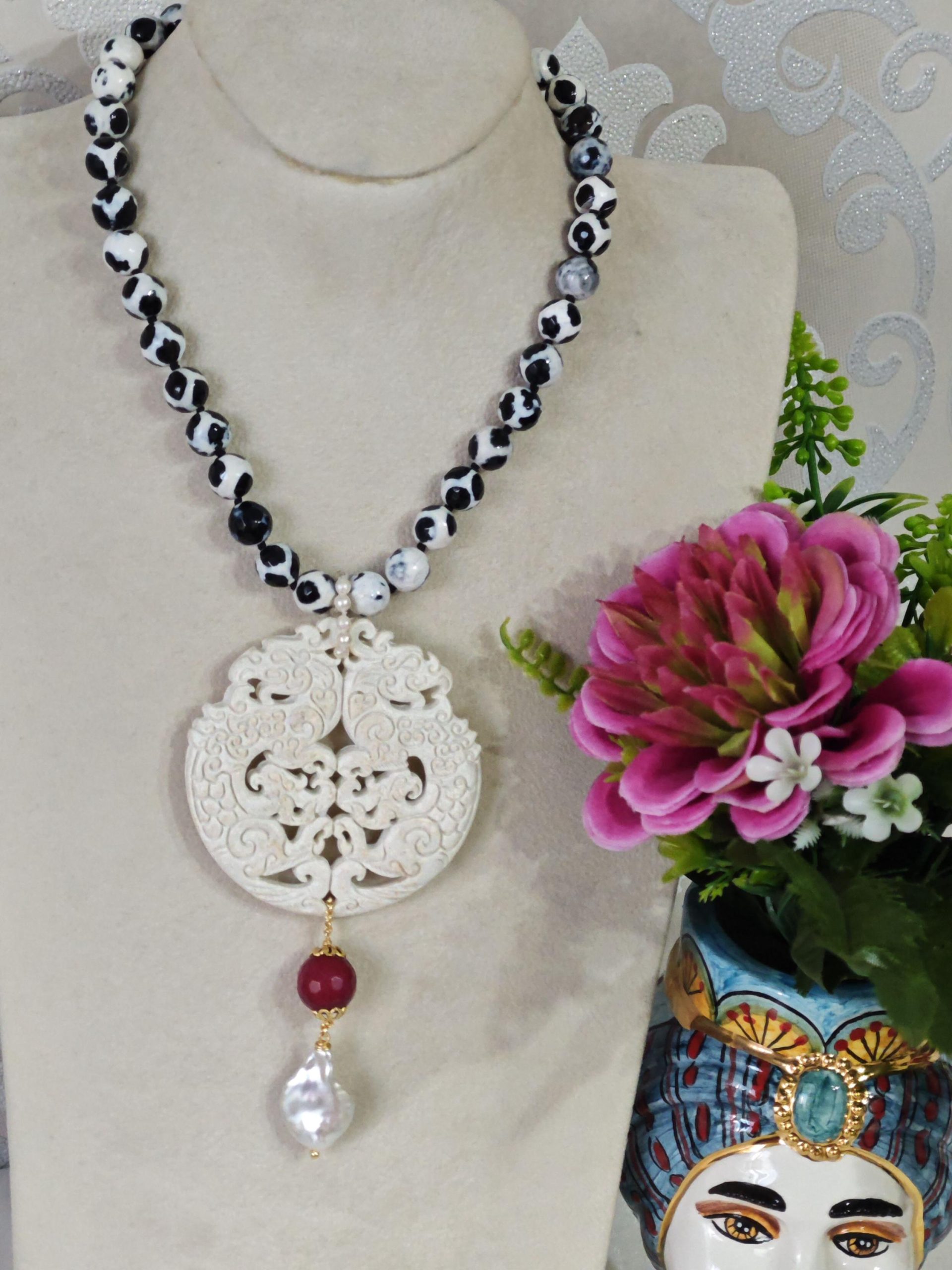 Collana pietre dure agata tibetana , perle bianche barocche e pendente mandala giada itagliata