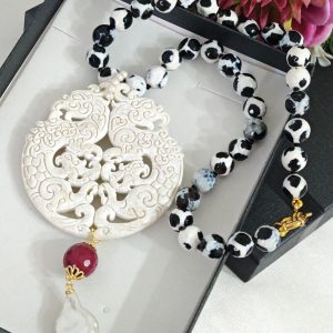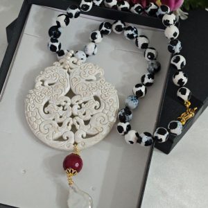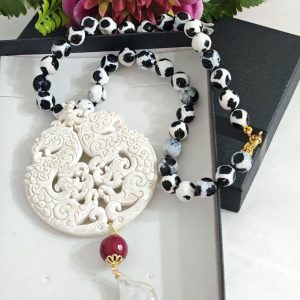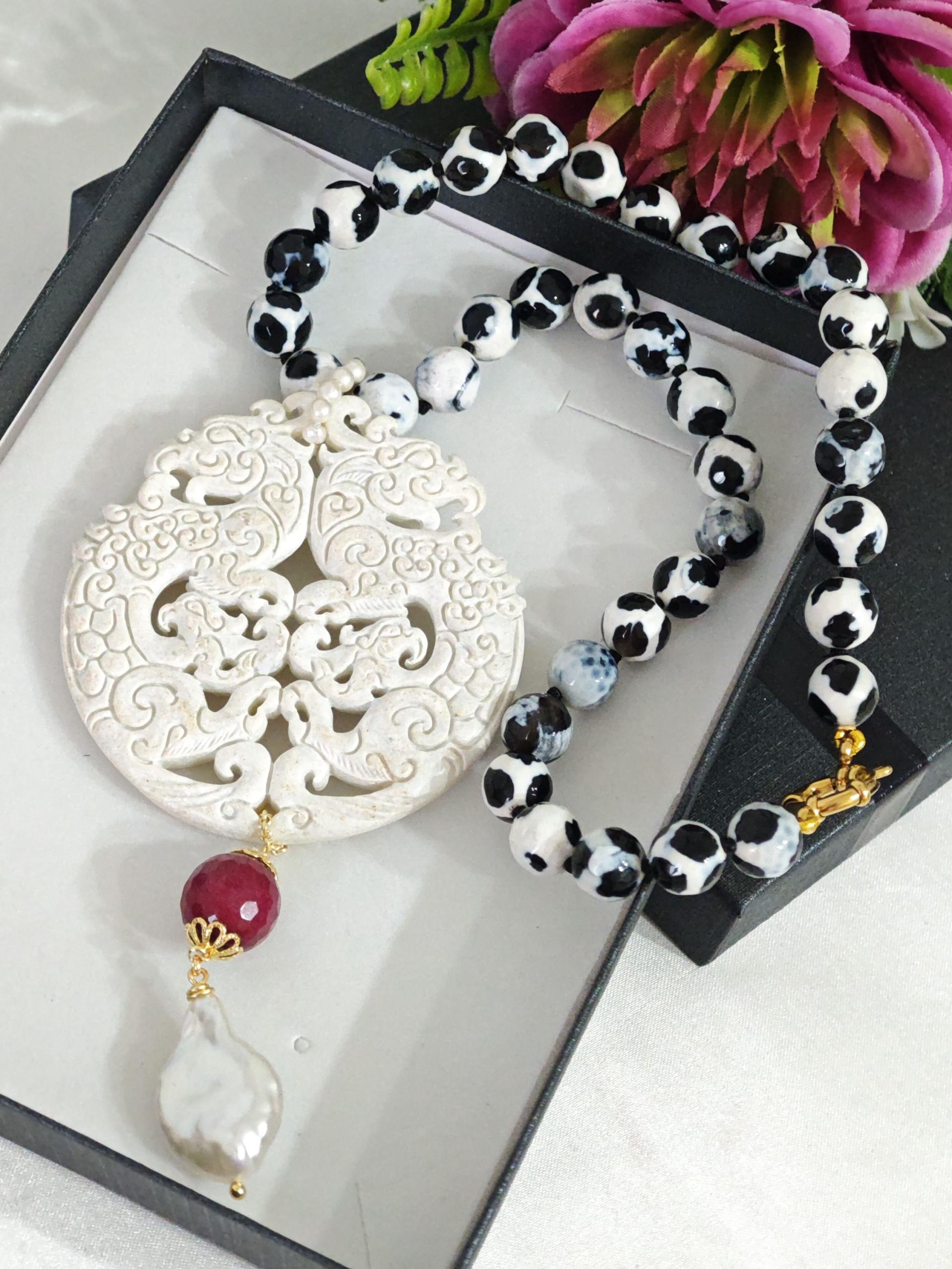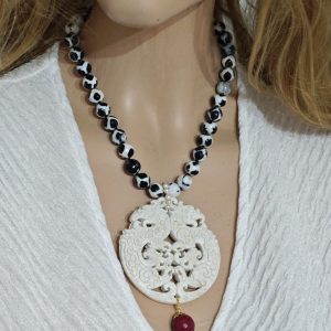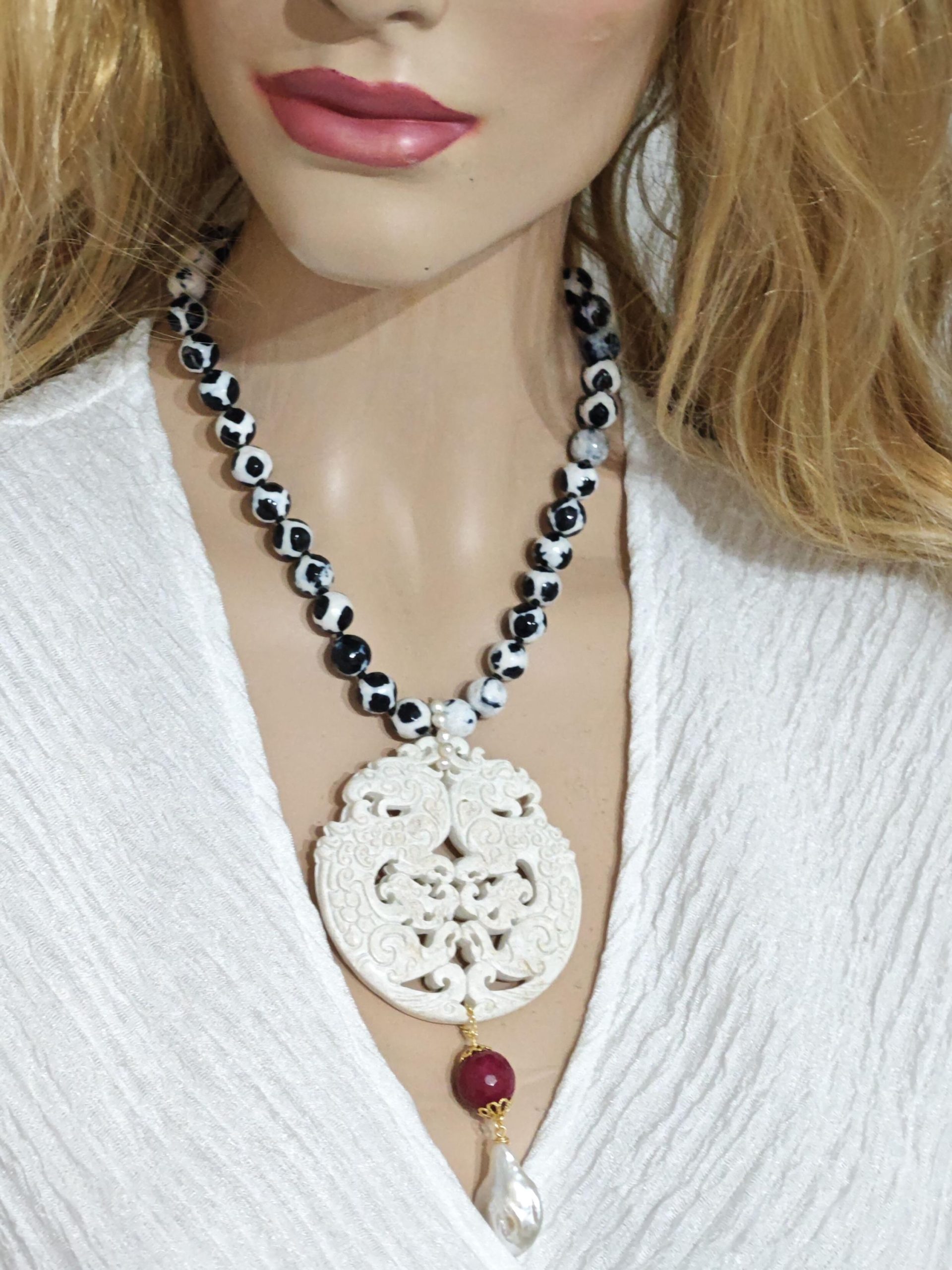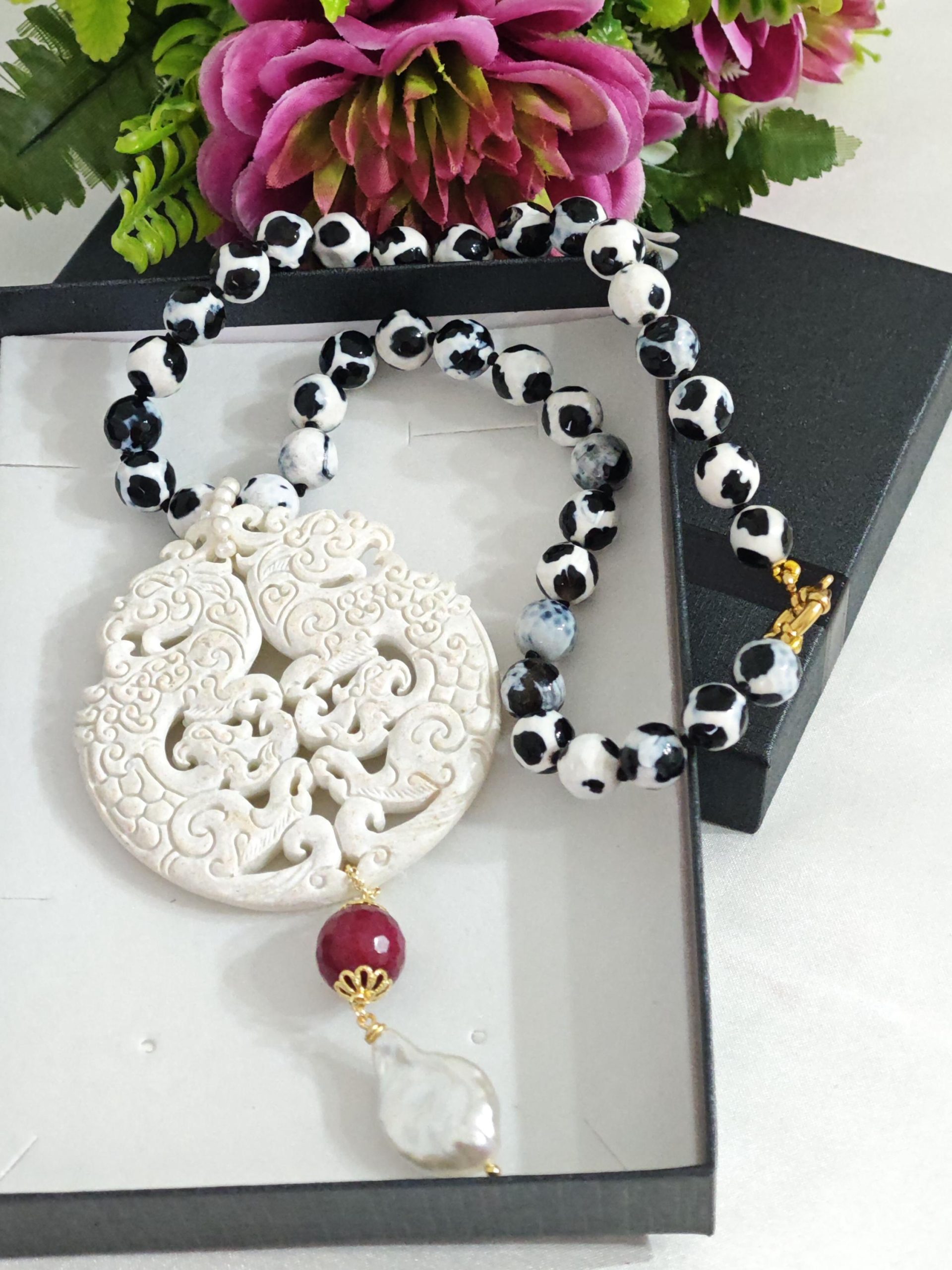 Collana pietre dure agata tibetana , perle bianche barocche e pendente mandala giada itagliata