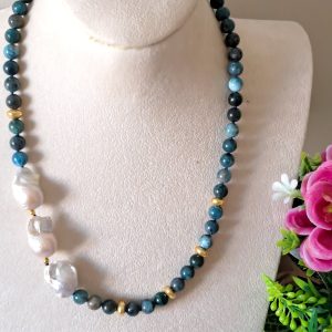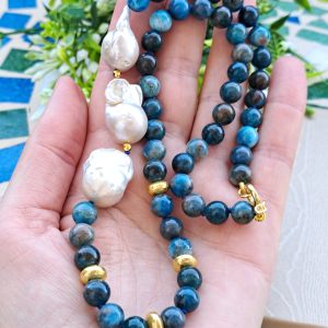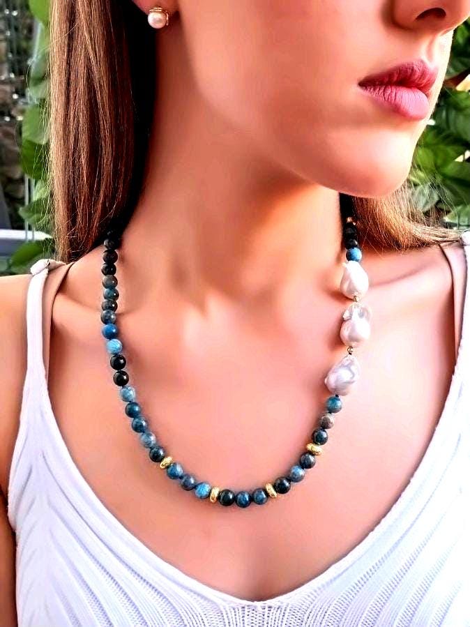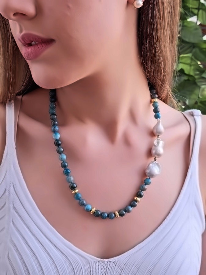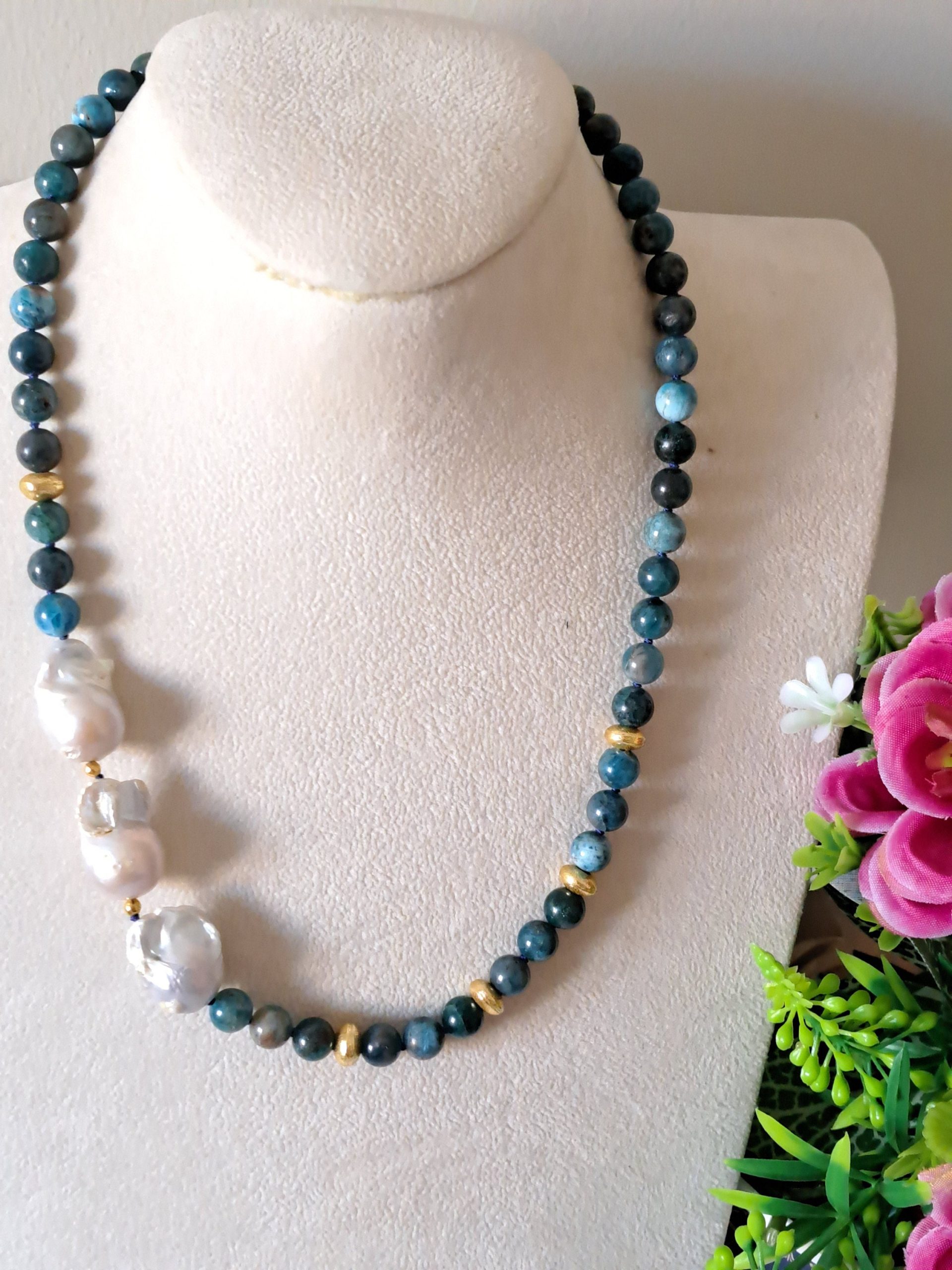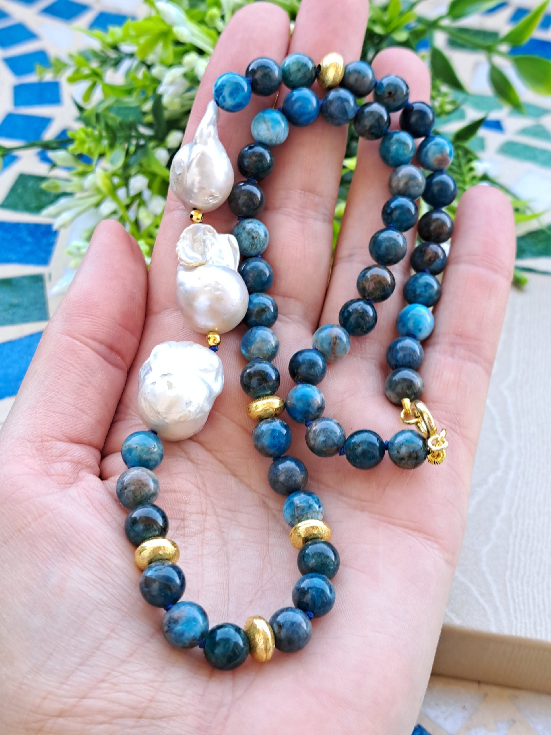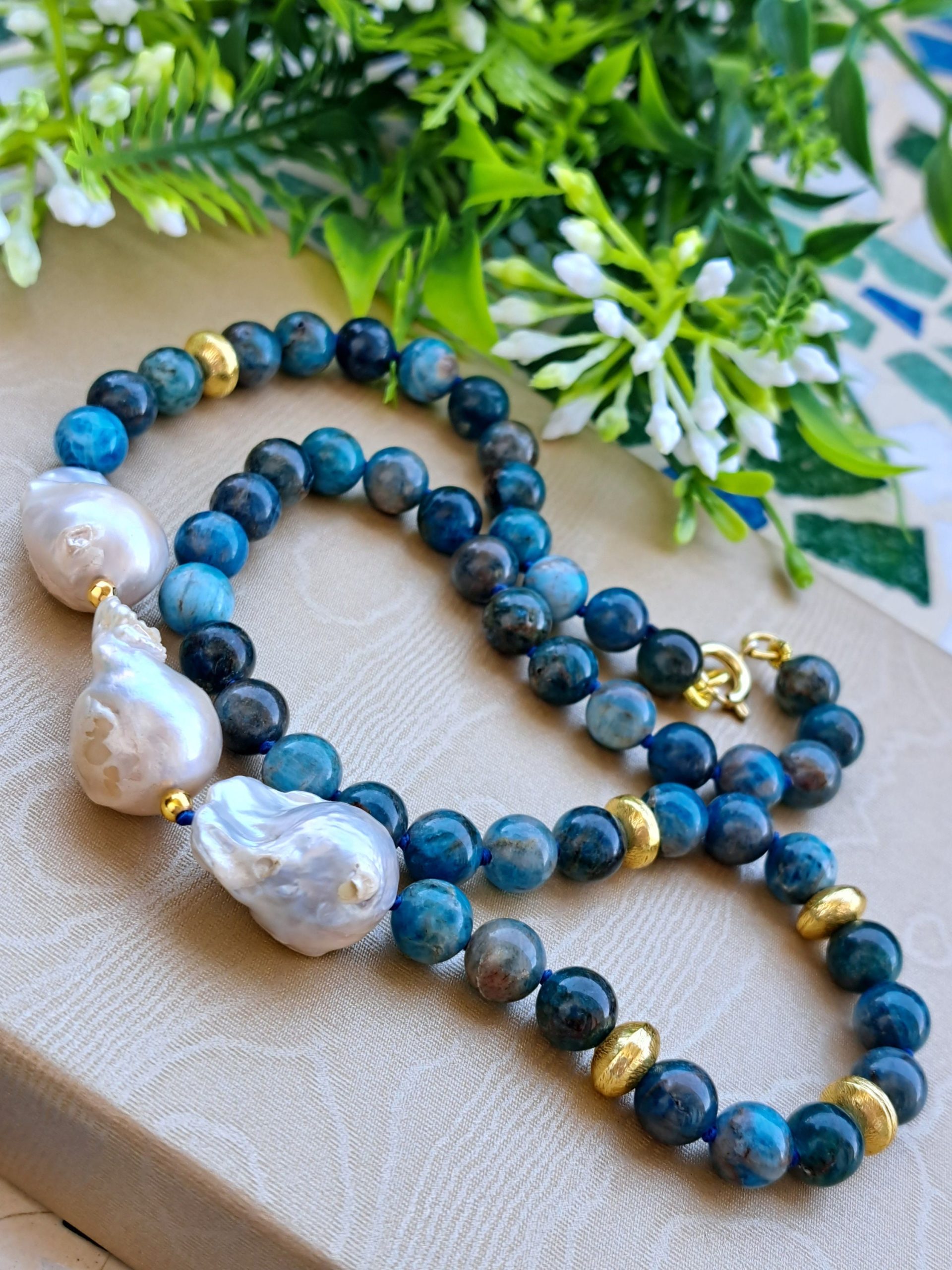 Collana pietre dure apatite blu e perle barocche bianche, collana girocollo